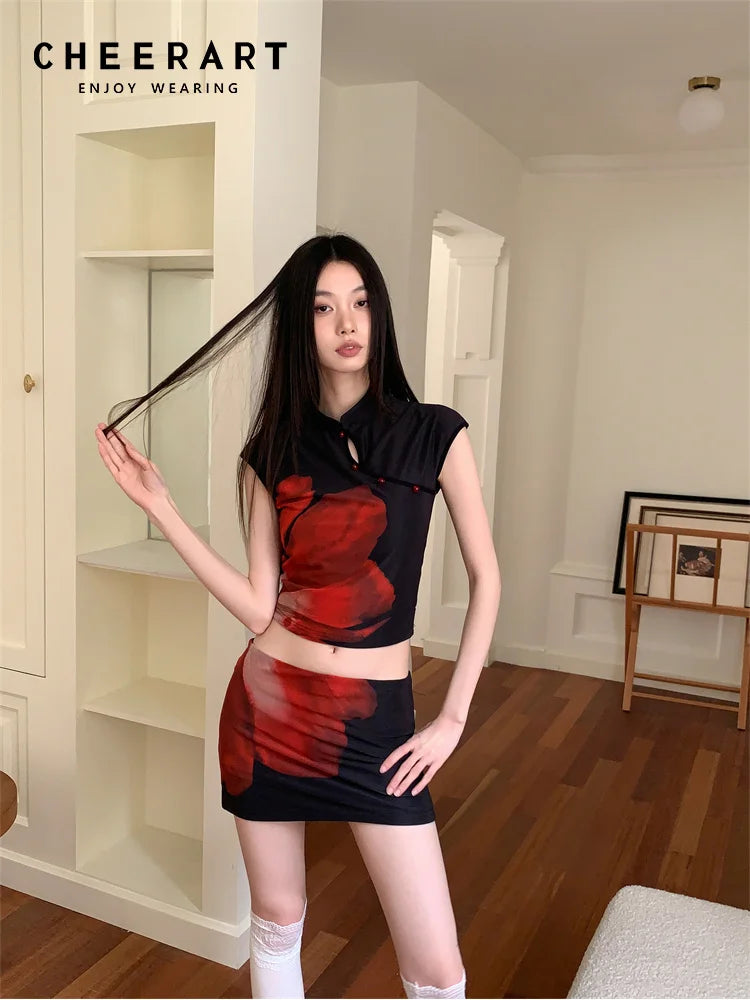 CHEERART Vintage Summer 2 Piece Sets Women Outfit Skirt And Top Cheongsam 2024 New In Matching Sets