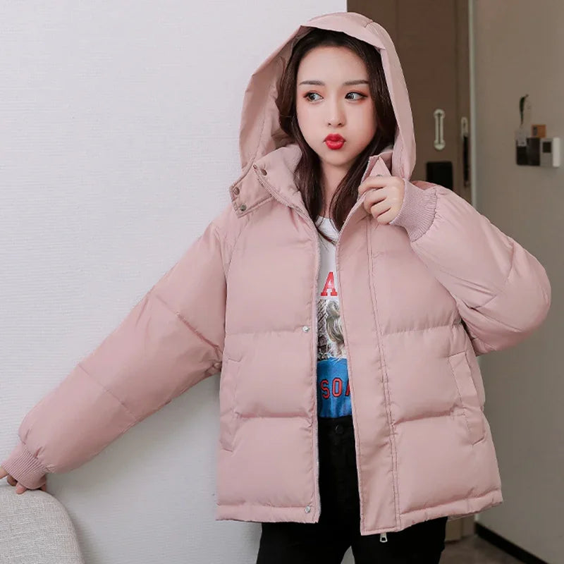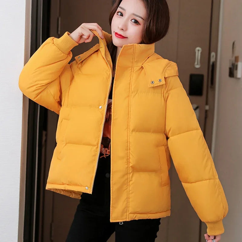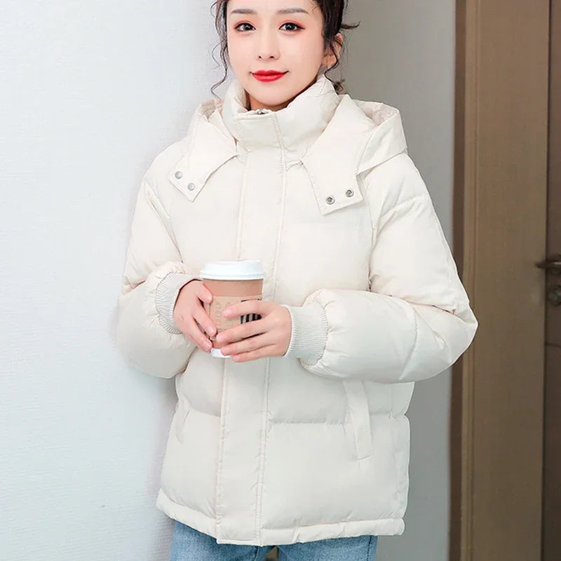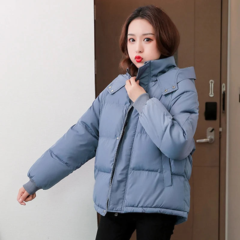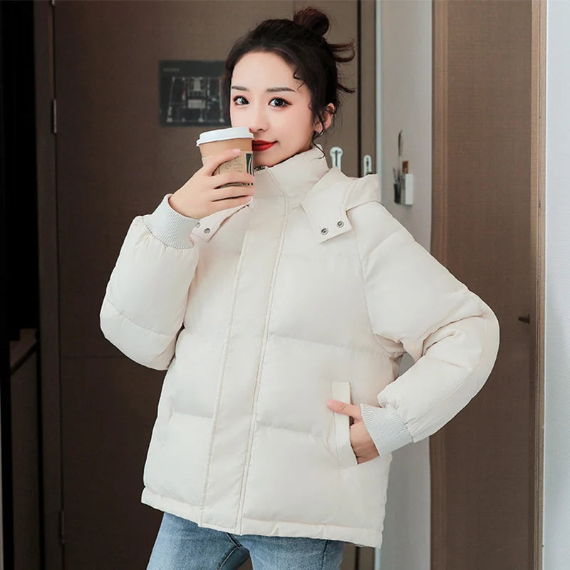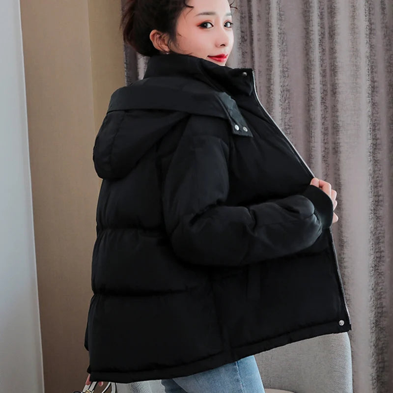 Concise Stand Collar Hooded Parkas Women Winter Button Zipper Up Cotton Jacket