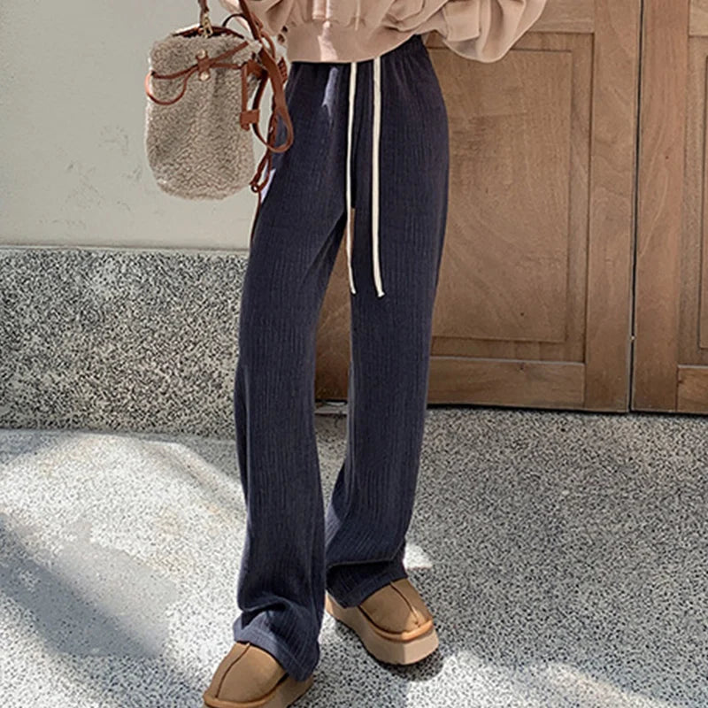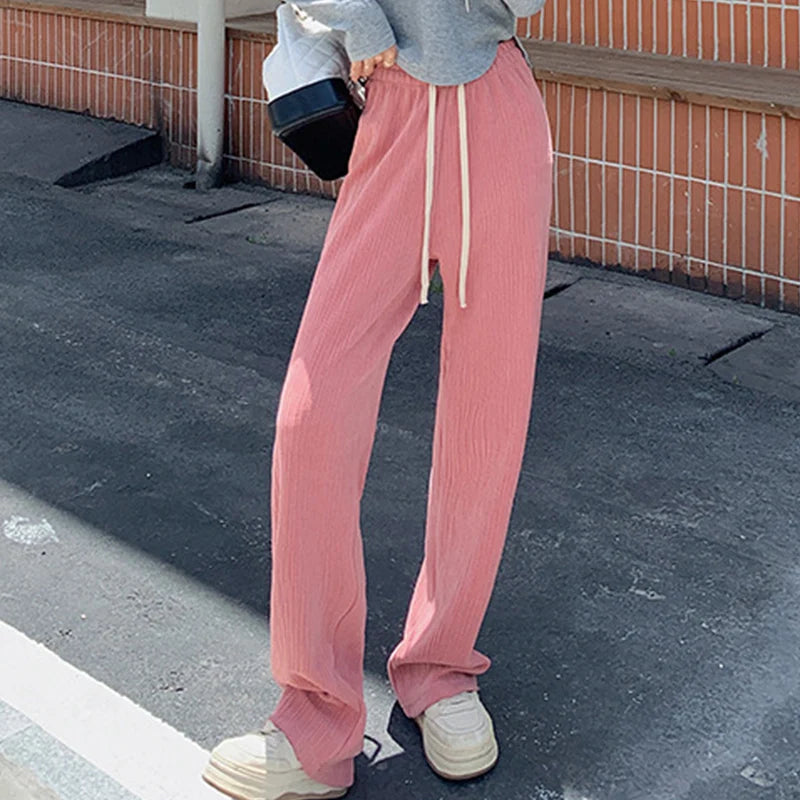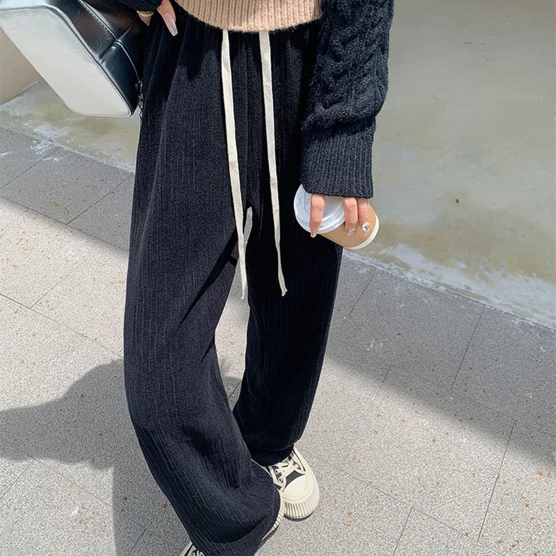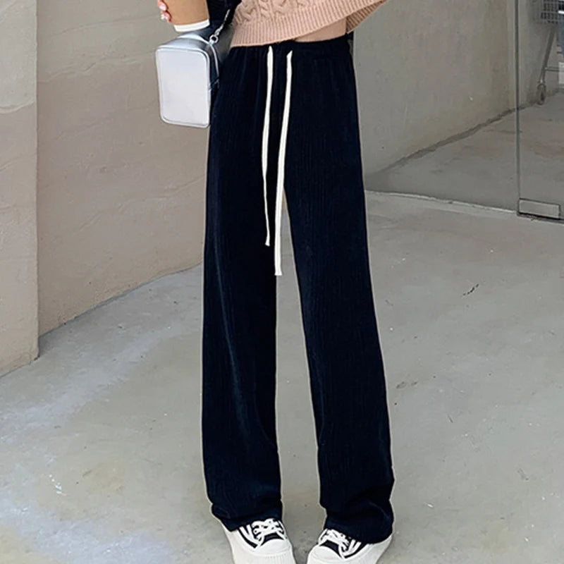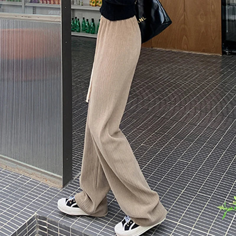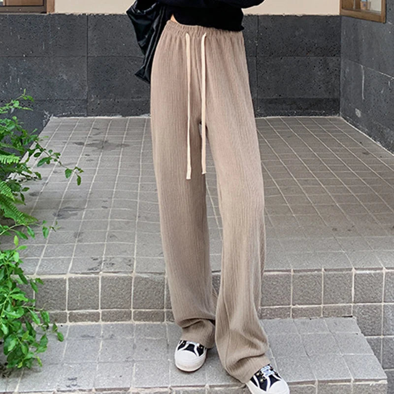 Drawstring Elastic Waist Trousers Women Spring Autumn High Waist Wide Leg