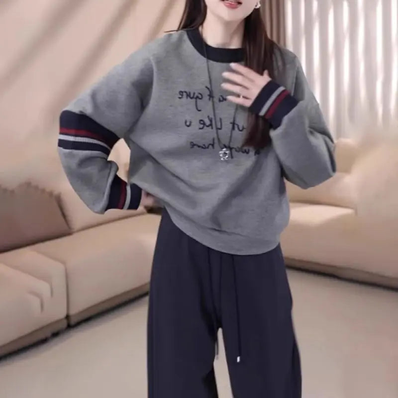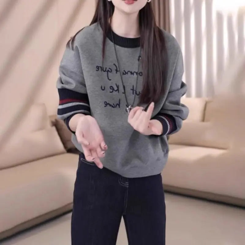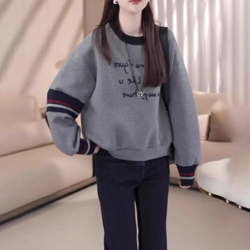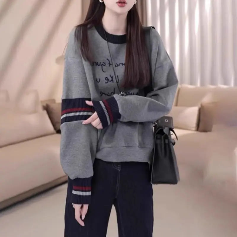 Elegant Gray Womens Hooded Sweatshirt Casual Loose Fit Slimming Top For Fall