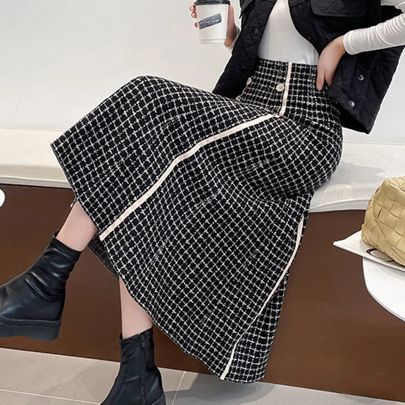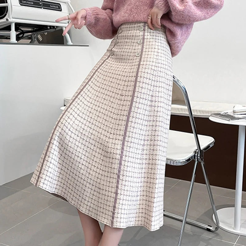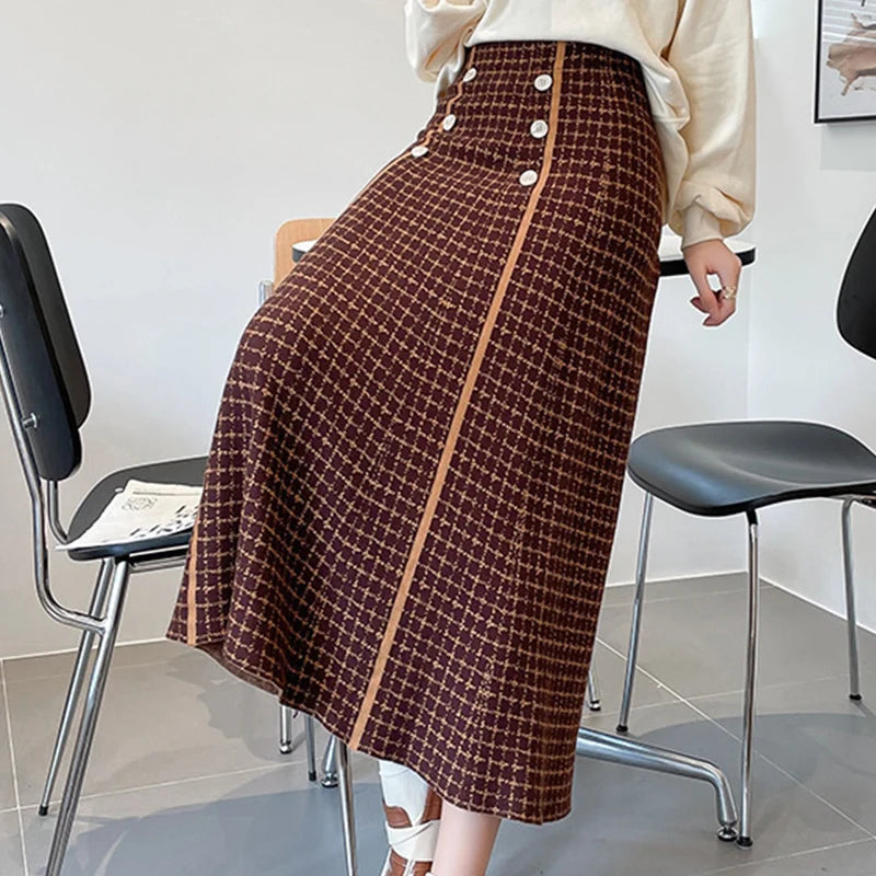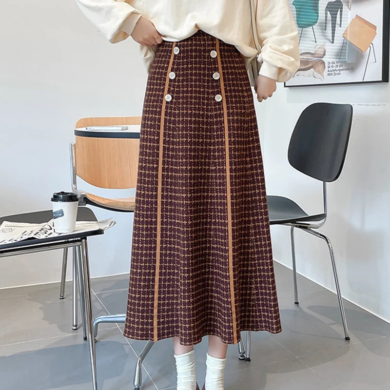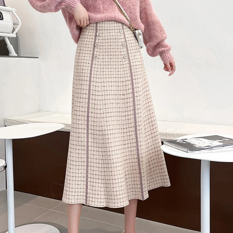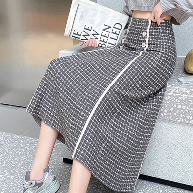 Elegant Mix Color Plaid Skirts Women Fashion Button Knitted Skirts for Woman