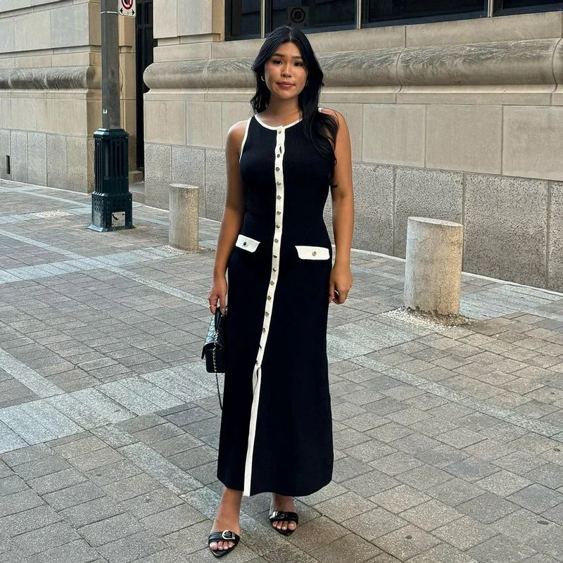 Elegant Sleeveless Single-breasted Ribbed Sweaters Long Dress for Women High Waist Bodycon Knitted Fake P...
