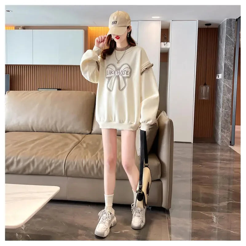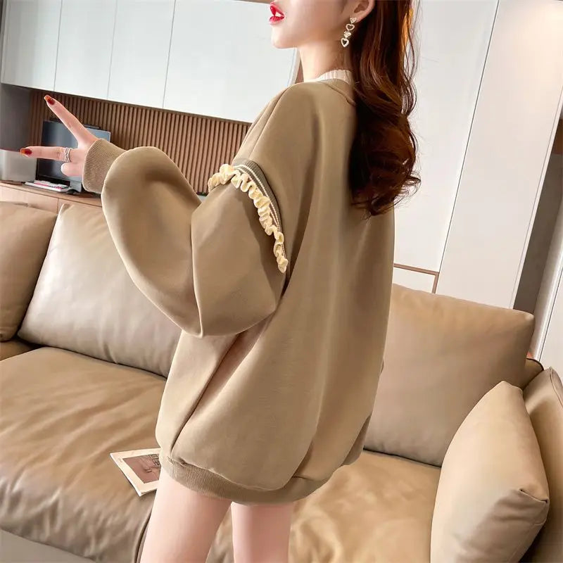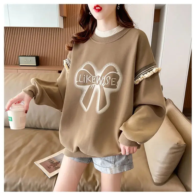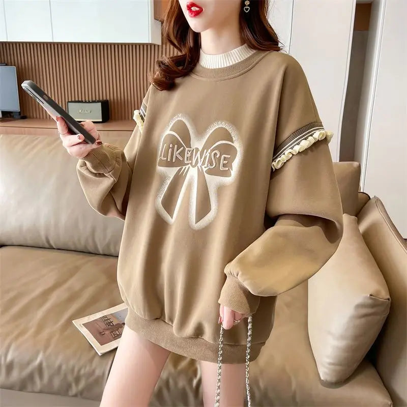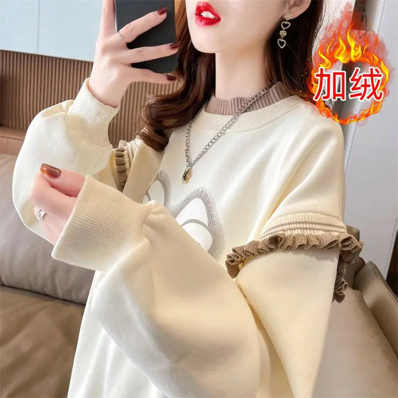 Fake Two piece Velvet Thickened Sweatshirt Women Mid length Style Student Loo...