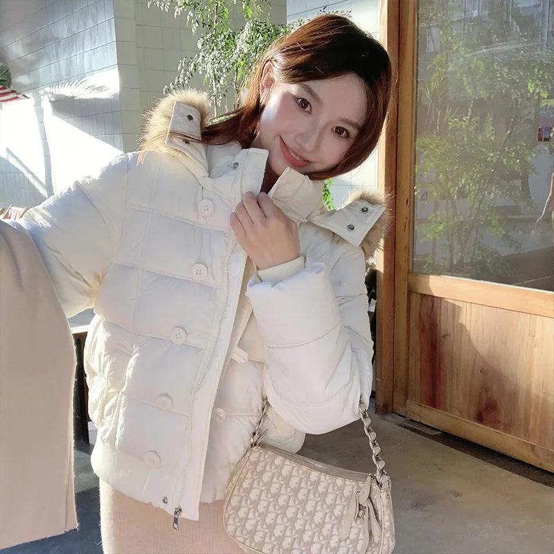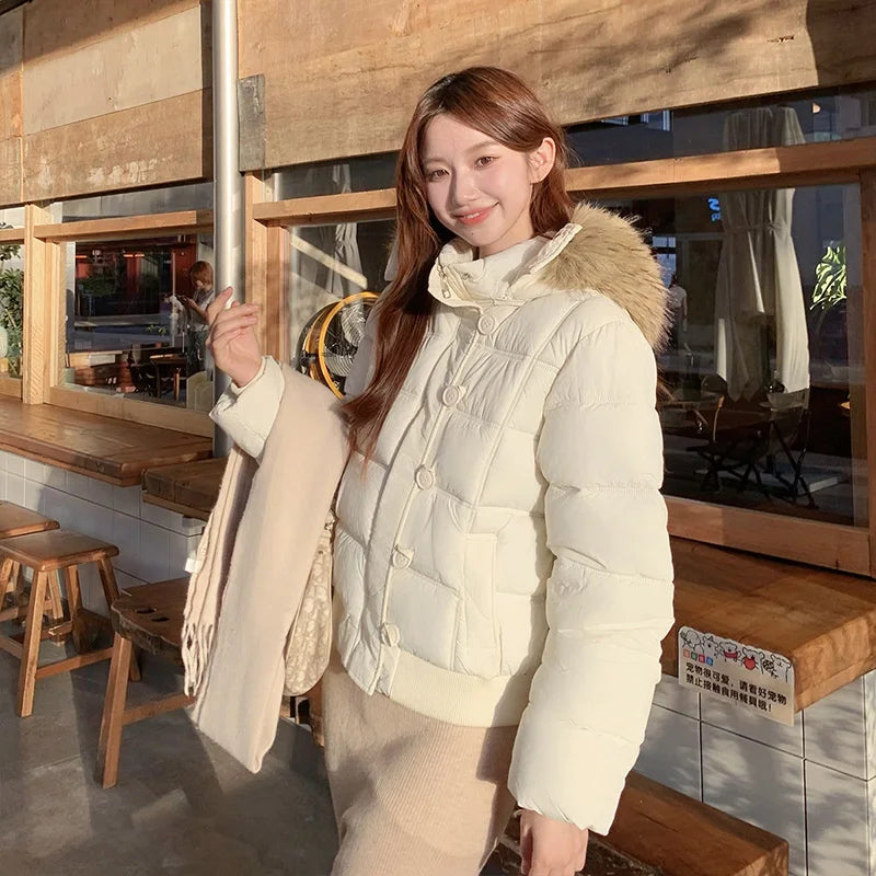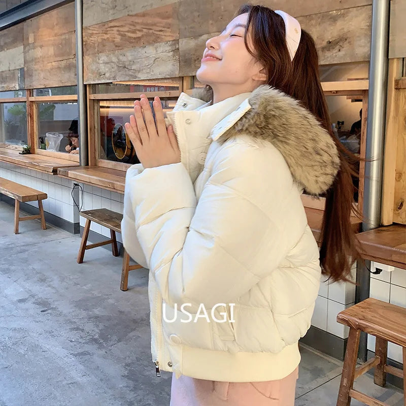 Fur Hooded Jacket Women Autumn Winter Outerwear Thick Dowon Cotton Padded Slim