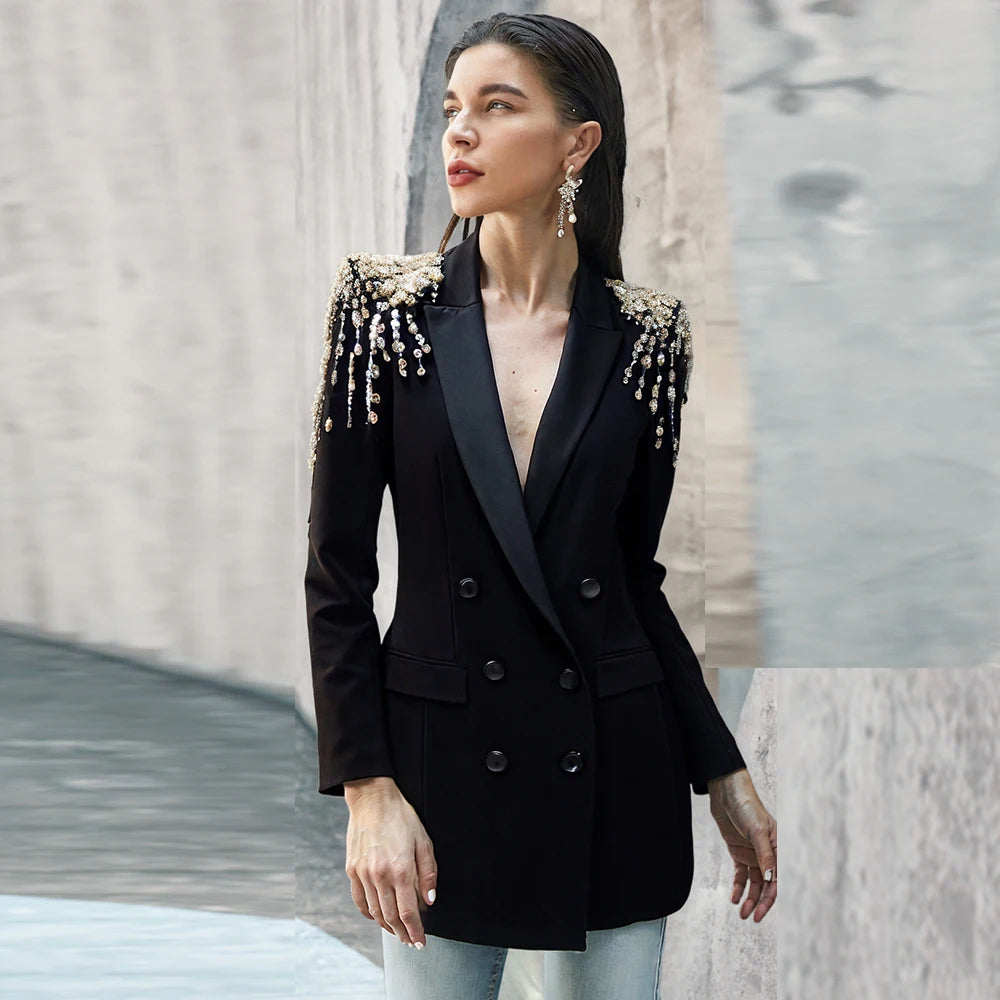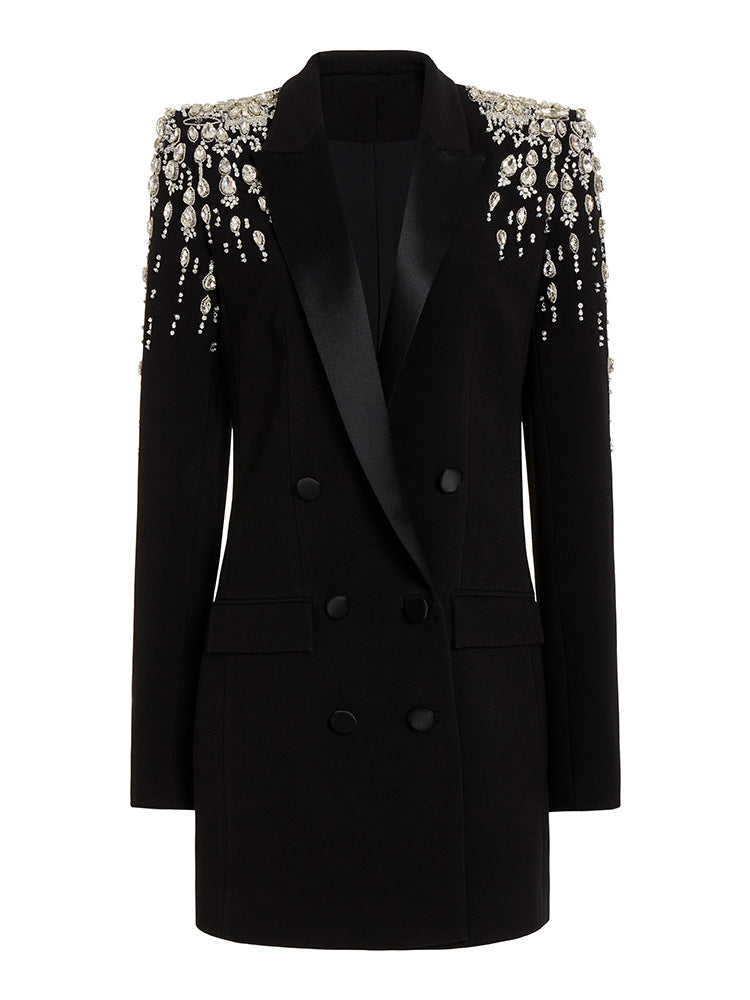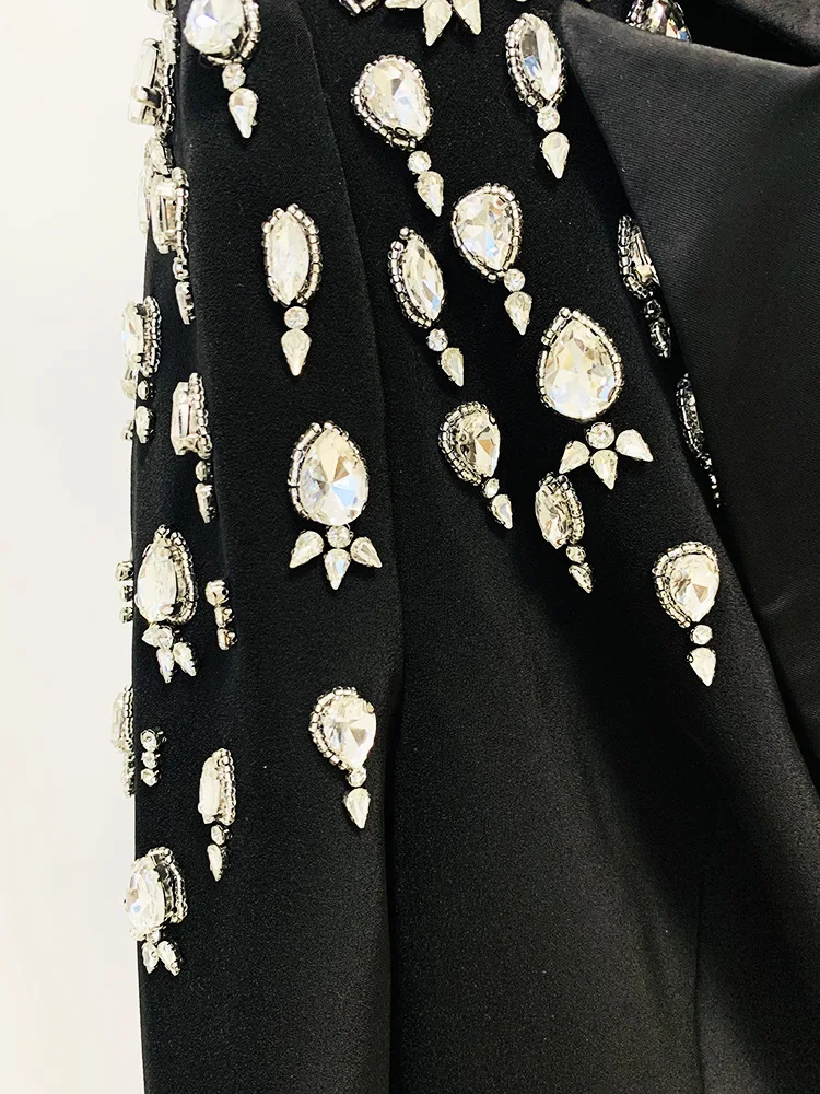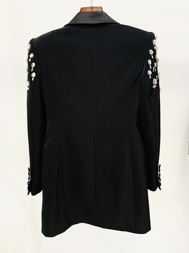 Handmade pearl inlaid diamond Long Blazer Dress Jacket Black White Double