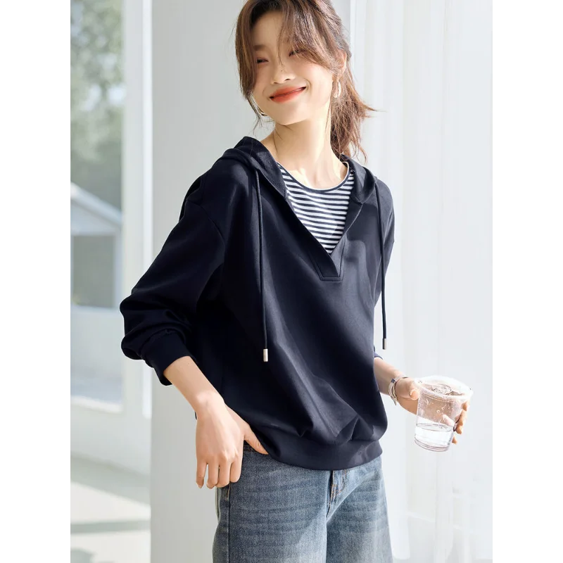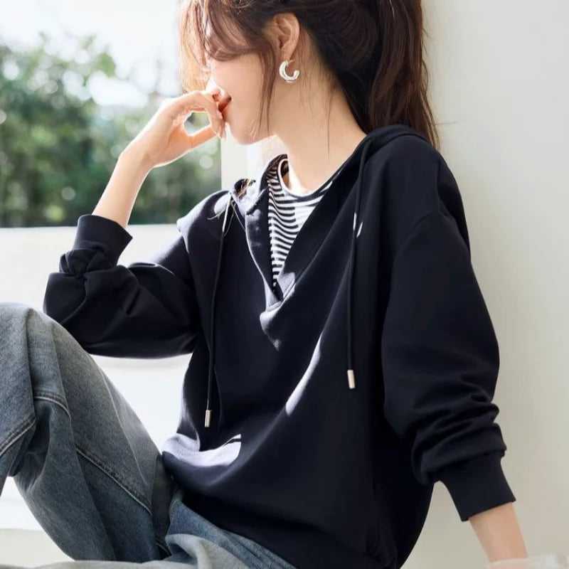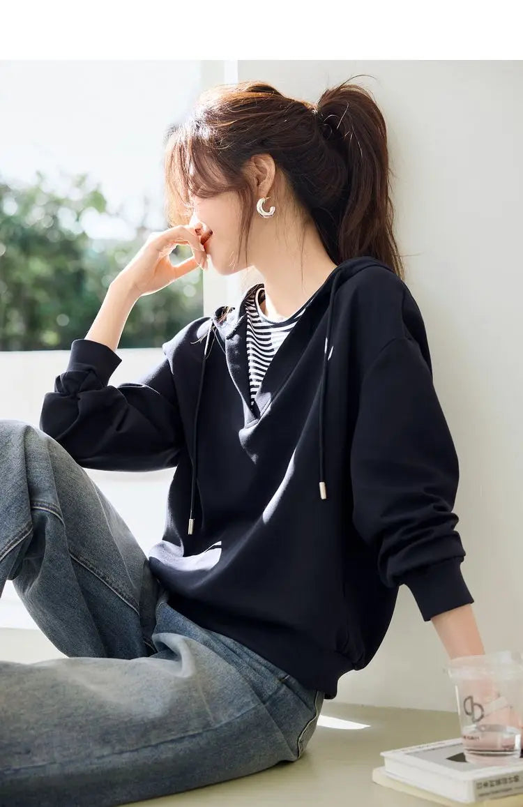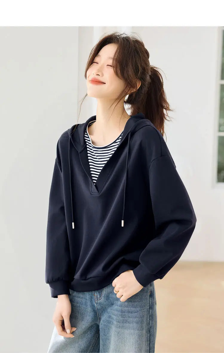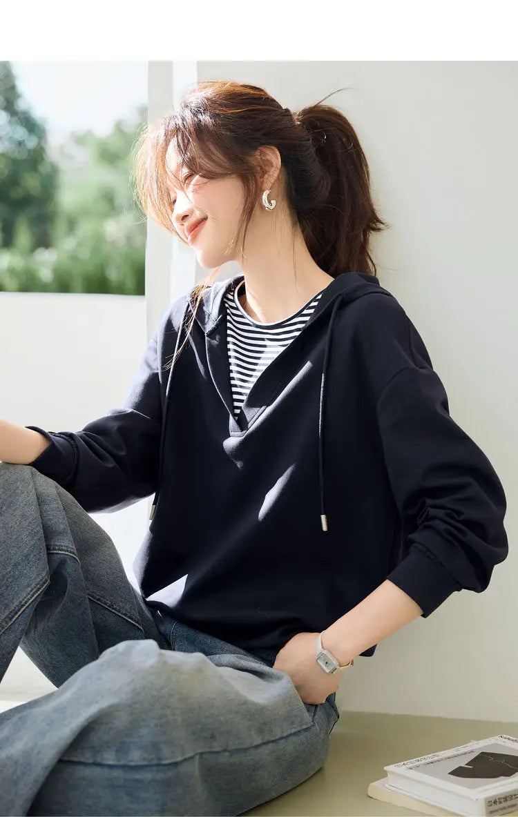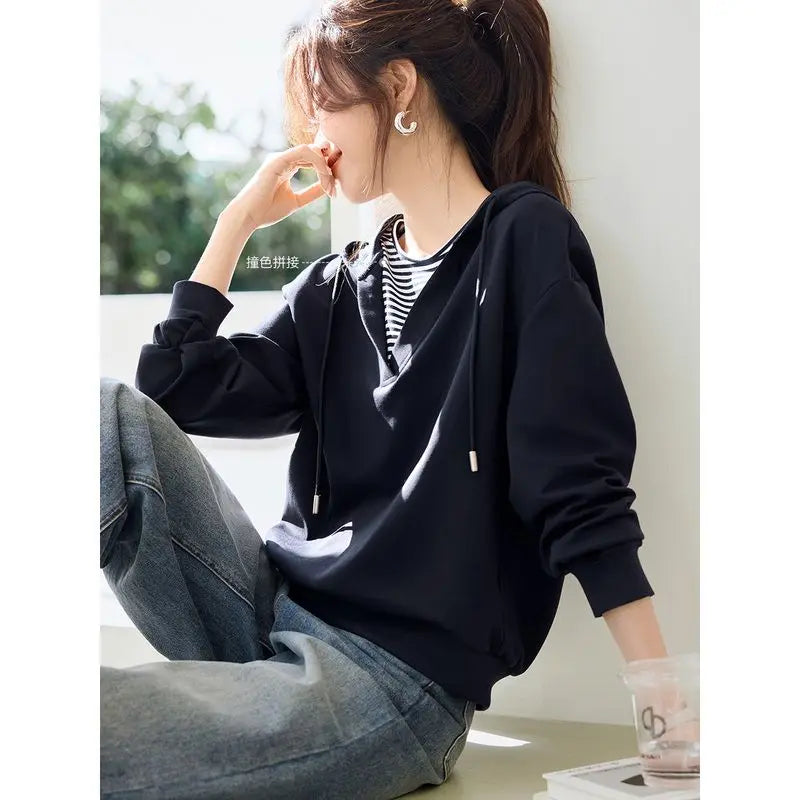 Hooded Commuting Patchwork Color Block Striped Casual Top Women Spring Fashio...