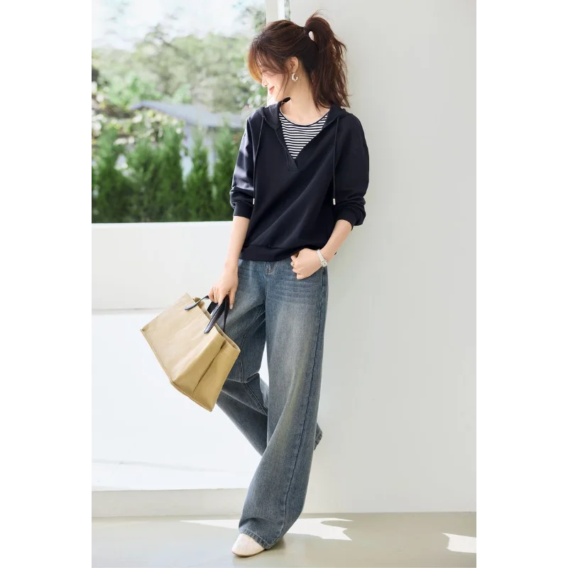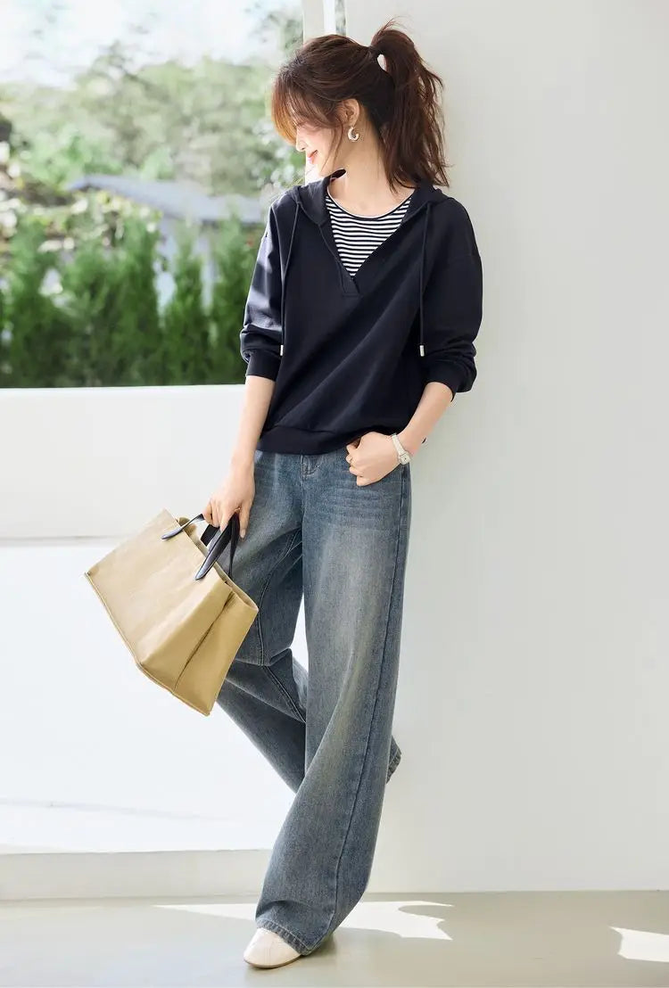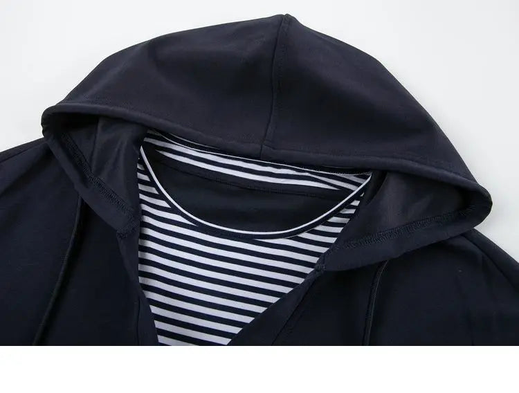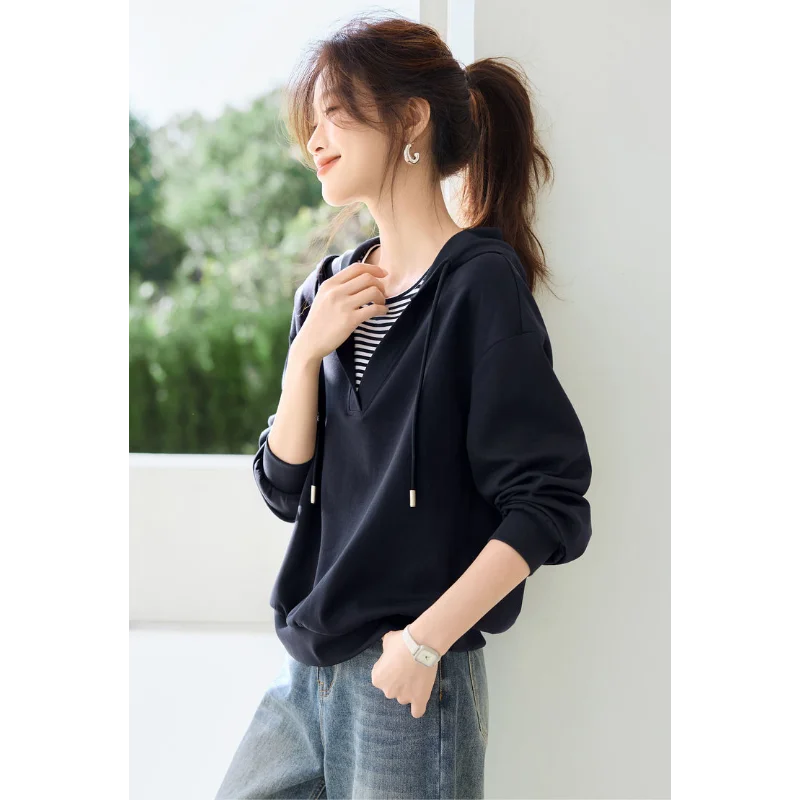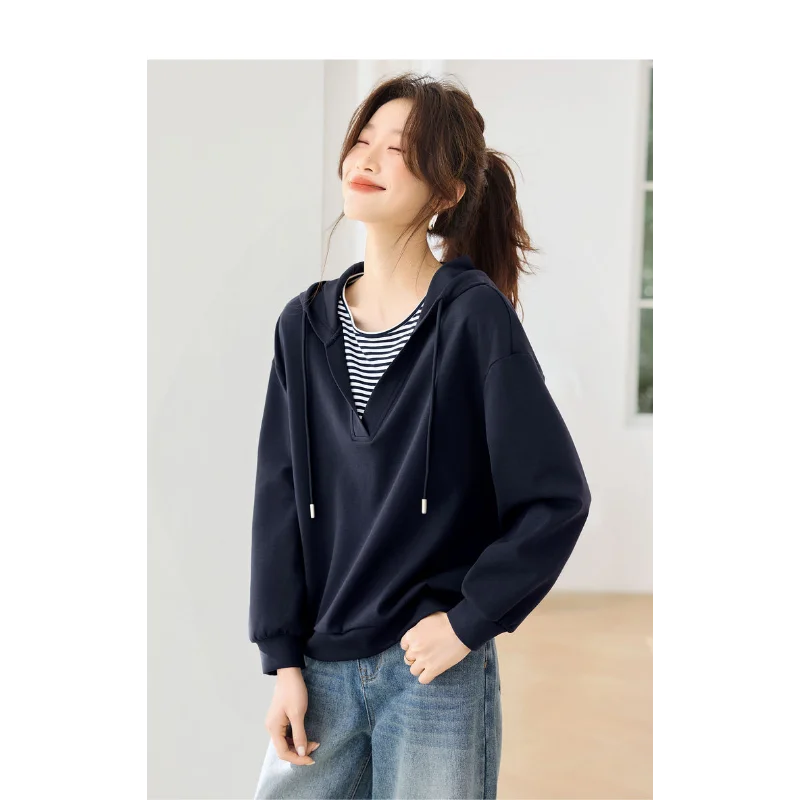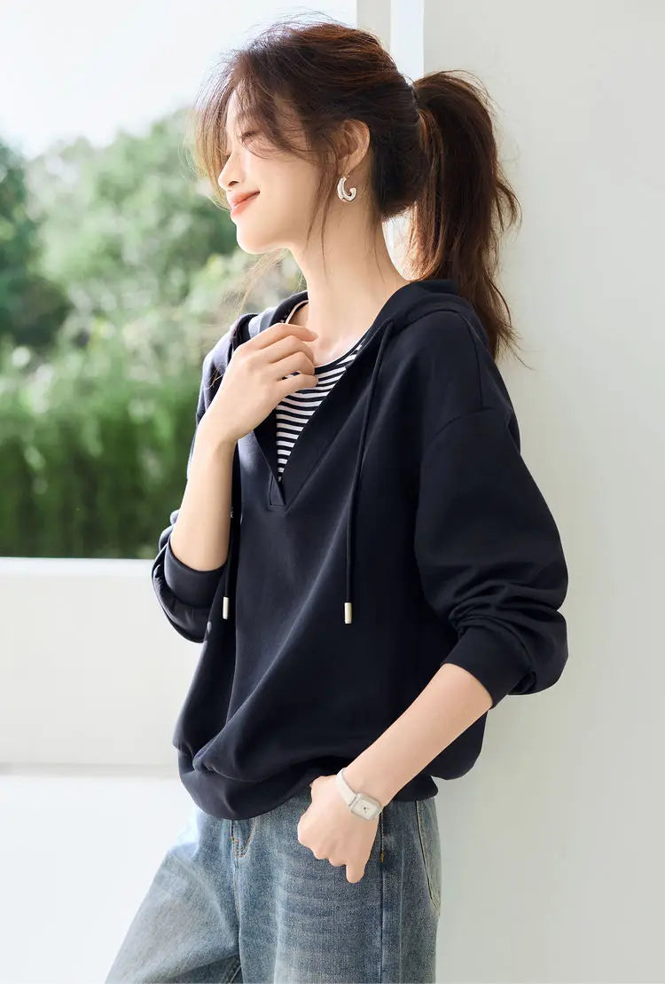 Hooded Commuting Patchwork Color Block Striped Casual Top Women Spring Fashio...