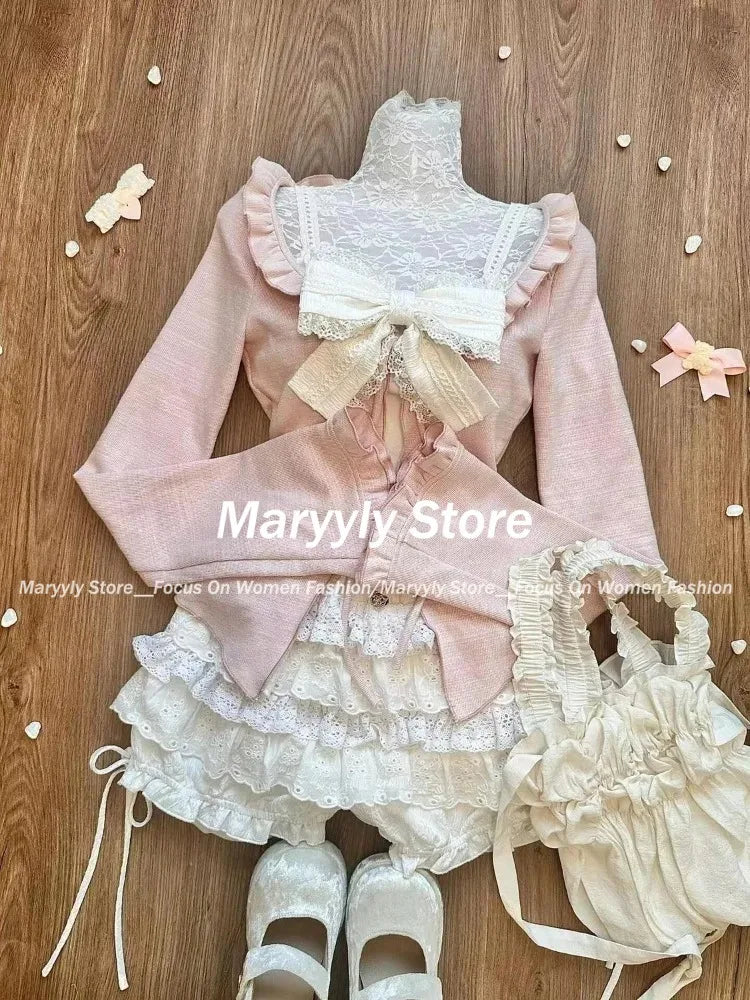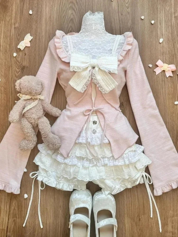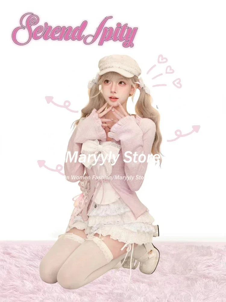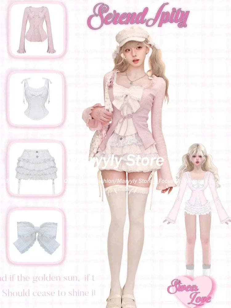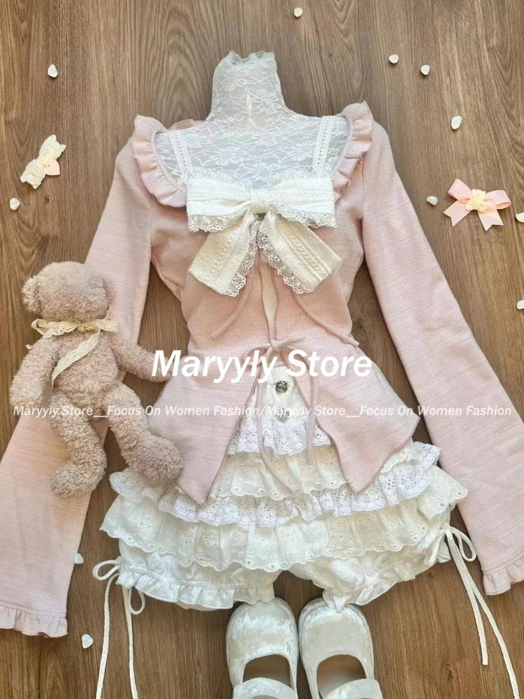 Japanese Kawaii Sweet 3 Piece Sets Women Long Sleeve Cardigan Tops+ Sexy Slim Bow White Vest+ High Waist ...