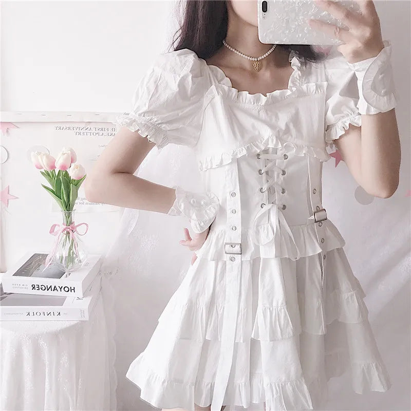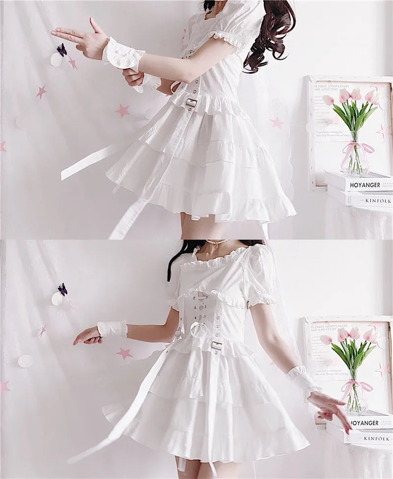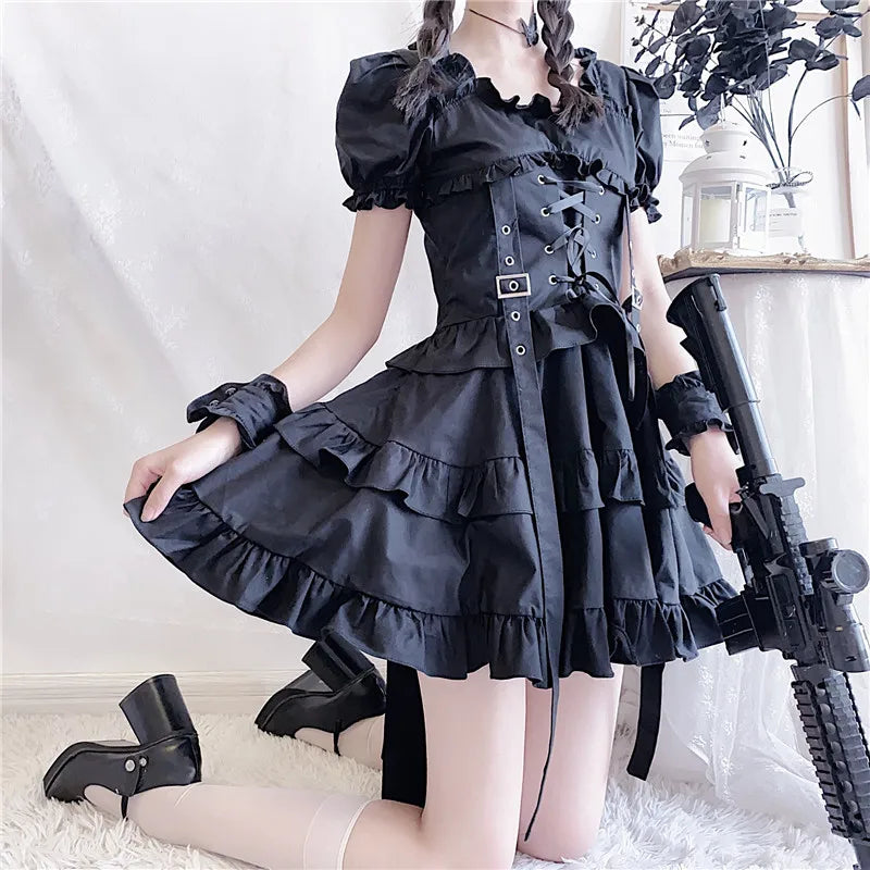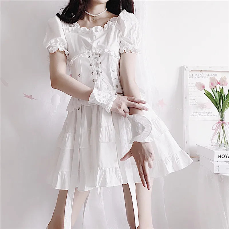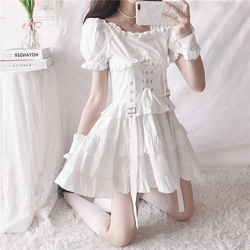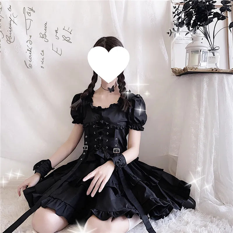 Japanese Lolita Princess Black Sexy Mini Bad Girl Dress Kawaii High Waist Puff Sleeve Lace Ruffles White ...
