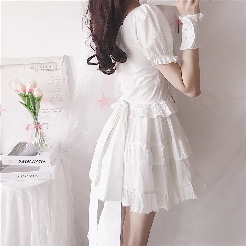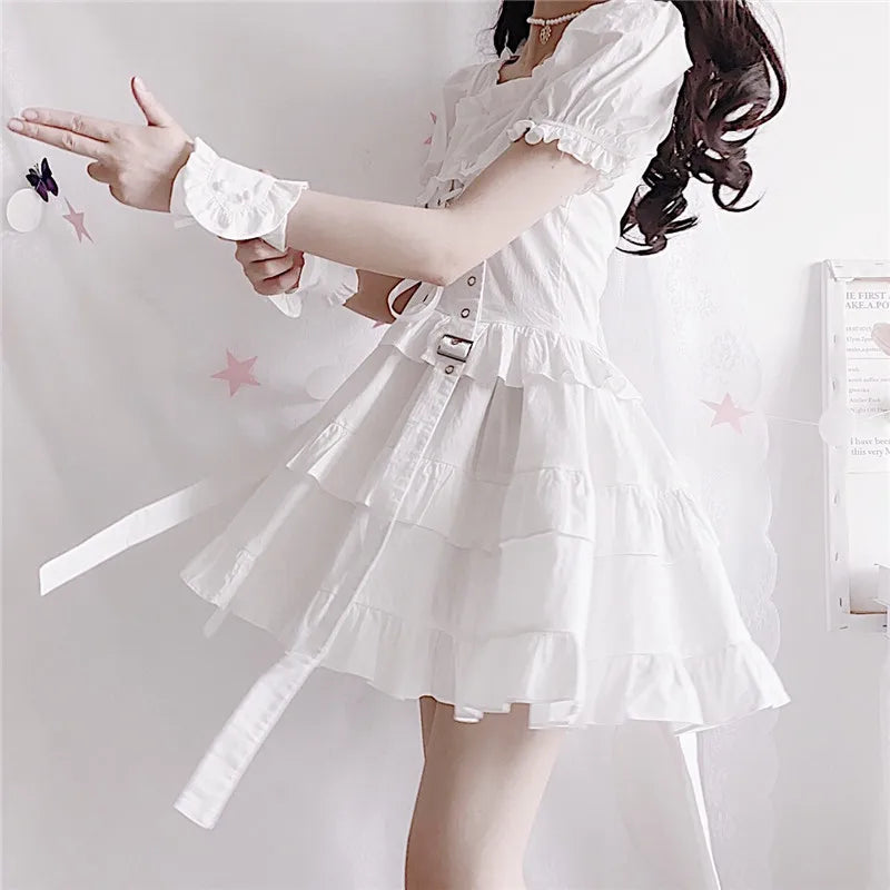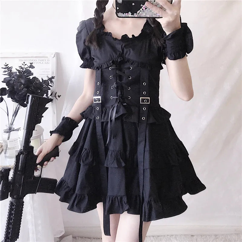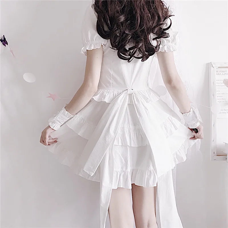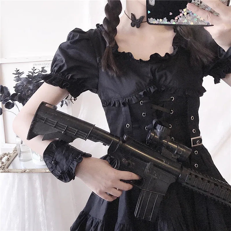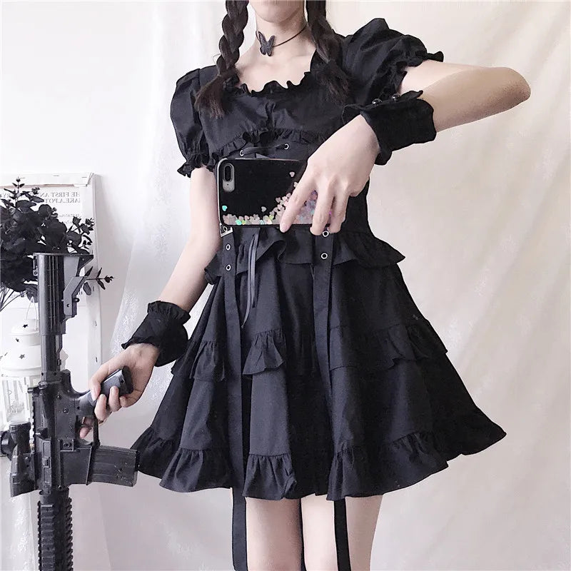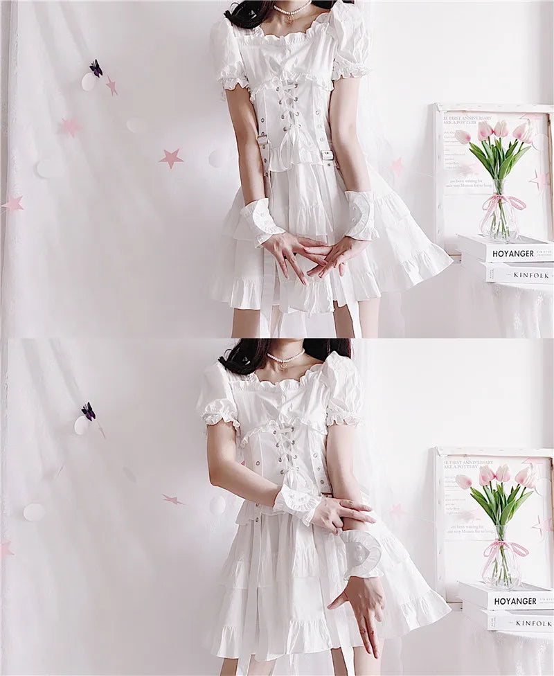 Japanese Lolita Princess Black Sexy Mini Bad Girl Dress Kawaii High Waist Puff Sleeve Lace Ruffles White ...