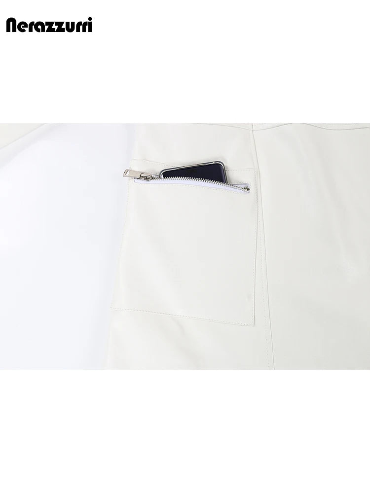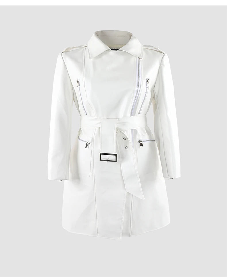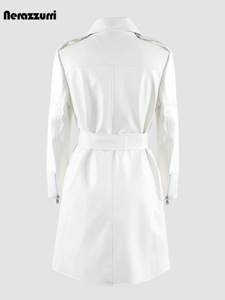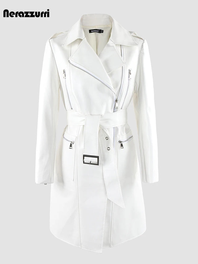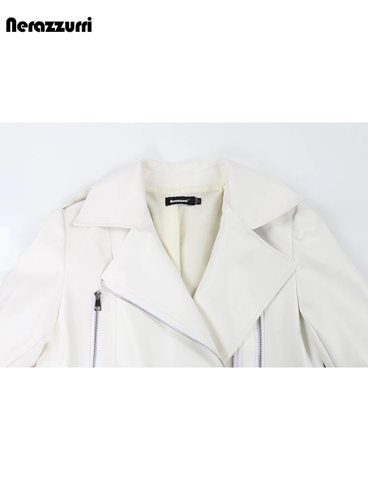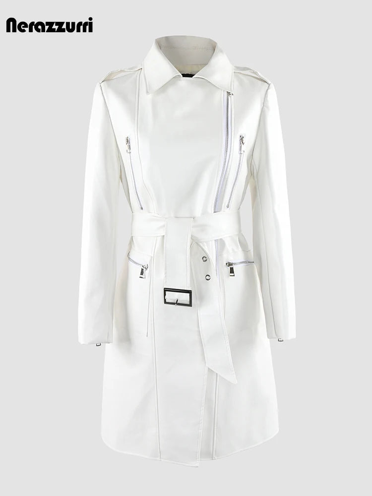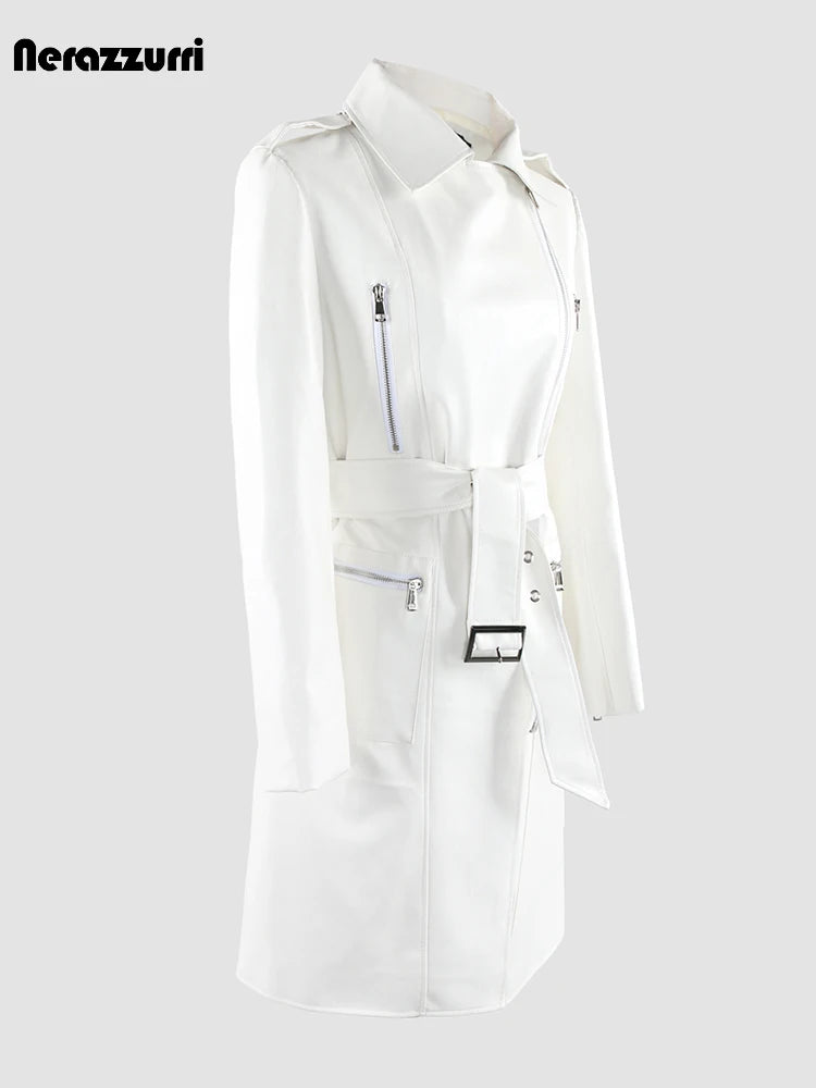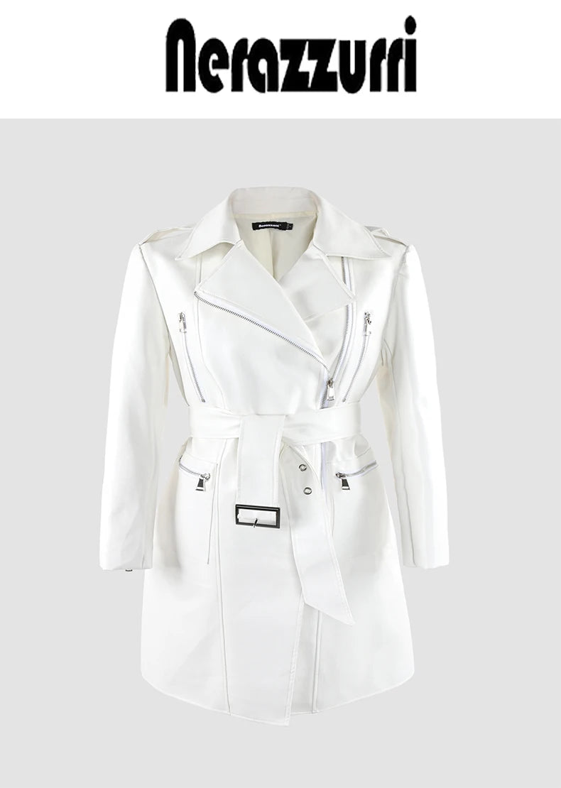 Nerazzurri Spring Cool Handsome Long White Pu Leather Biker Jacket Women Zipper Belt Fall 2023 European F...