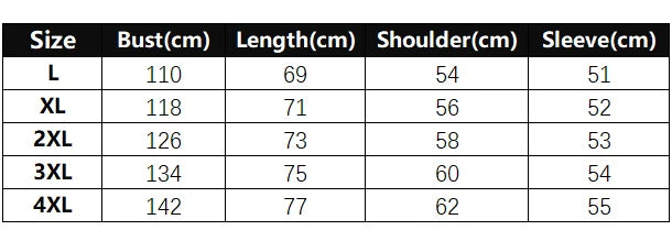 size_info: {"sizeInfoList":[{"length":{"cm":"110","inch":"43.31"},"size":"L","vid":-30},{"length":{"cm":"118","inch":"46.46"},"size":"XL","vid":-31},{"length":{"cm":"126","inch":"49.61"},"size":"XXL","vid":-32},{"length":{"cm":"134","inch":"52.76"},"size":"XXXL","vid":-33},{"length":{"cm":"142","inch":"55.91"},"size":"4XL","vid":-34}]}