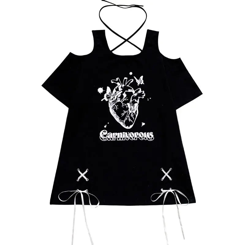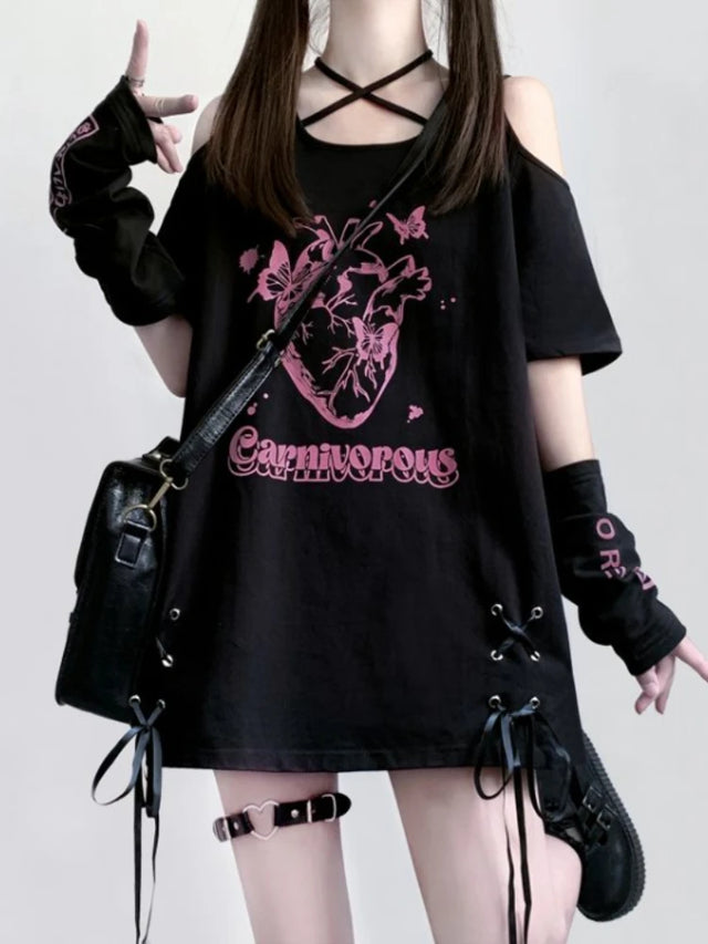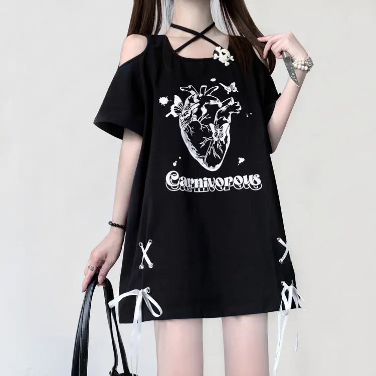 Vintage Cross Off Shoulder Bandage Bow T-Shirts Summer Y2k Aesthetic Letter Print Tees Fashion Japanese I...