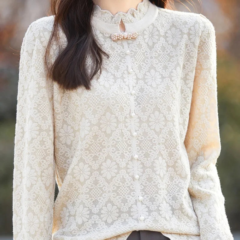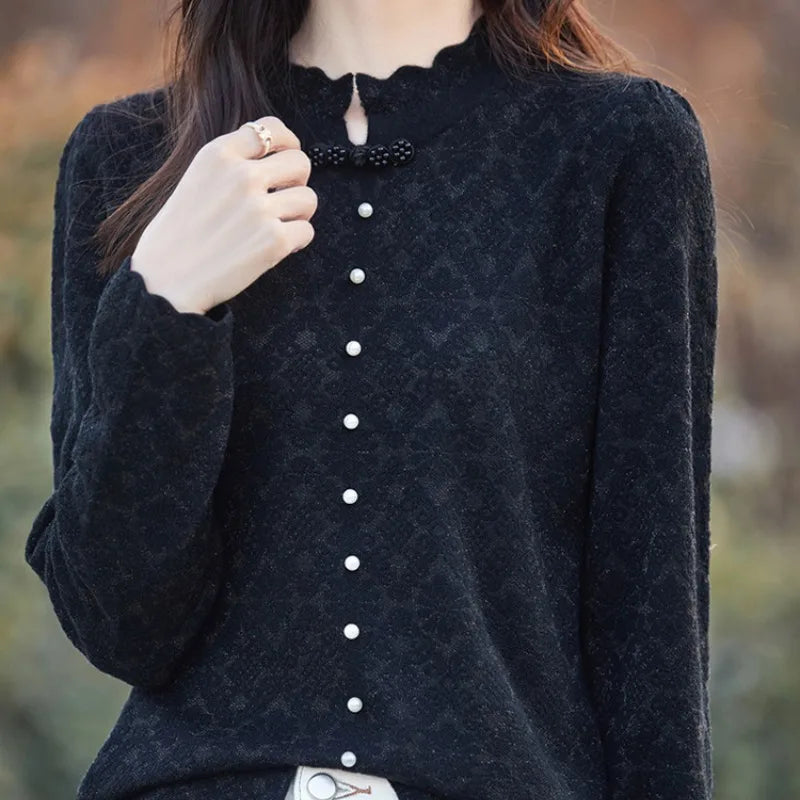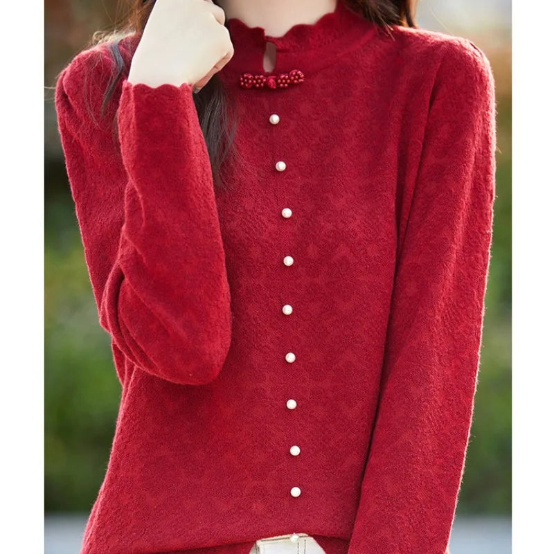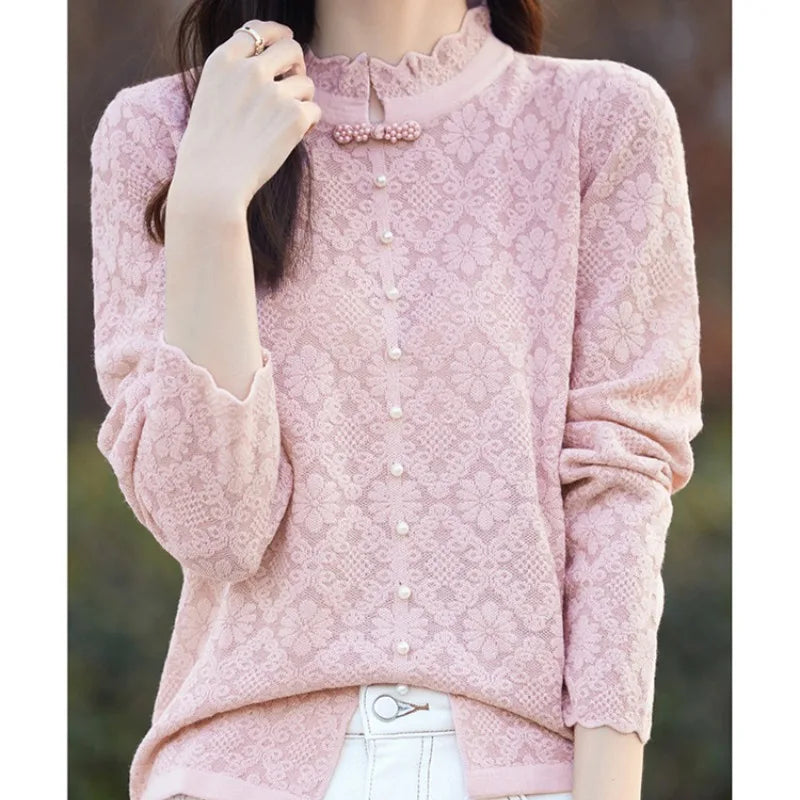 Women s Spring Autumn Solid Turtleneck Lace Bow Pullover Tie Flowers Long Sleeve