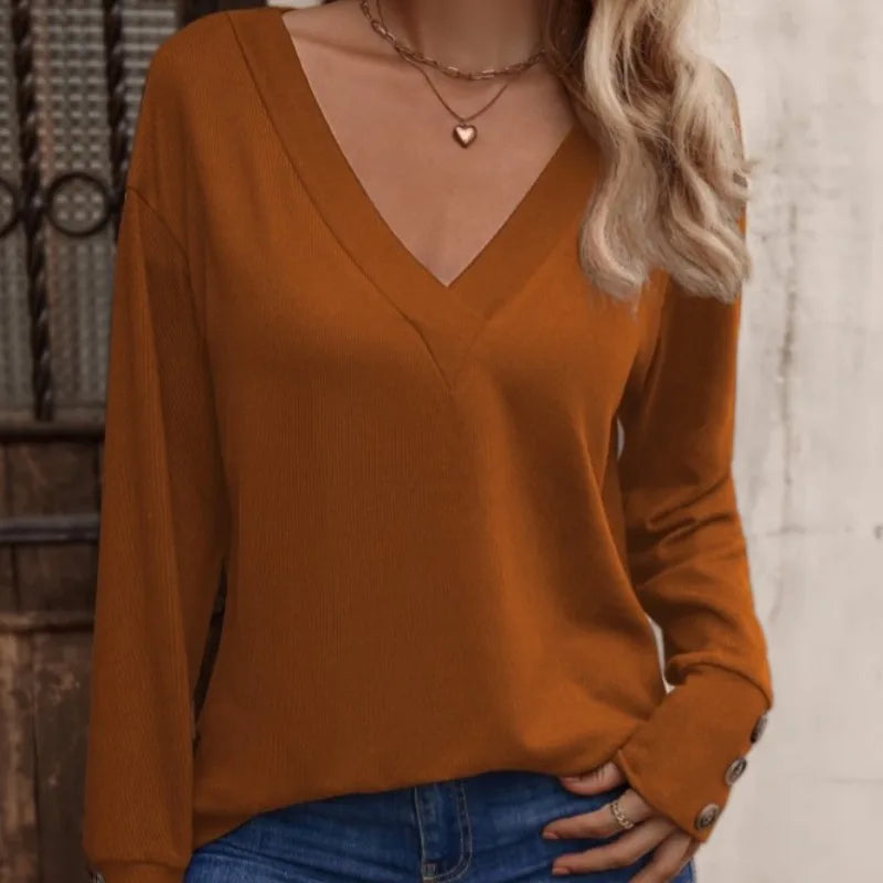 Women s Spring Autumn V Neck Solid Pullover Loose Button Lantern Long Sleeve T