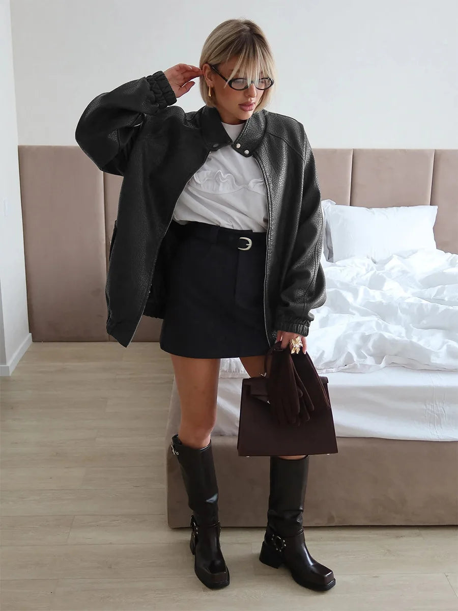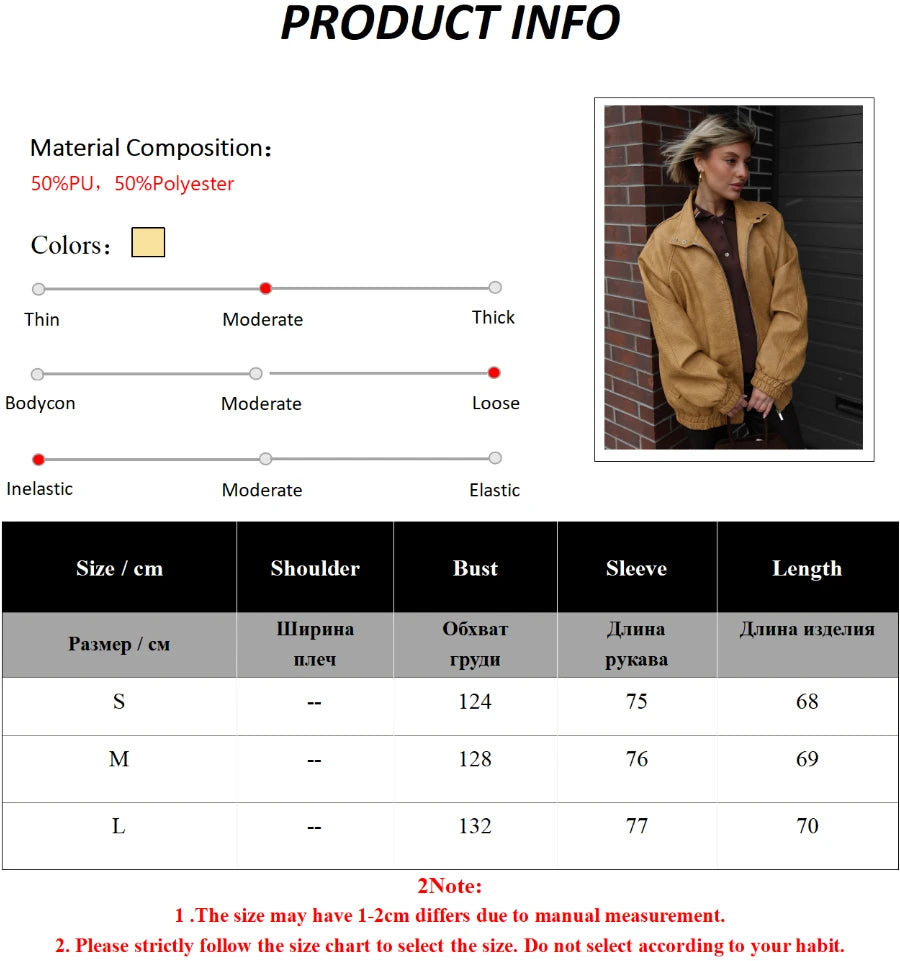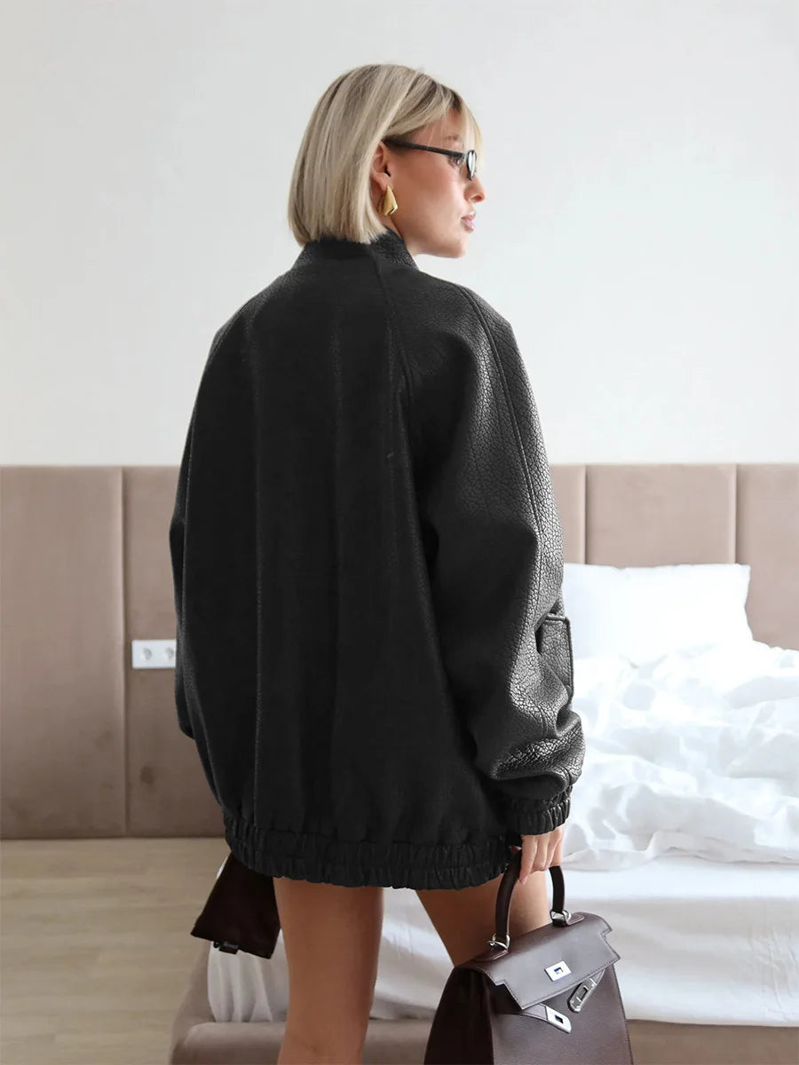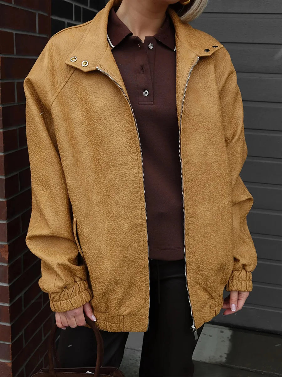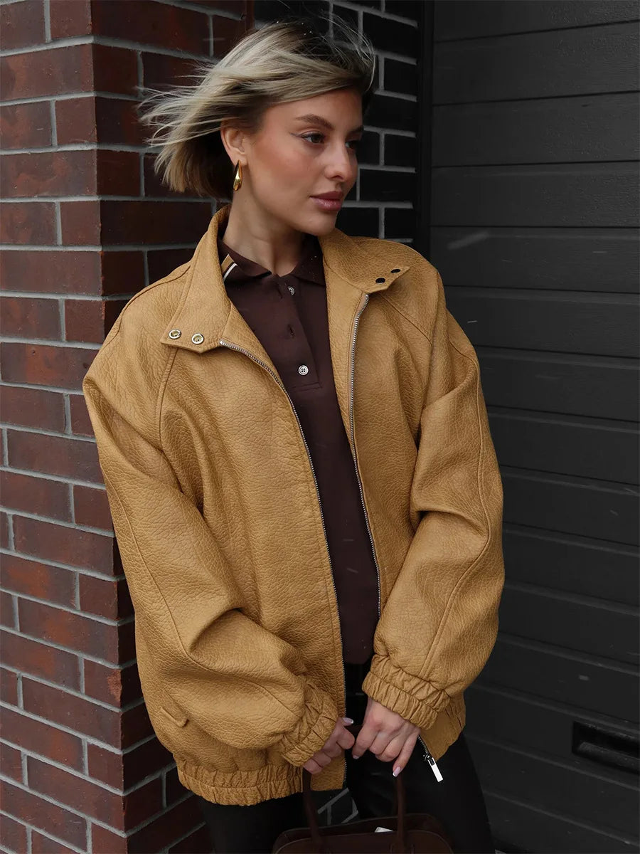 Bornladies Women s Stand Collar Zip Up Faux Leather Jacket Oversized Fit Long