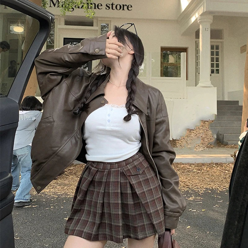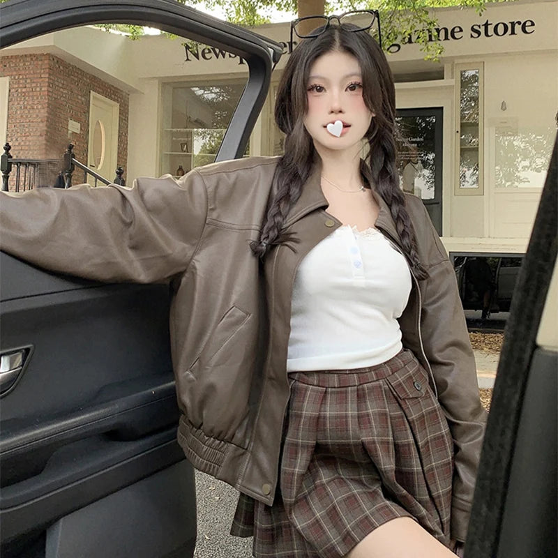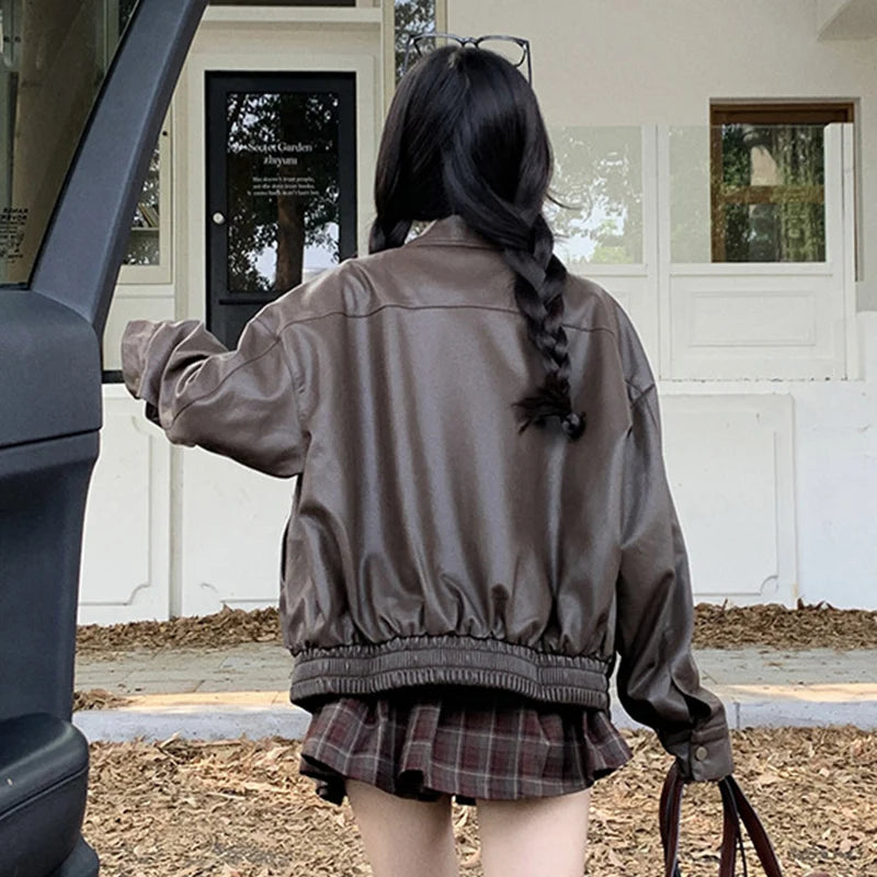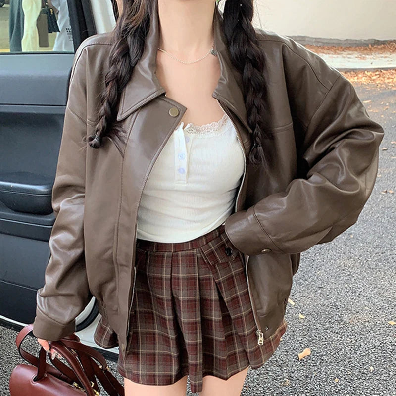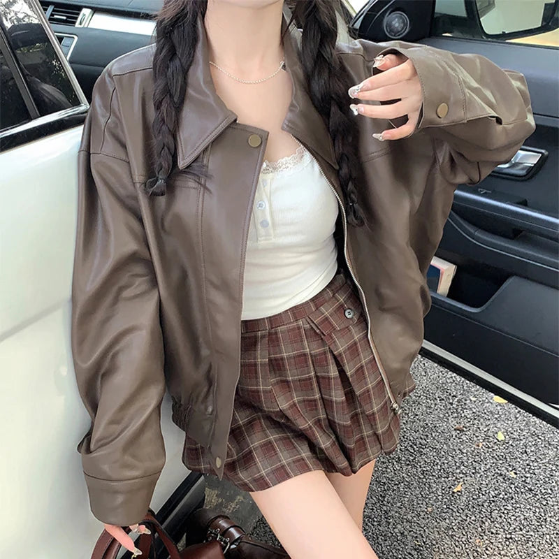 Streetwear Pu Leather Jacket for Women Black Brown Turn Down Collar Jackets