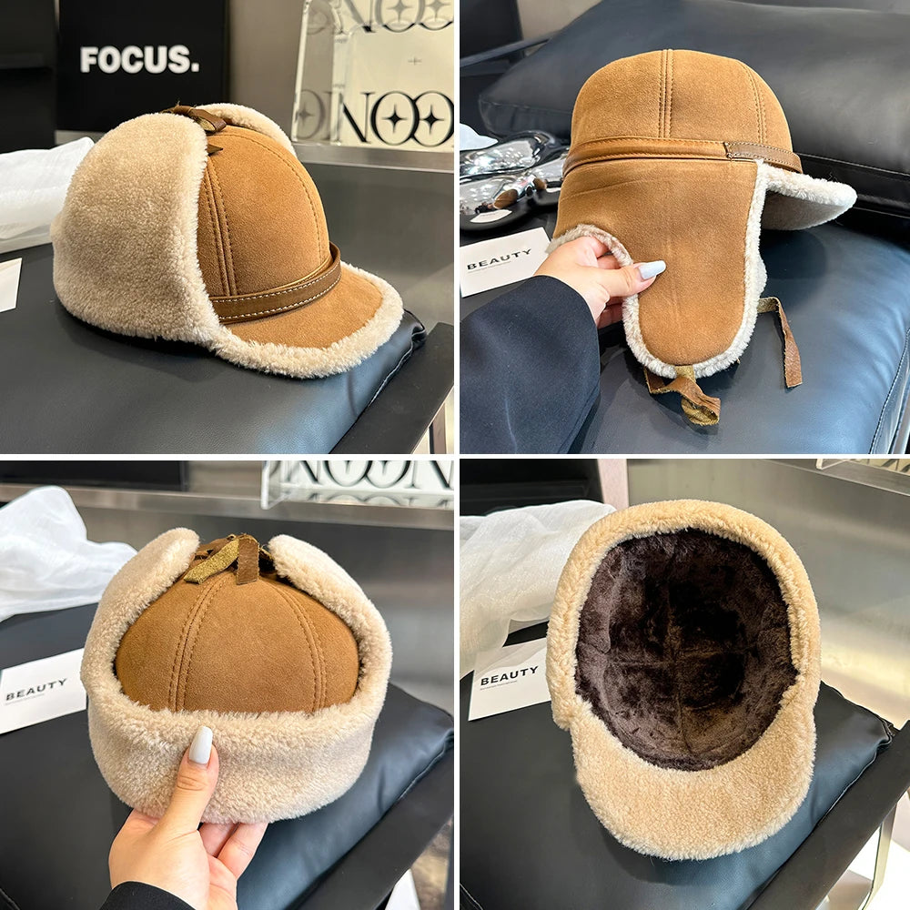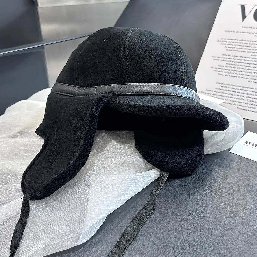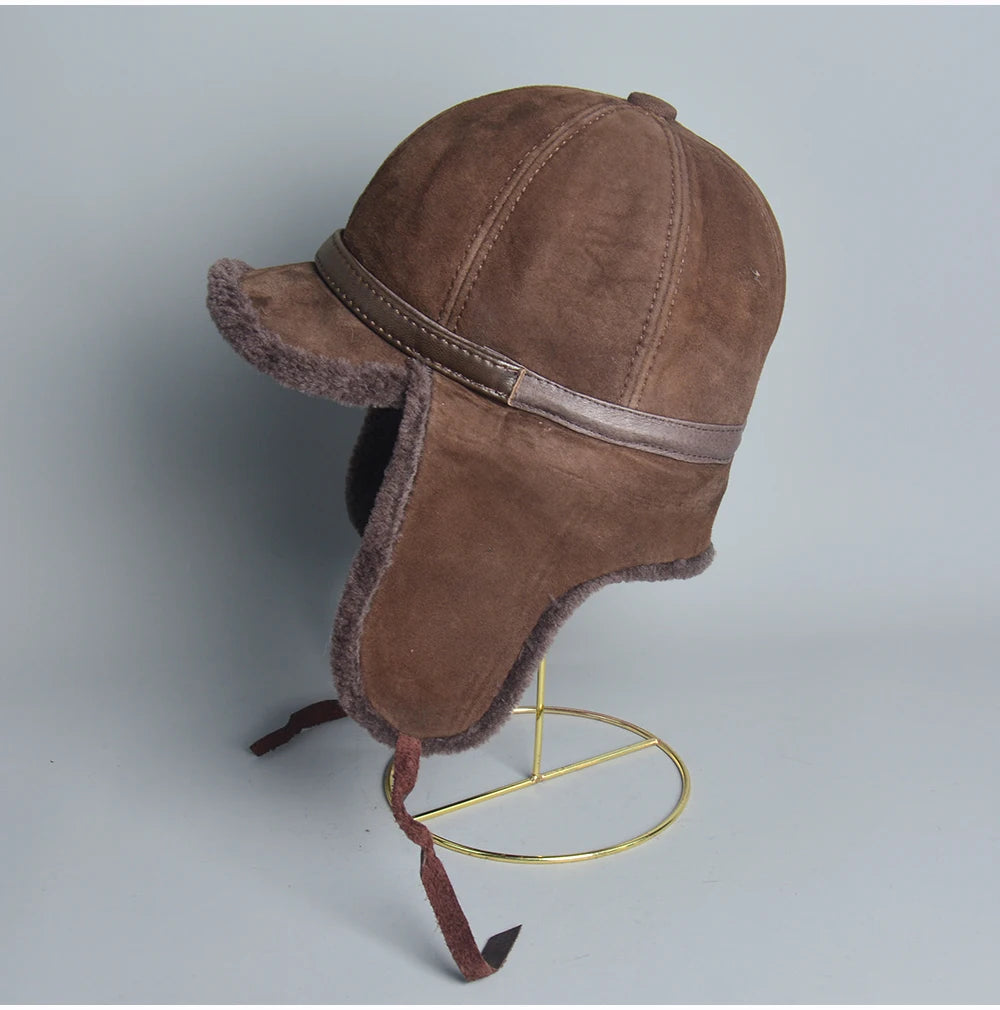 Winter Leather Hat Men Fur Lamb Wool Warm Thick Earflaps Bomber Hats Men s Ba...