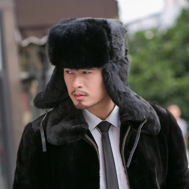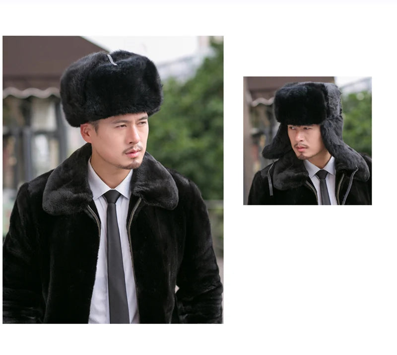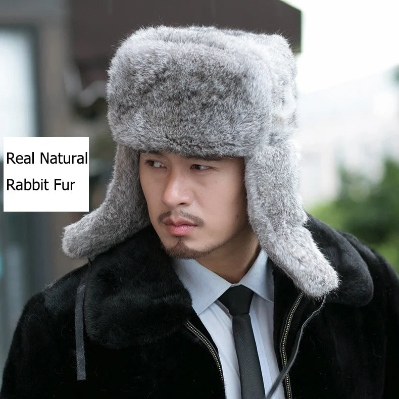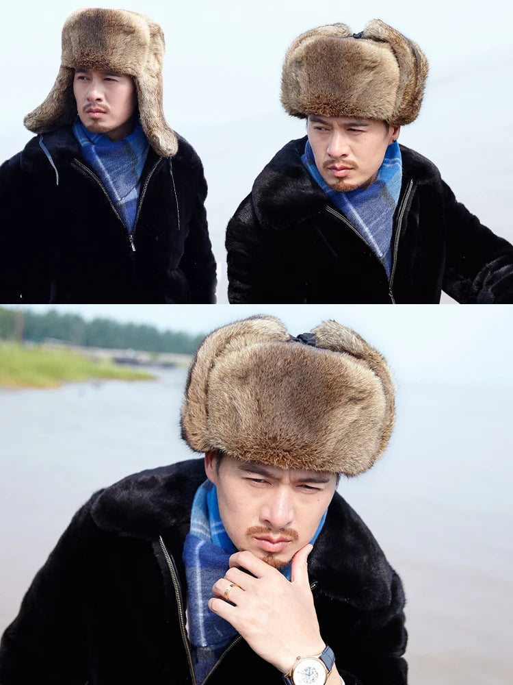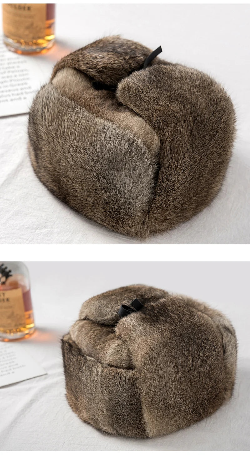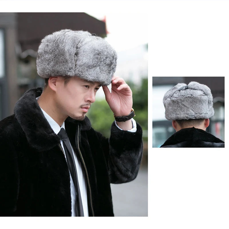 Rabbit Fur Cap Man Winter 100 Fur Bomber Hat Windproof Warm Earmuffs Male Fla...