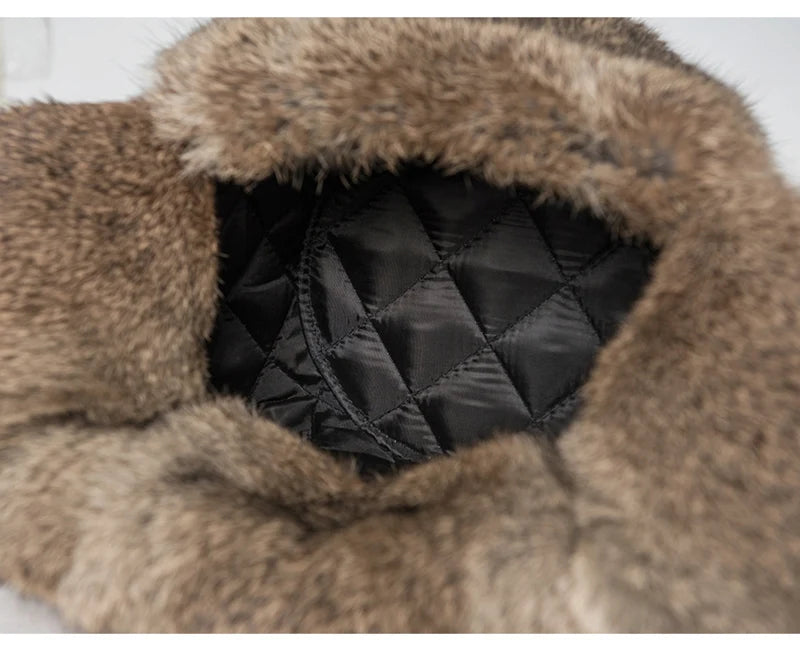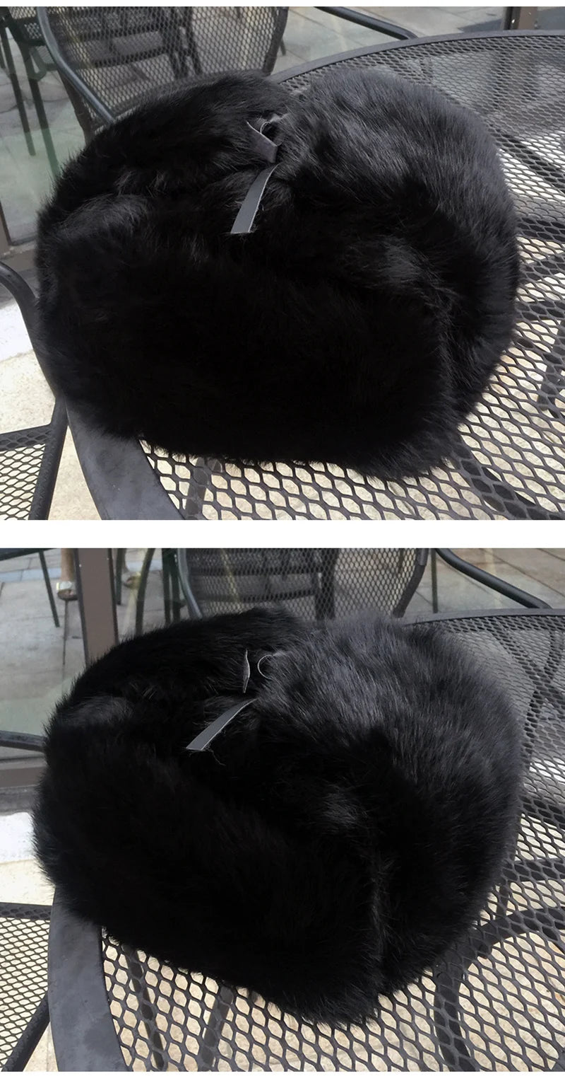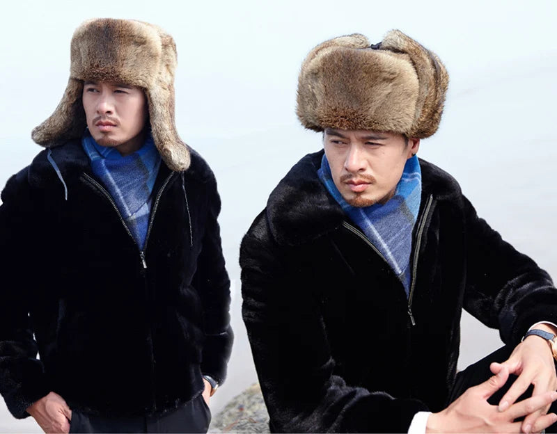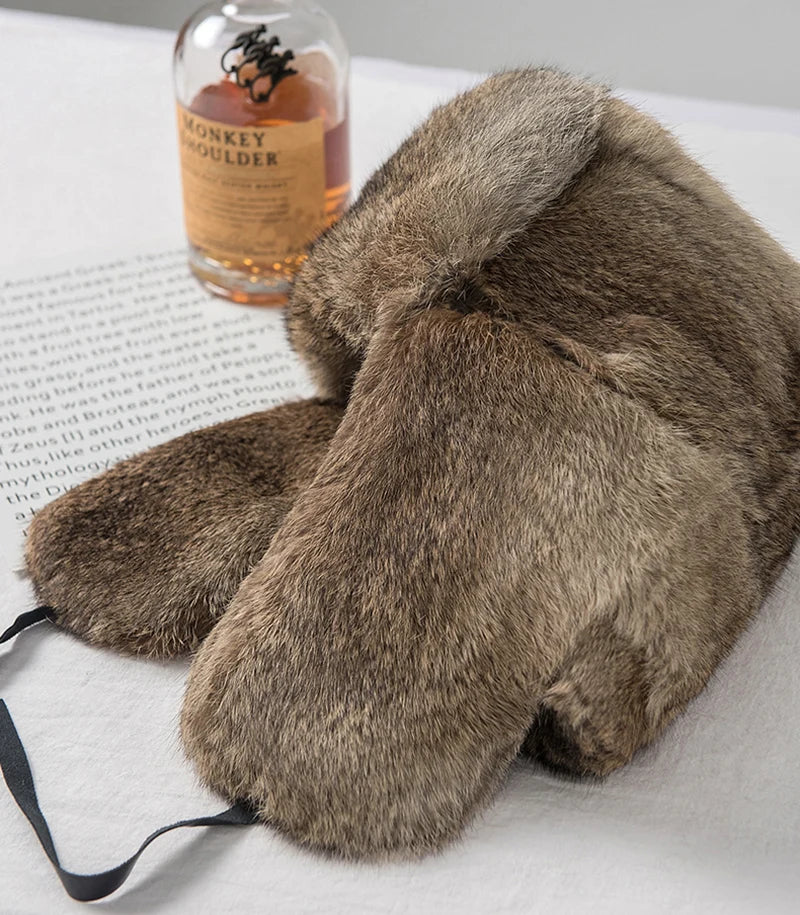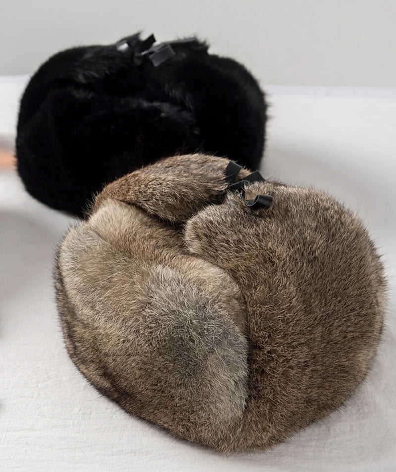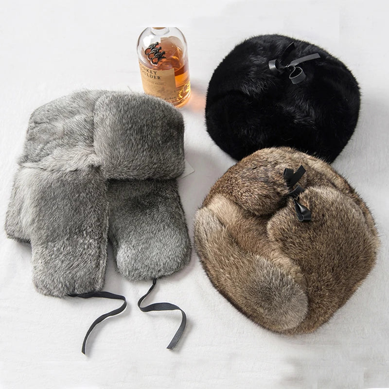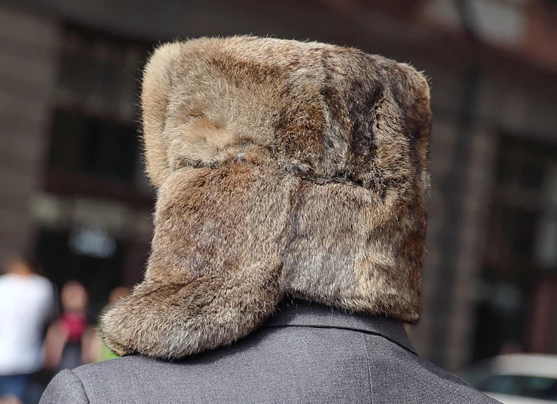 Rabbit Fur Cap Man Winter 100 Fur Bomber Hat Windproof Warm Earmuffs Male Fla...
