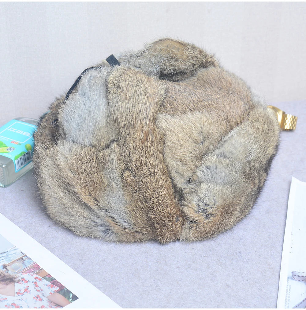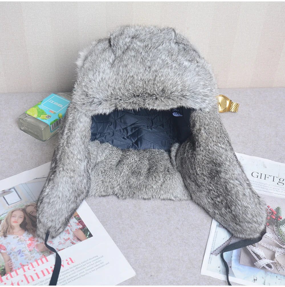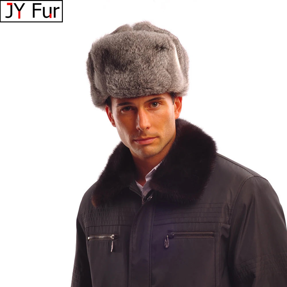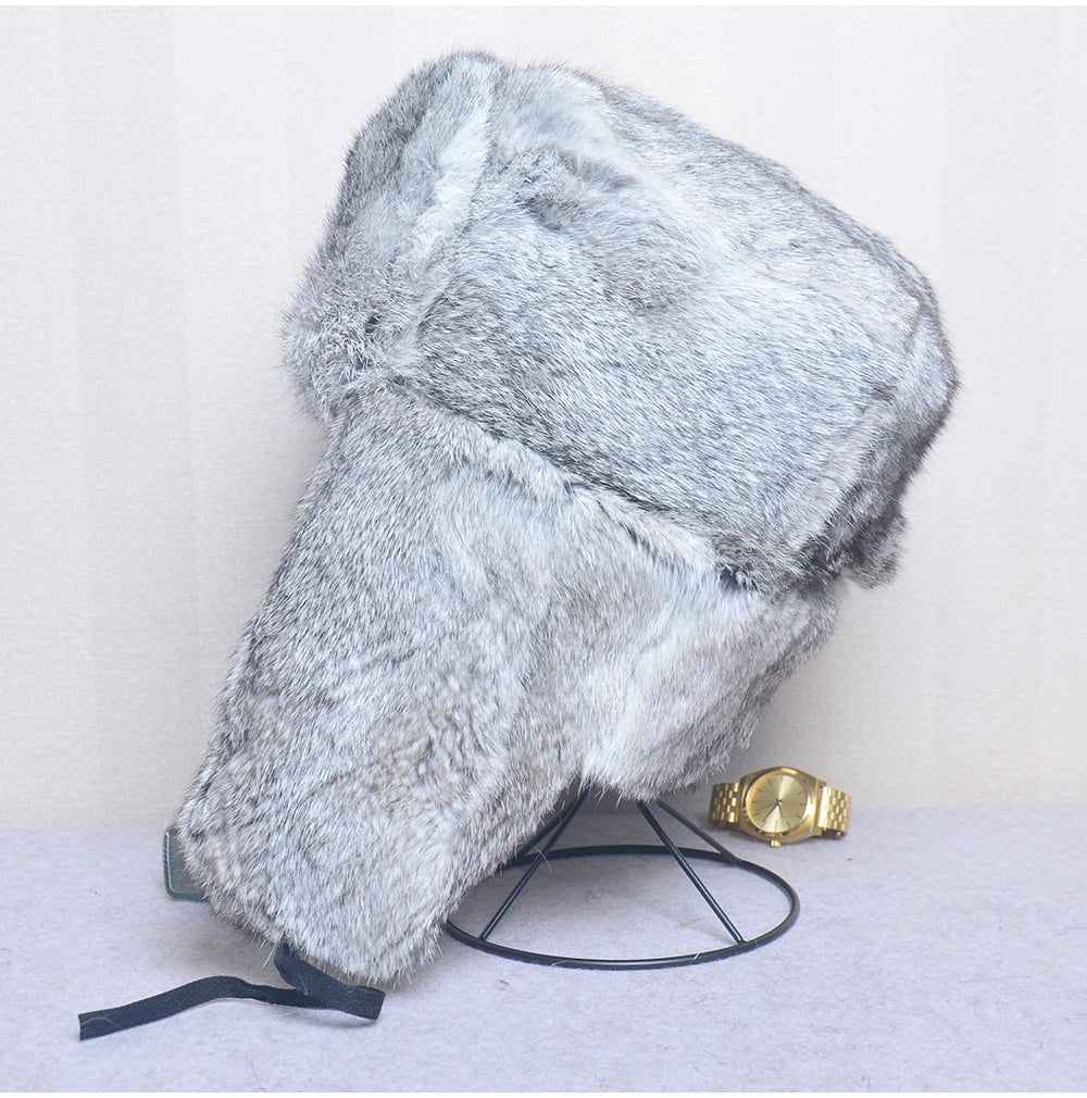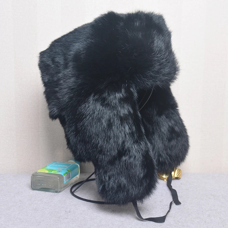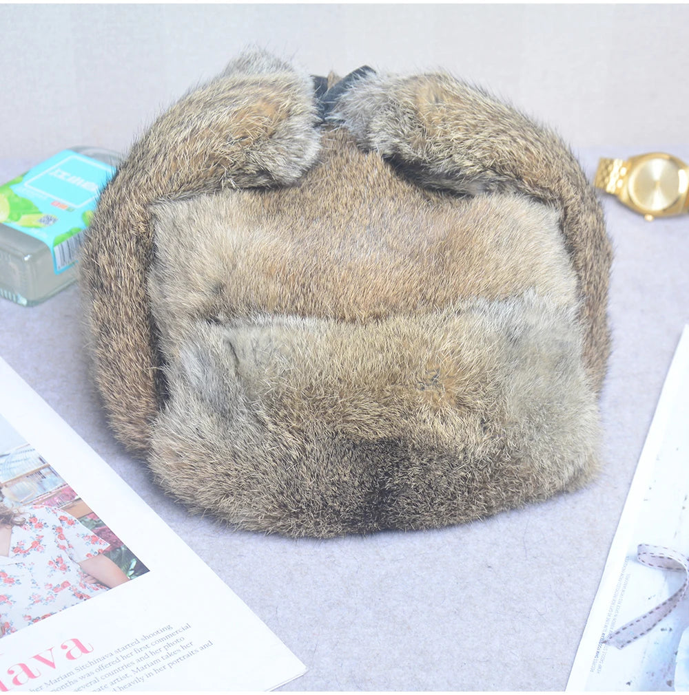 Thick Warm Bomber Hat Men Real Rabbit Fur Earflap Trapper Russian Cap Male Pl...