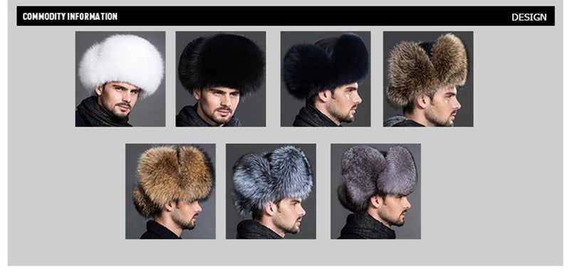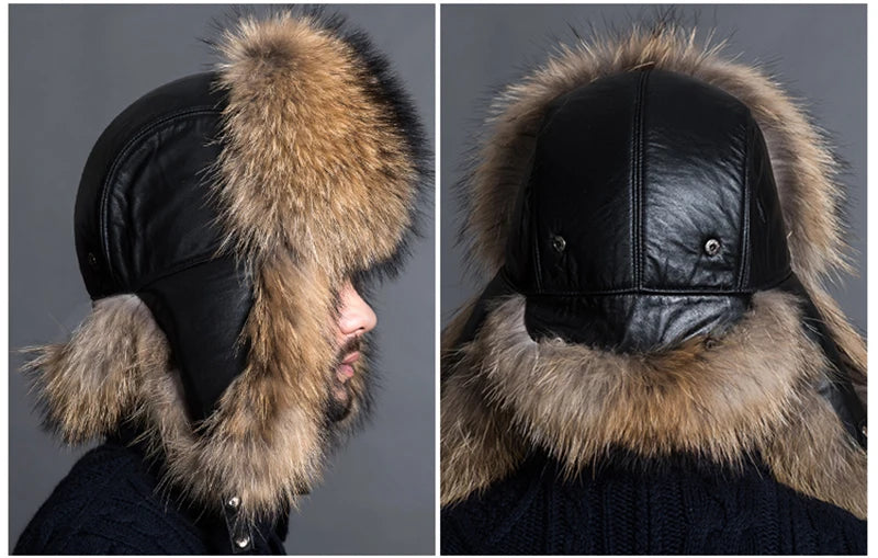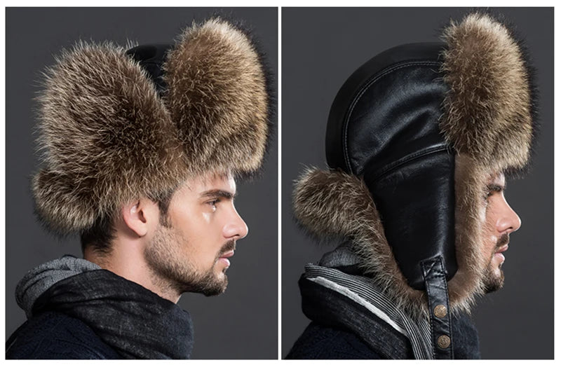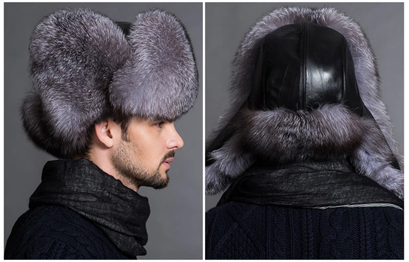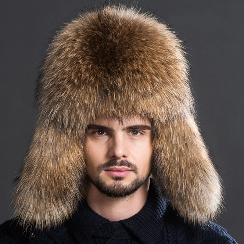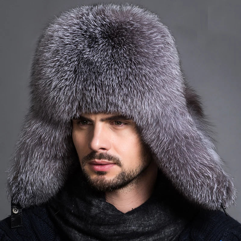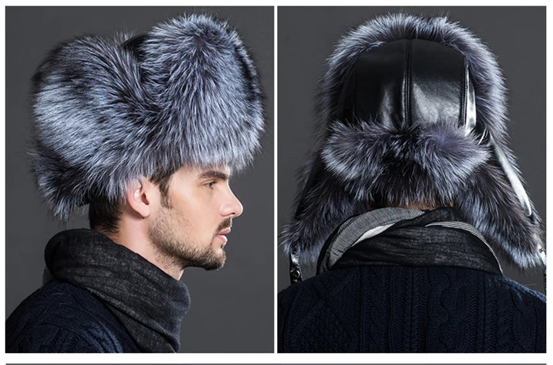 Winter Men s 100 Real Silver Fox Fur Aviator Bomber Hat Raccoon Fur Ushanka C...