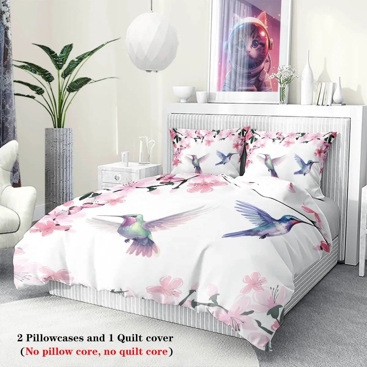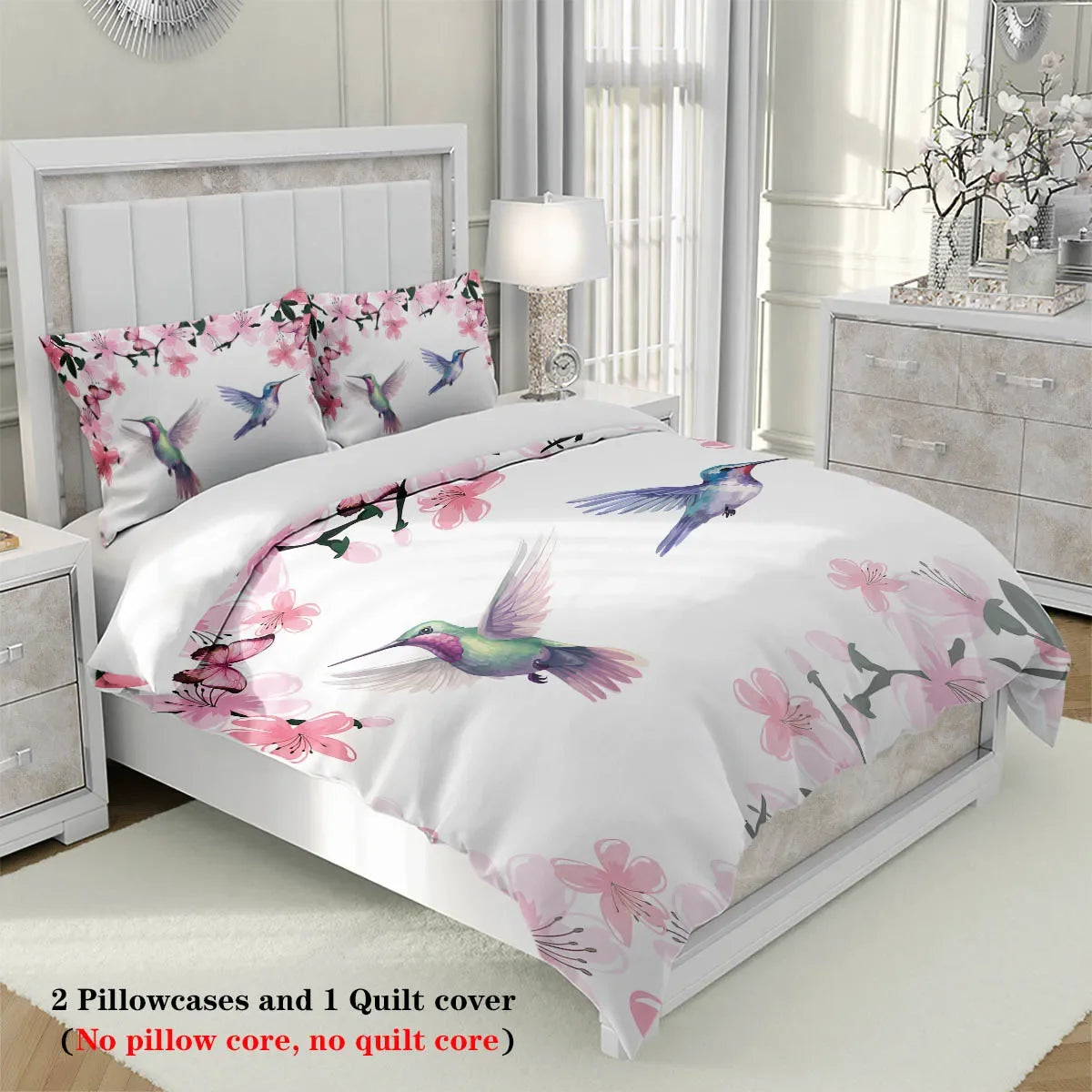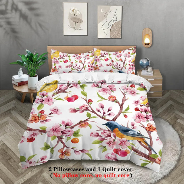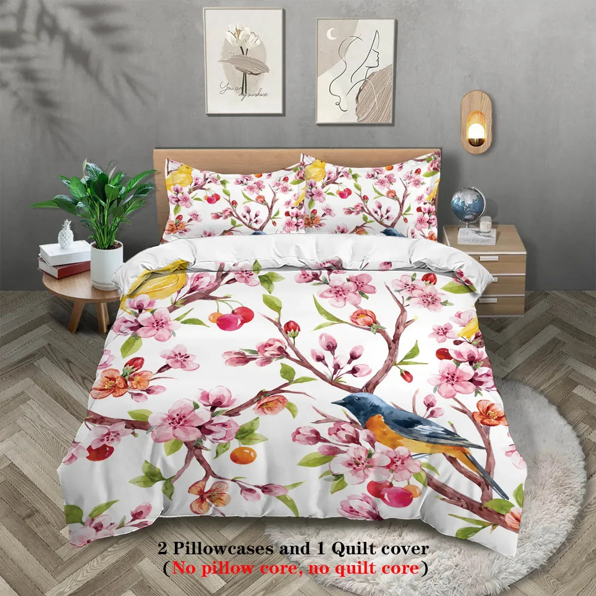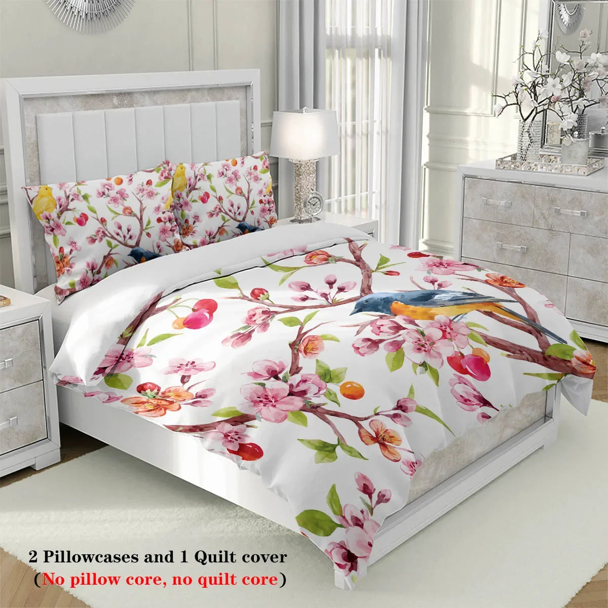 3pcs Spring Themed Bird and Flower Printed Bedding Set,For Bedroom, Guest Room (1*Duvet Cover + 2*Pillowc...