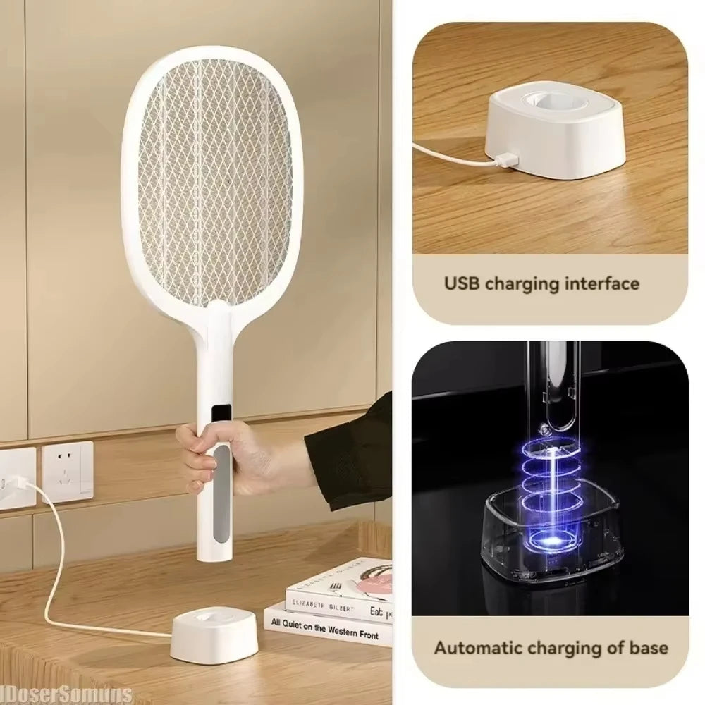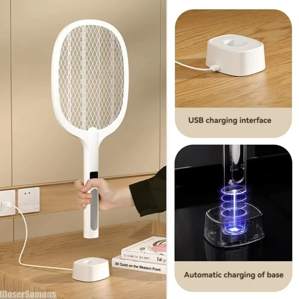 【2 in 1 Multi-function Flying Shooter Electric】In manual mode, continue to press the high-voltage working button to swing the electric mosquito killer manually. If you release the button, it will turn off the current mode in time. In automatic mode, the fly zapper is put into the charging base, the zapper will work automatically. The 5 LED beads will attract insects to the high voltage grid and then vibrate them.