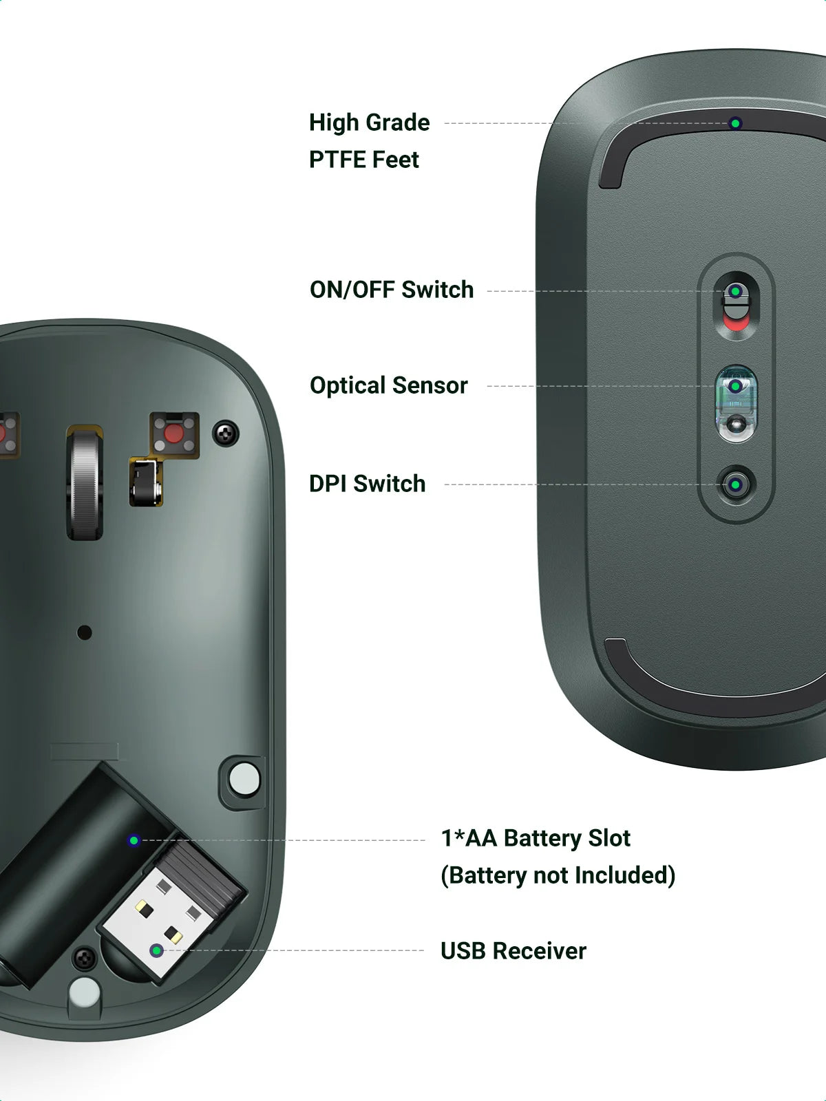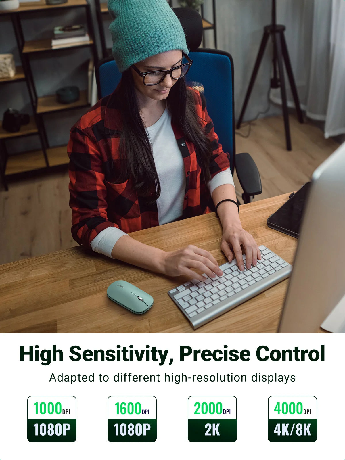El cambio de niveles de DPI de este mouse inalámbrico entre 1000/1600/2000/4000 para satisfacer sus necesidades especiales con mayor sensibilidad.Restaura con precisión los movimientos bajo operación de alta velocidad, perfectamente para pantalla HD 4K/8K.