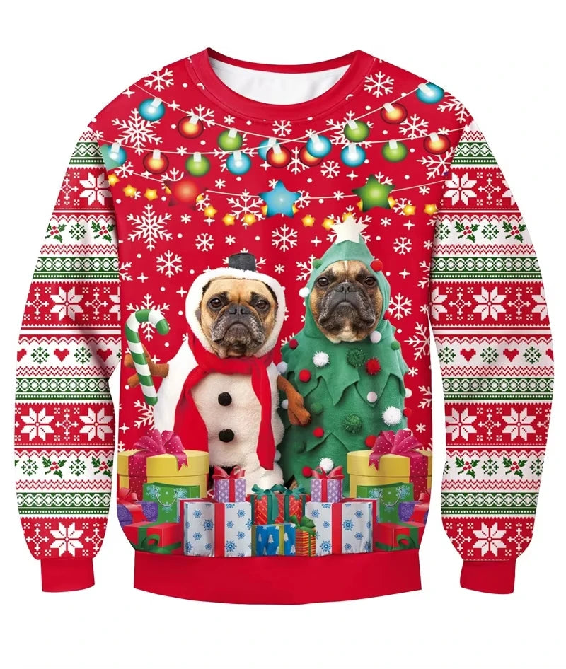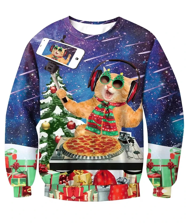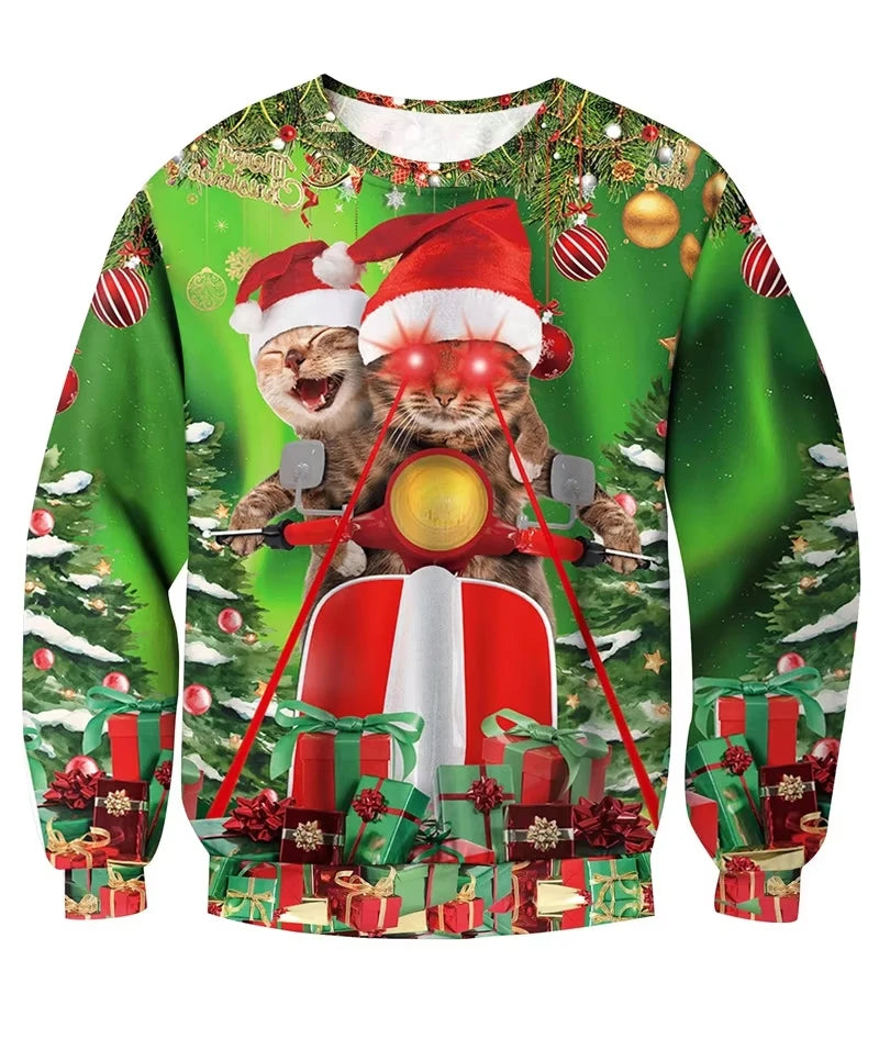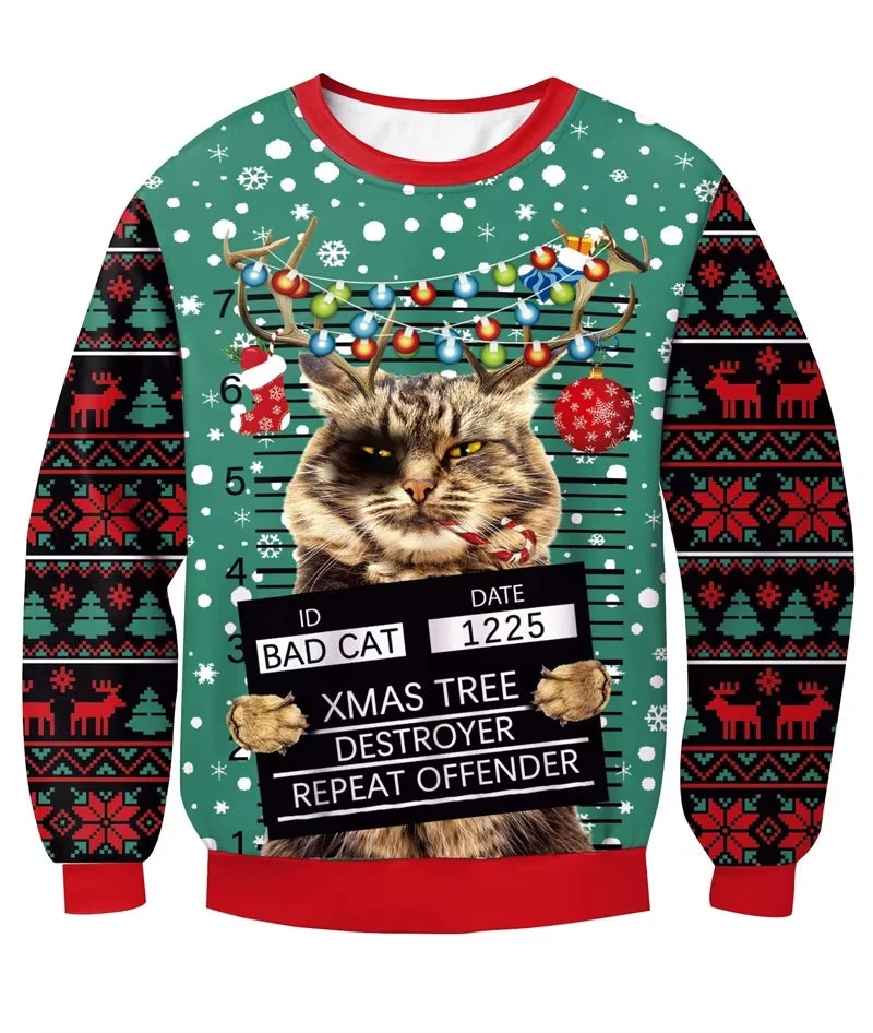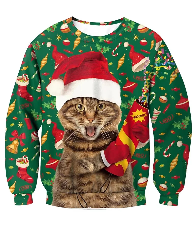 Unisex Ugly Christmas Cat Print Sweatshirt Funny Animal 3D Graphic Crew Neck ...