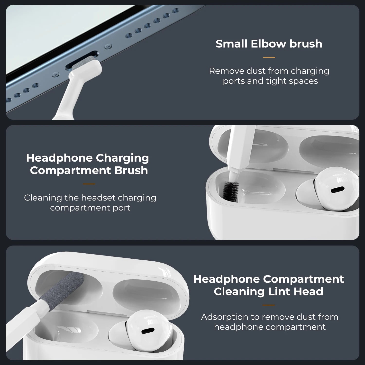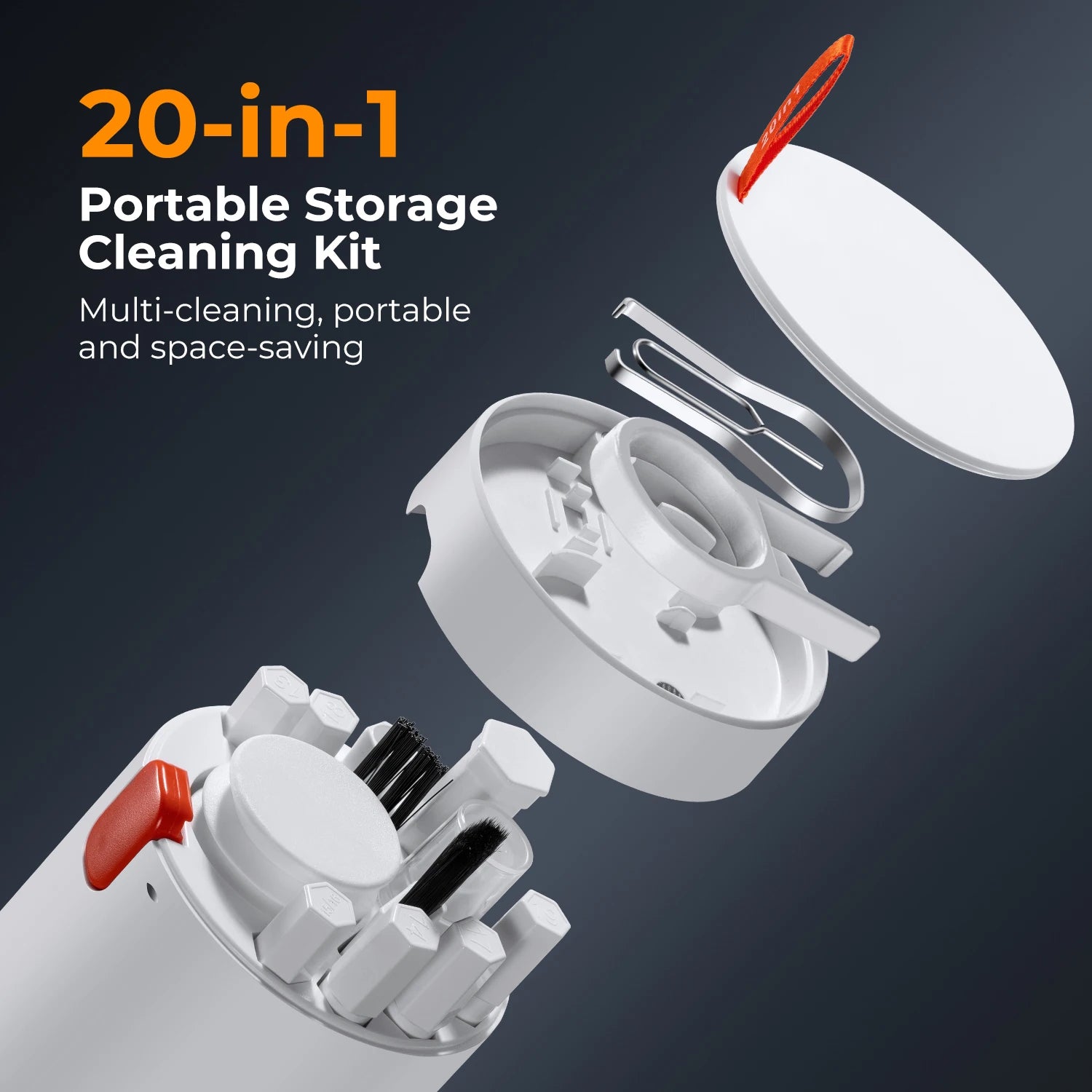 20pcs in one cleaning kit: Earphones cleaner pen, flocking sponge, mini soft brush, len brush, earphone case cleaning brush, and camera brushes