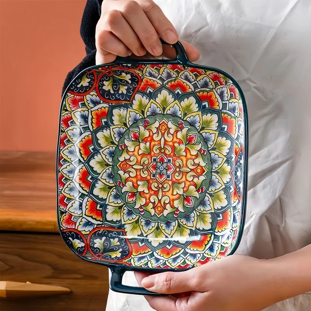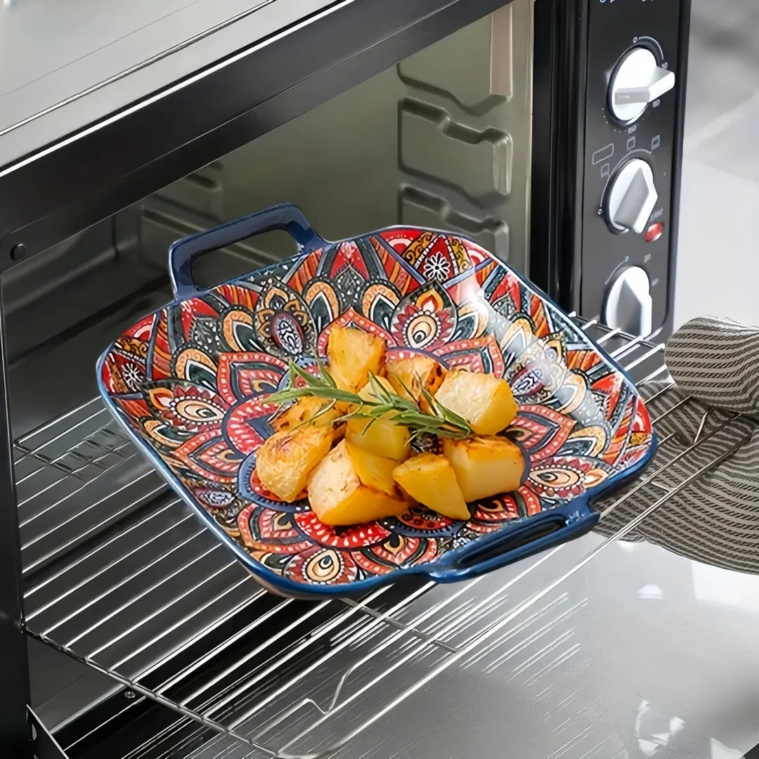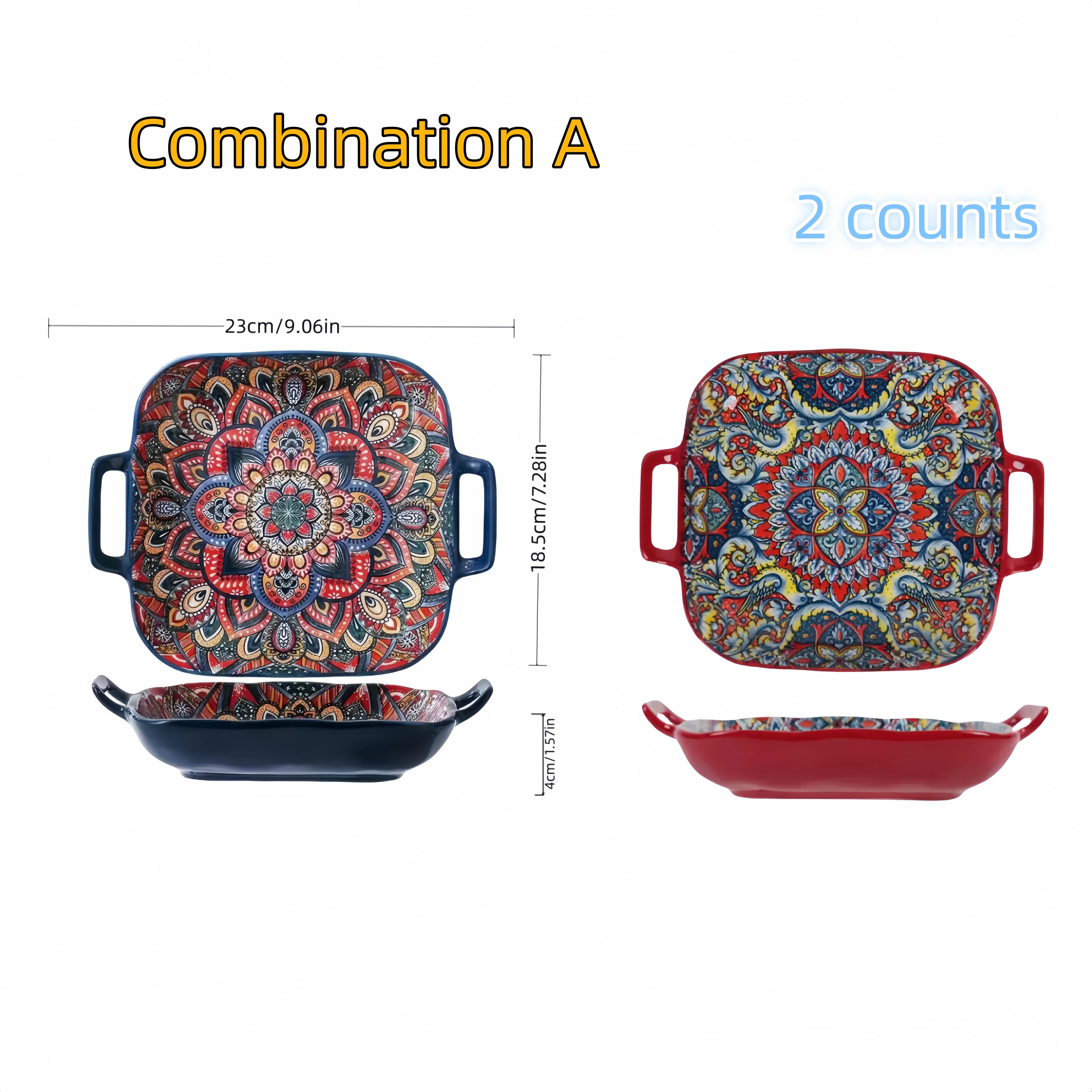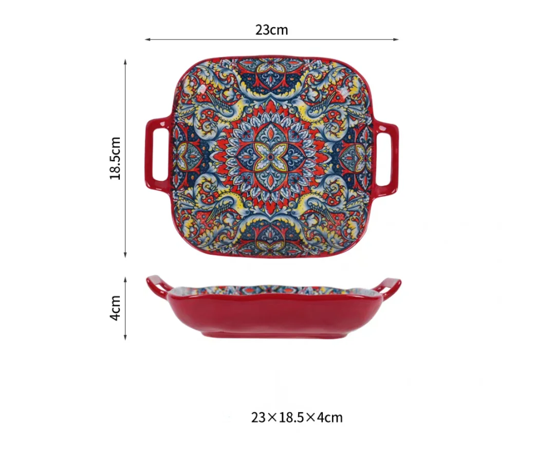 Bohemian double ear square ceramic plate creative household dish plate net red fruit spaghetti plate oven...
