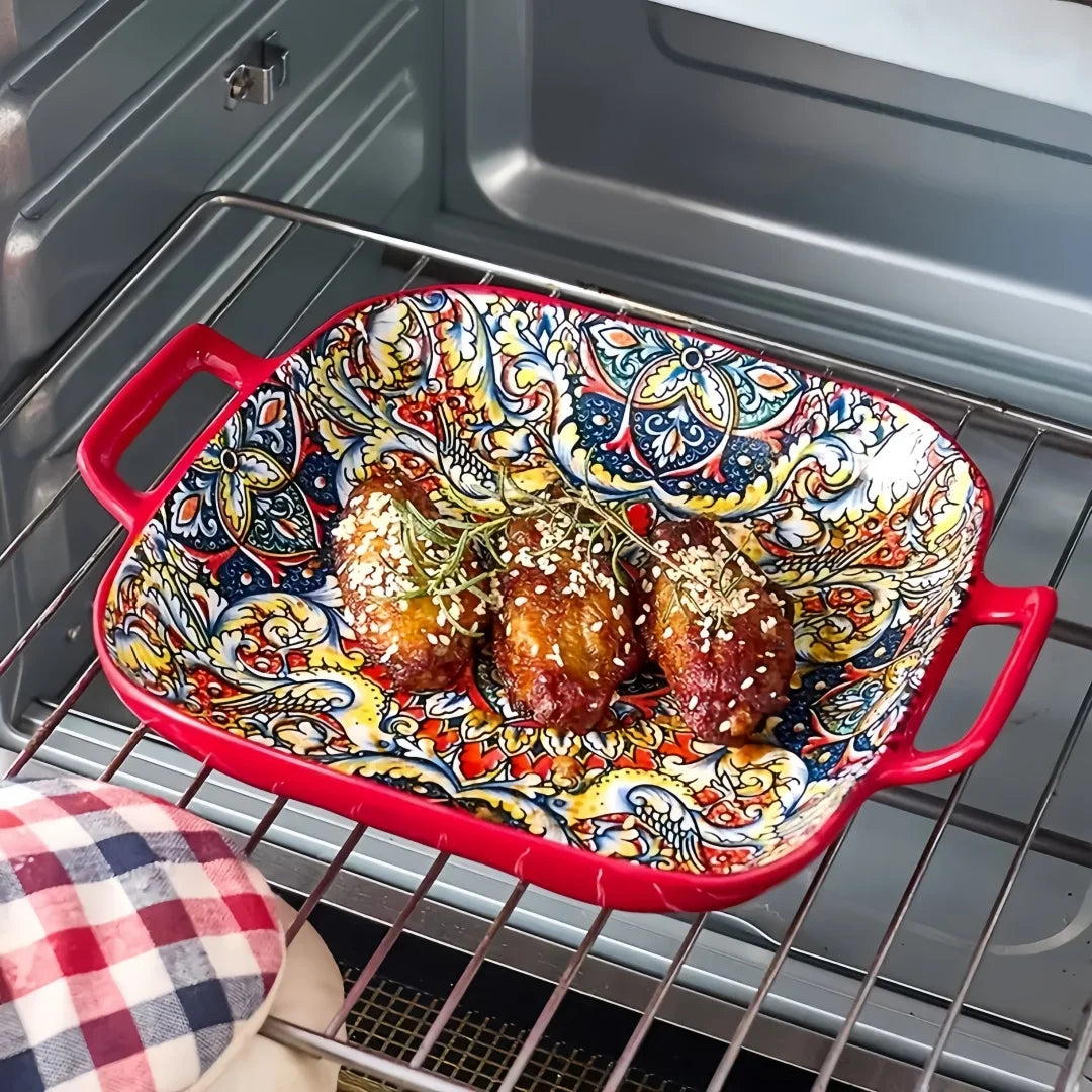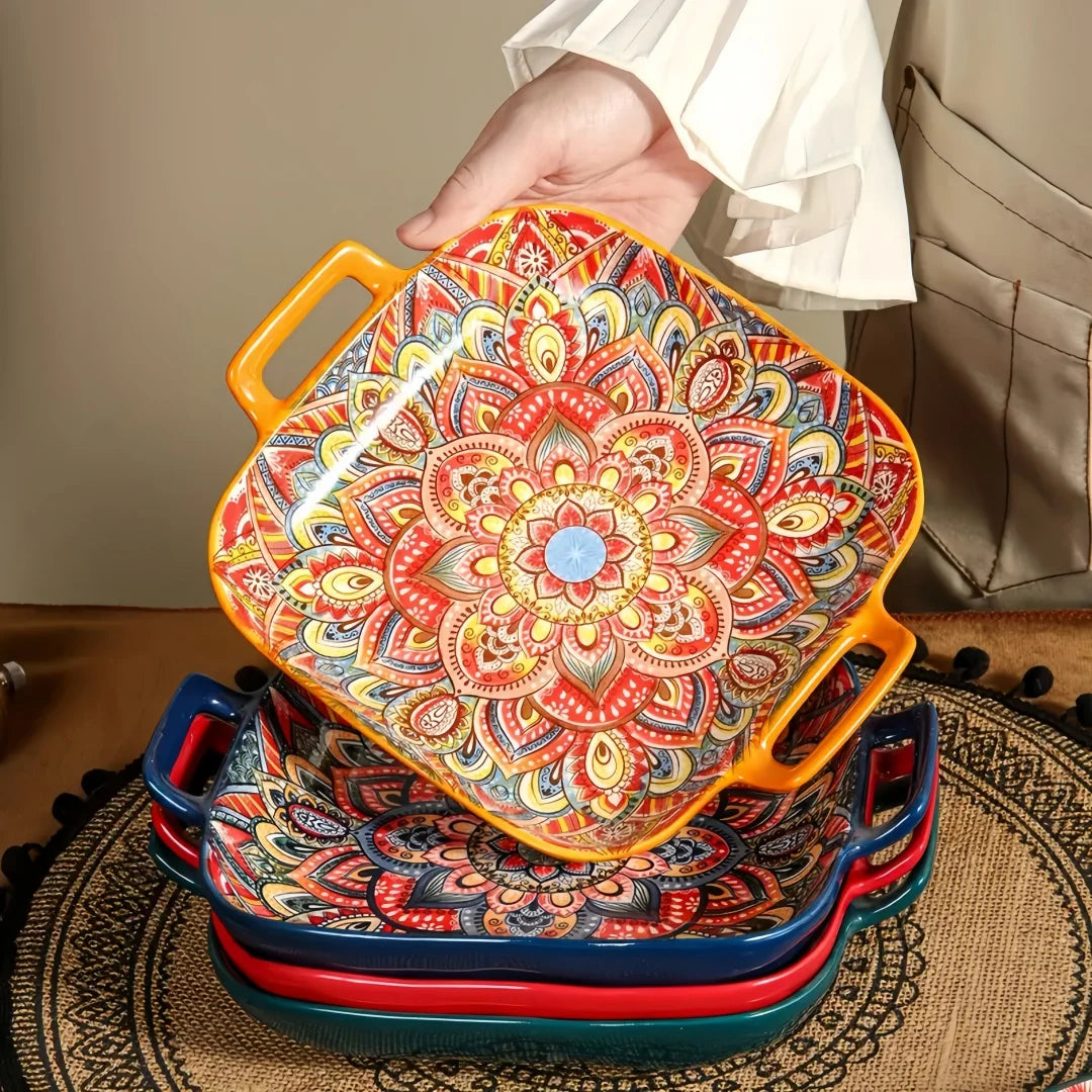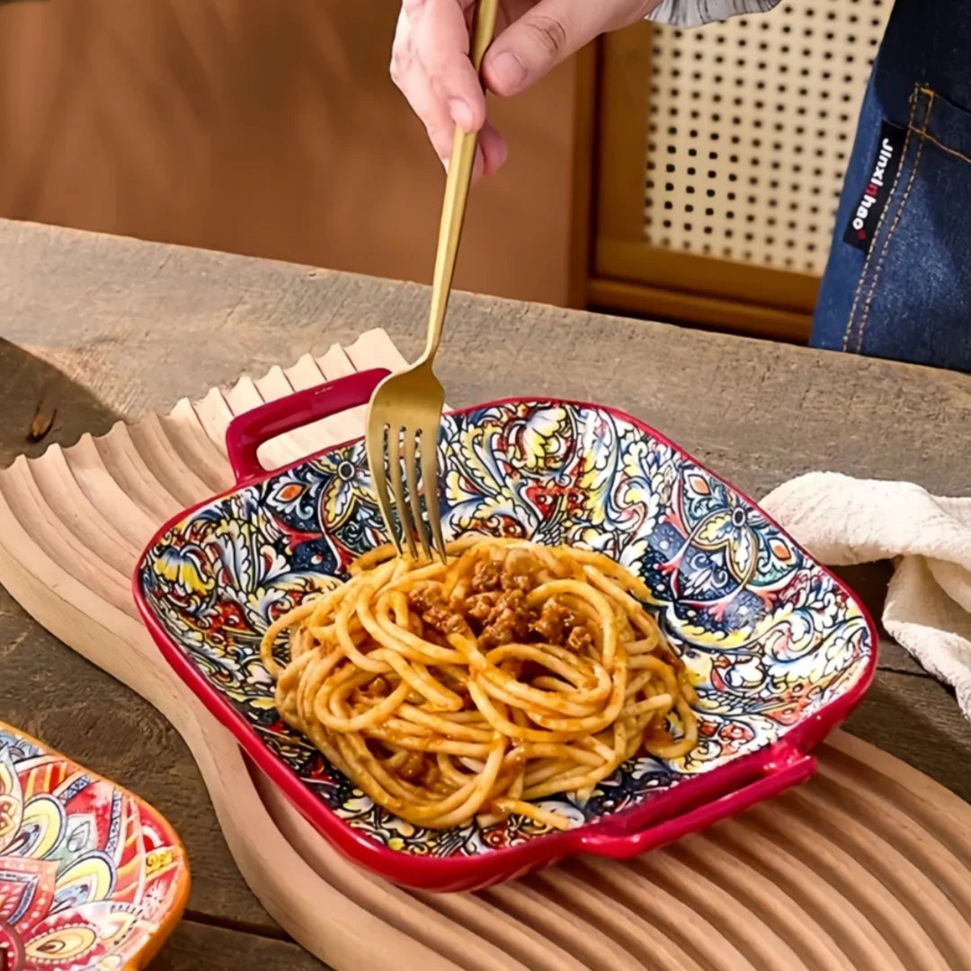 Bohemian double ear square ceramic plate creative household dish plate net red fruit spaghetti plate oven...