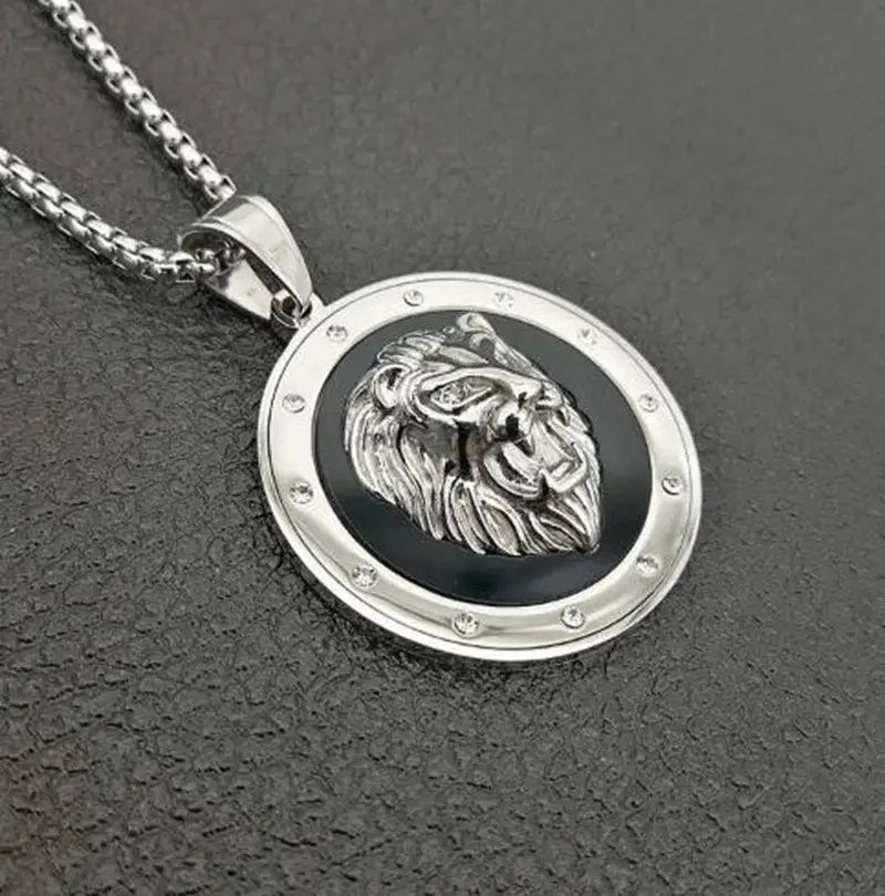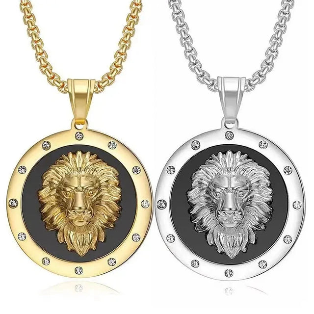 Fashion Domineering Lion Head Round Medal Pendant Necklace Inlaid Zircon Men's Hip Hop Trend Party Jewelry