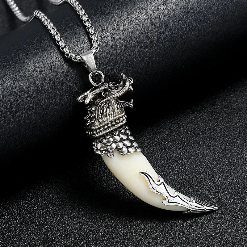 Fashionable Silver Wolf Head Natural Stone Wolf Tooth Pendant Dragon Head Necklace Men\'s Rock and Roll M...