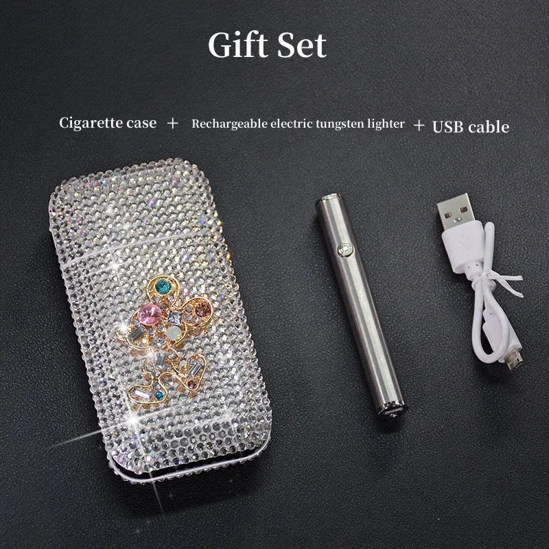 Luxury Rhinestone Cigarette Box with USB Charging Lighter Windproof Portable