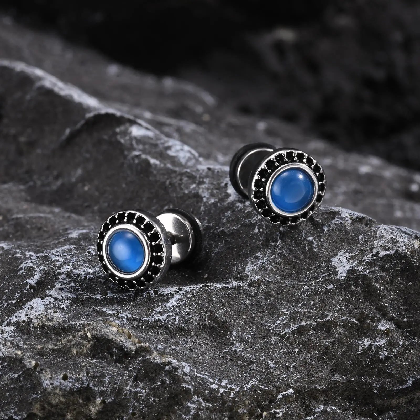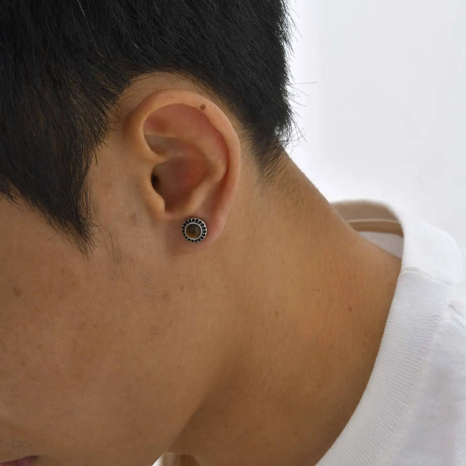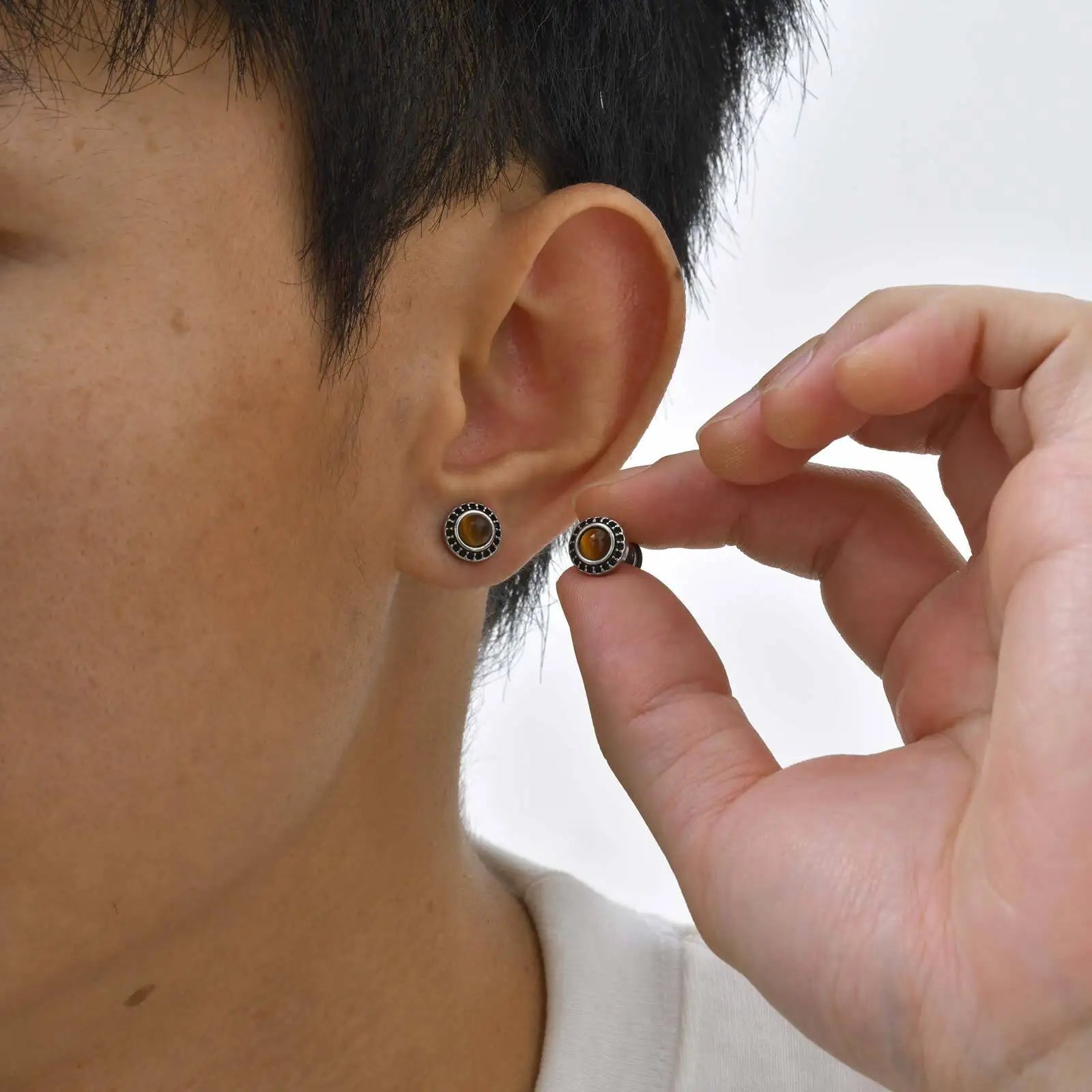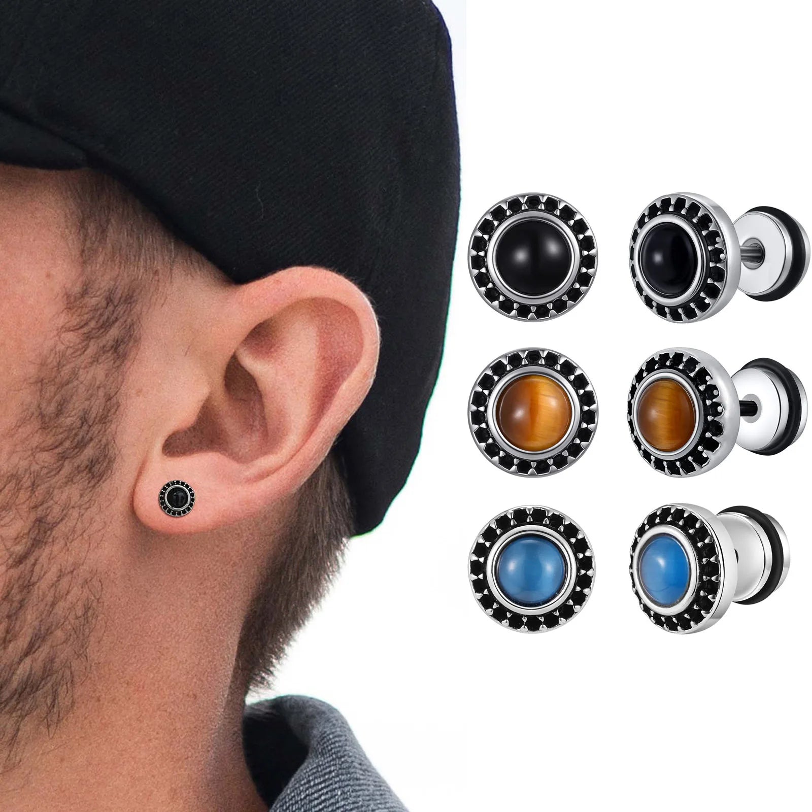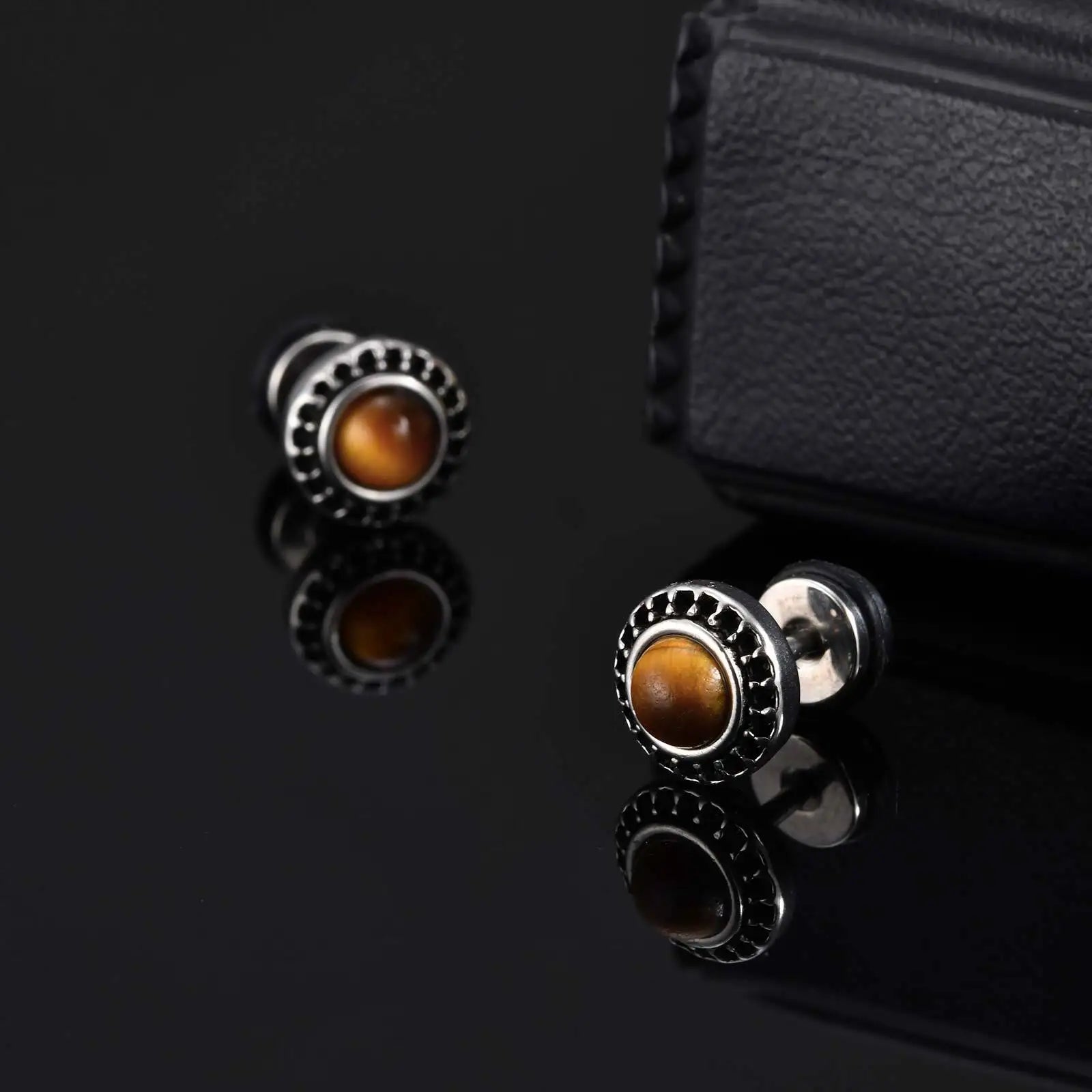 Punk Natural Stone Stud Earrings for Men Boys, Tiger Eye Stone Round Earrings
