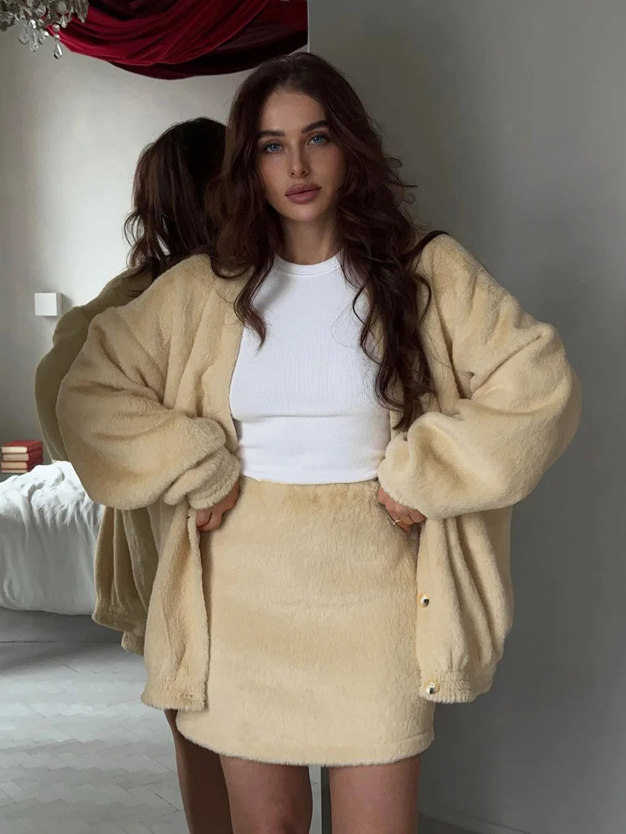 Bornladies Women s Plush V neck Knit Cardigan Short Skirt Set Autumn Winter