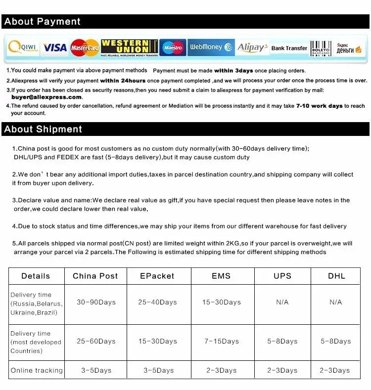 2)If you are not happy with our products and services, please feel free to contact us before you submit a negative feedback. Once there is a problem reported, all of our staffs will try best to help you out of the issue occurred. Thank you for your understanding.