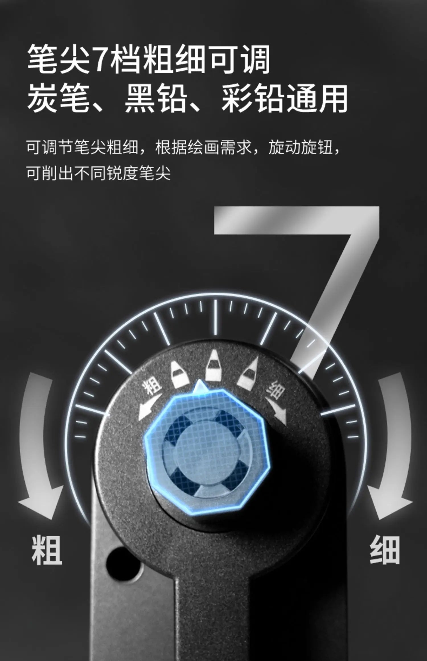 【Adjustable Pencil Nib with Sandpaper】The sharpness of the nib can adjustable by rotate the knob on the handle. If you want a NEEDLE SHARP point, use the black sandpaper embedded in the shavings box.