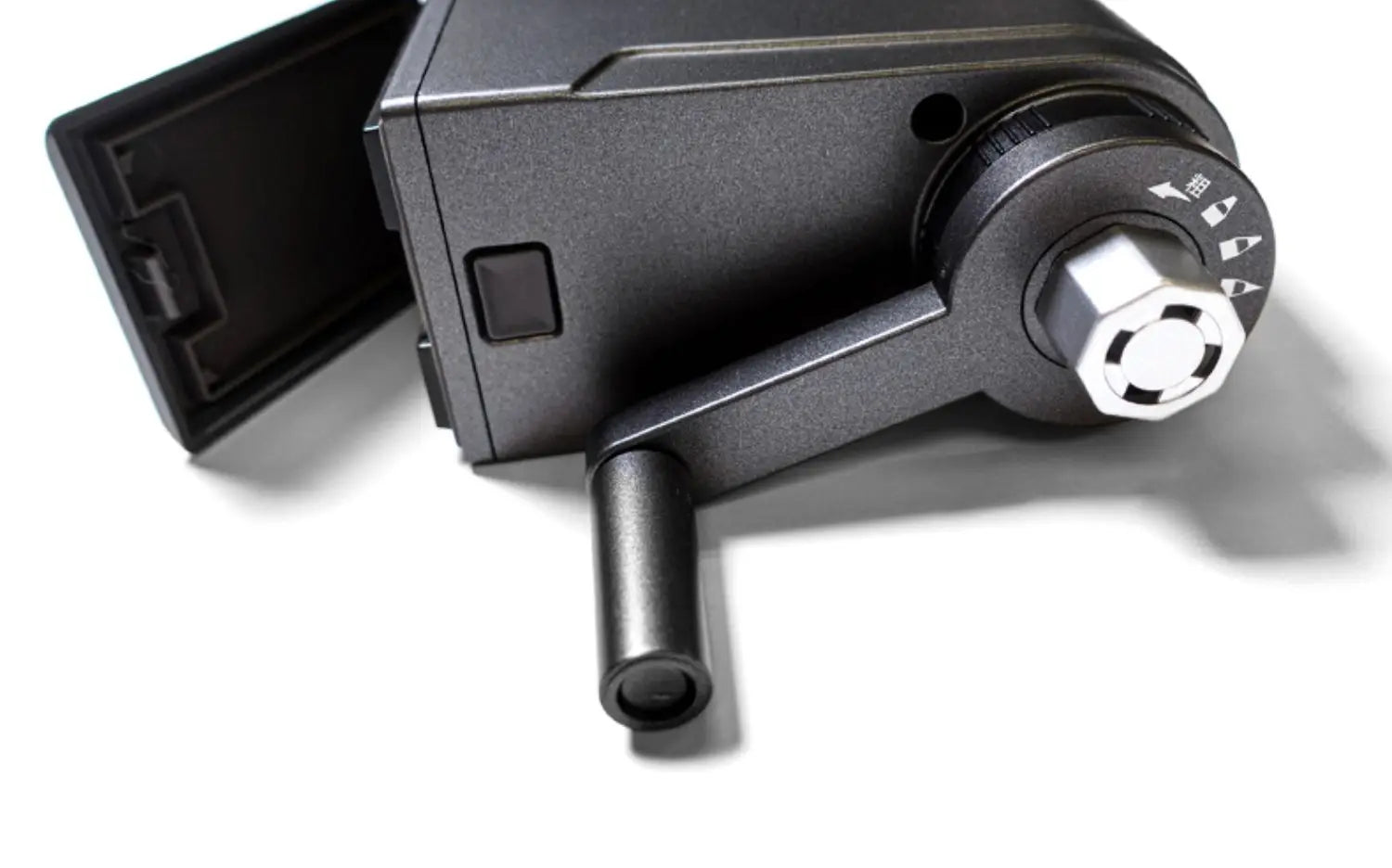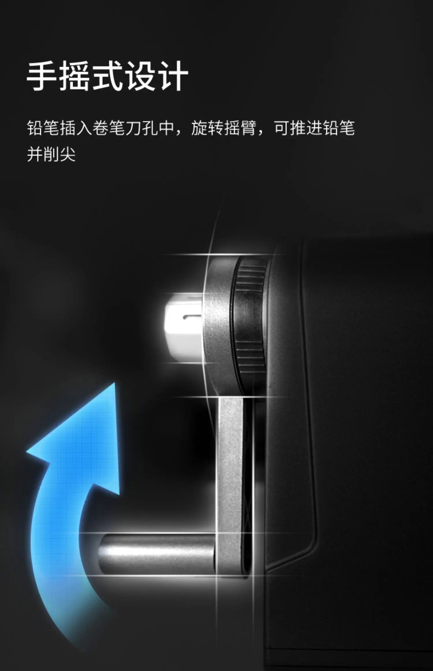 2. Insert the pencil into the hole and rotate the rocker arm clockwise to advance the pencil and sharpen it
