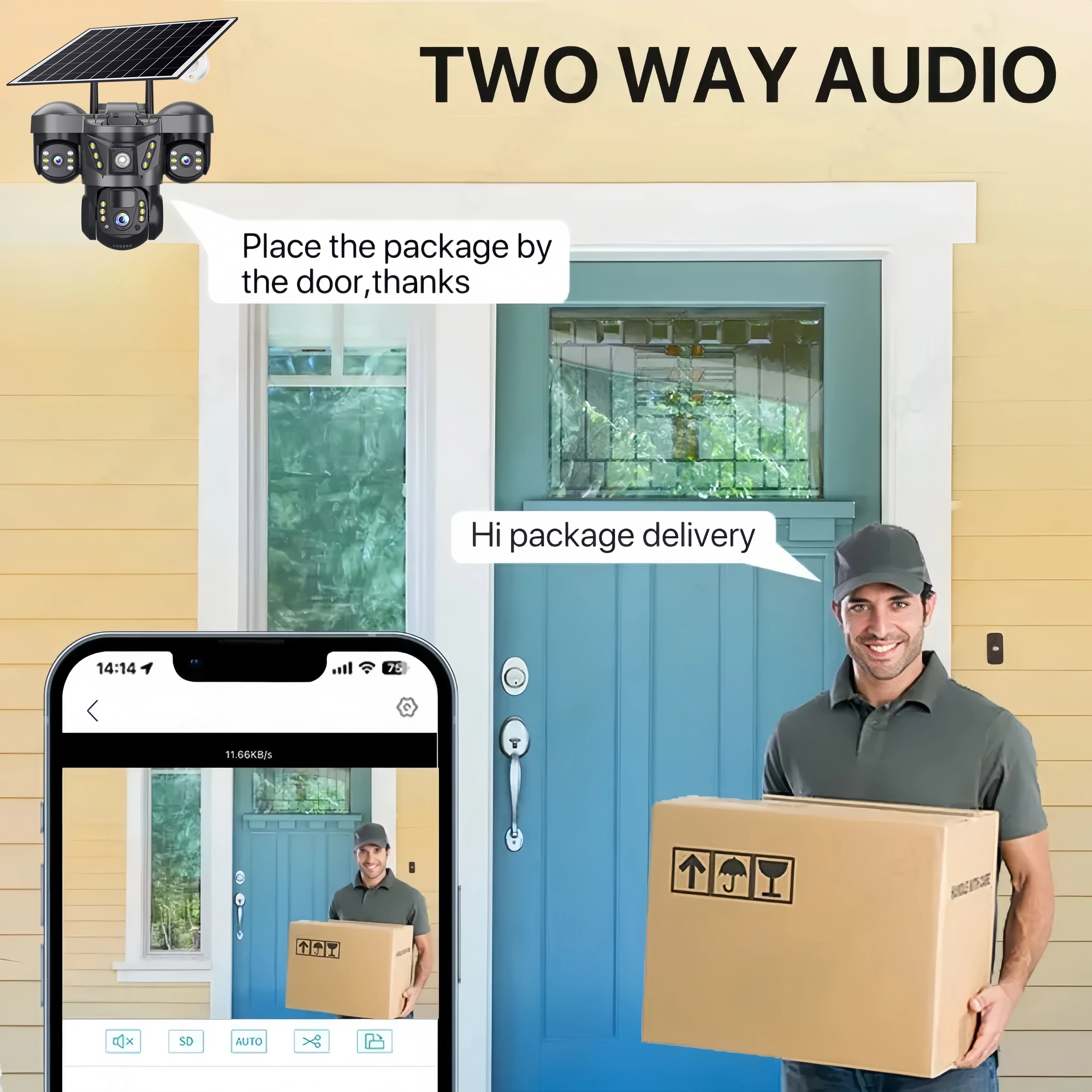 Built-in microphone and speaker / ustomized new speakers with loud volume; You could talk to anyone nears the camera ( Warn someone to leave your house ).
