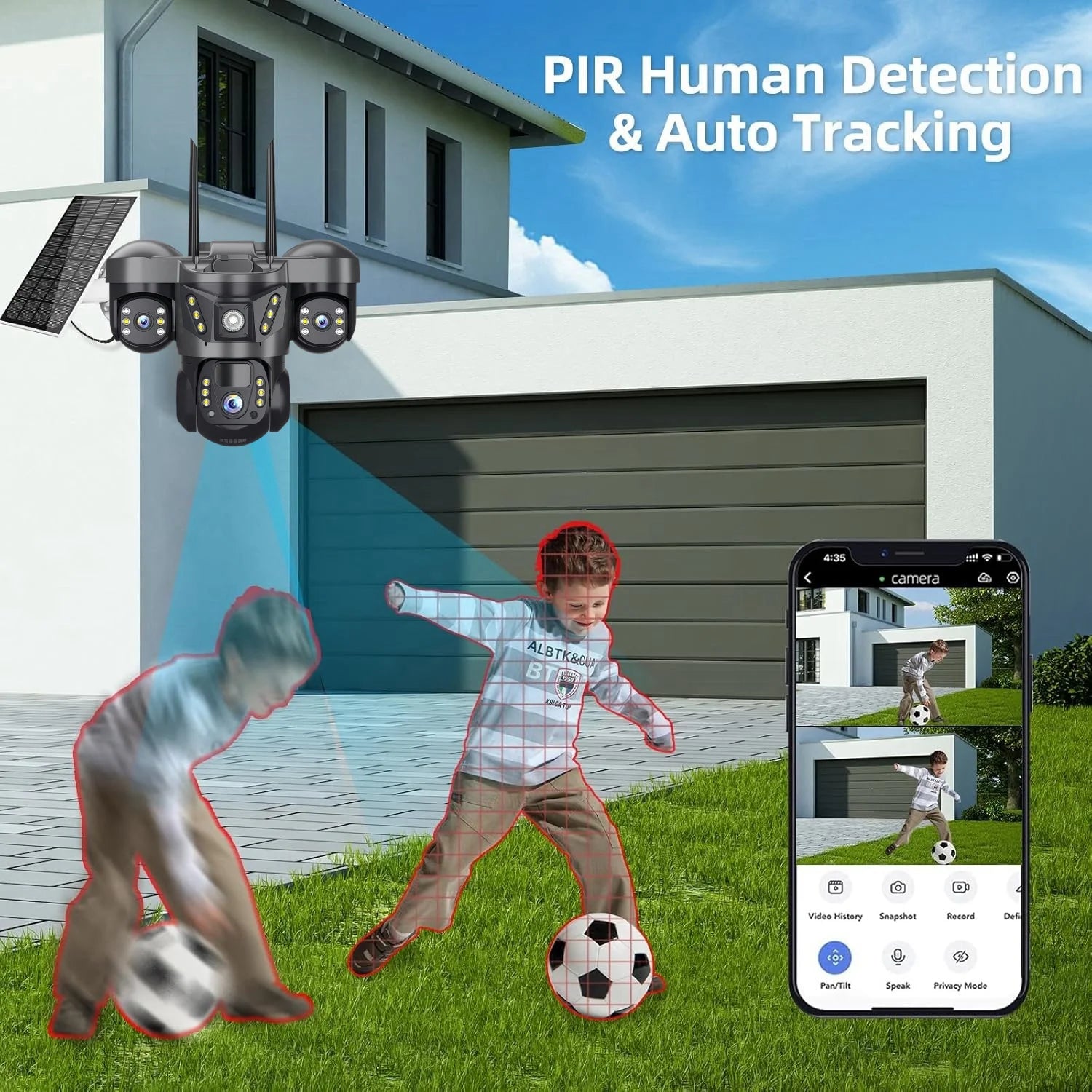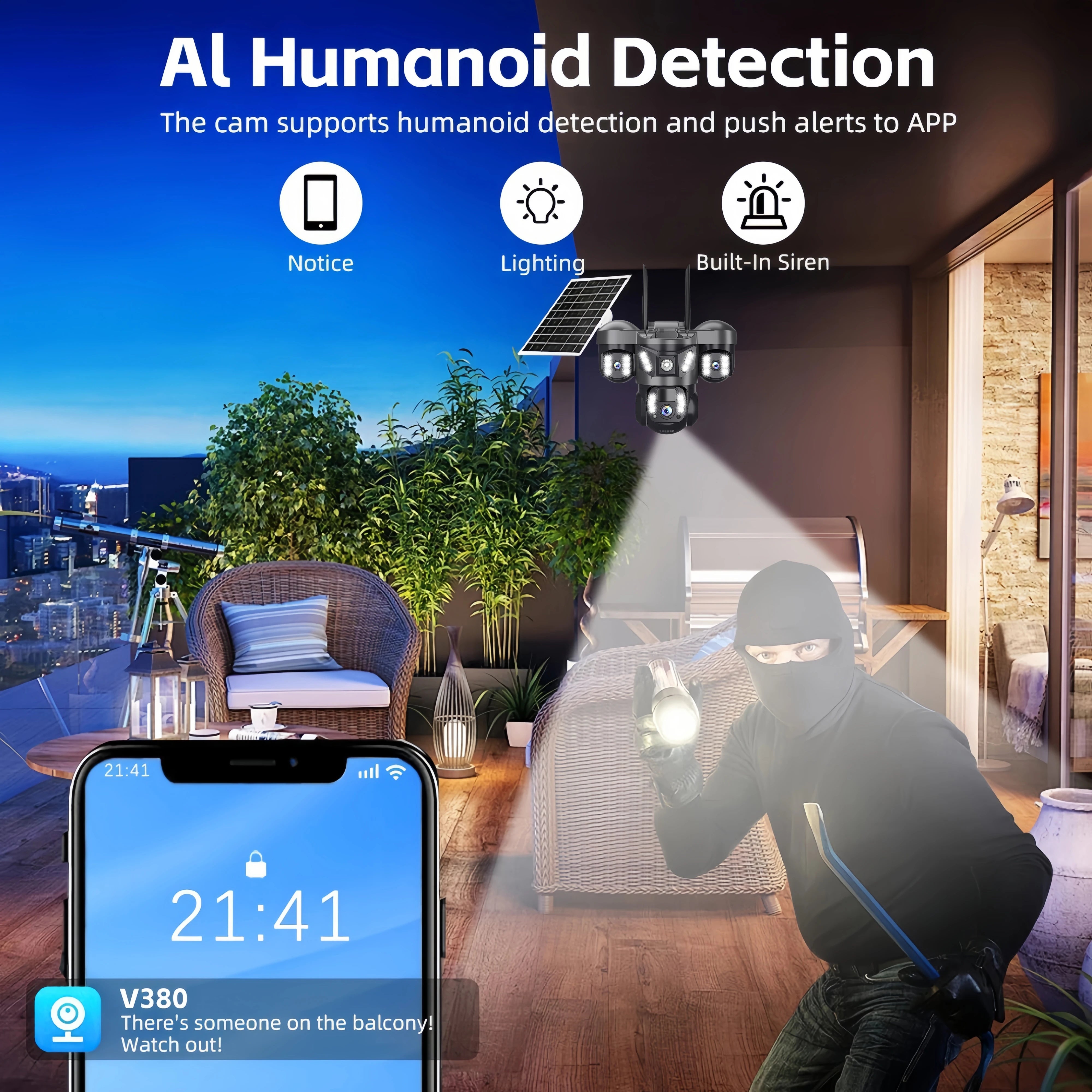 Quickly finds human targets and immediately sends a notification to your phone, letting you see what happens anywhere. It only detects the human shape and will not trigger falsely for objects such as cars and trees.