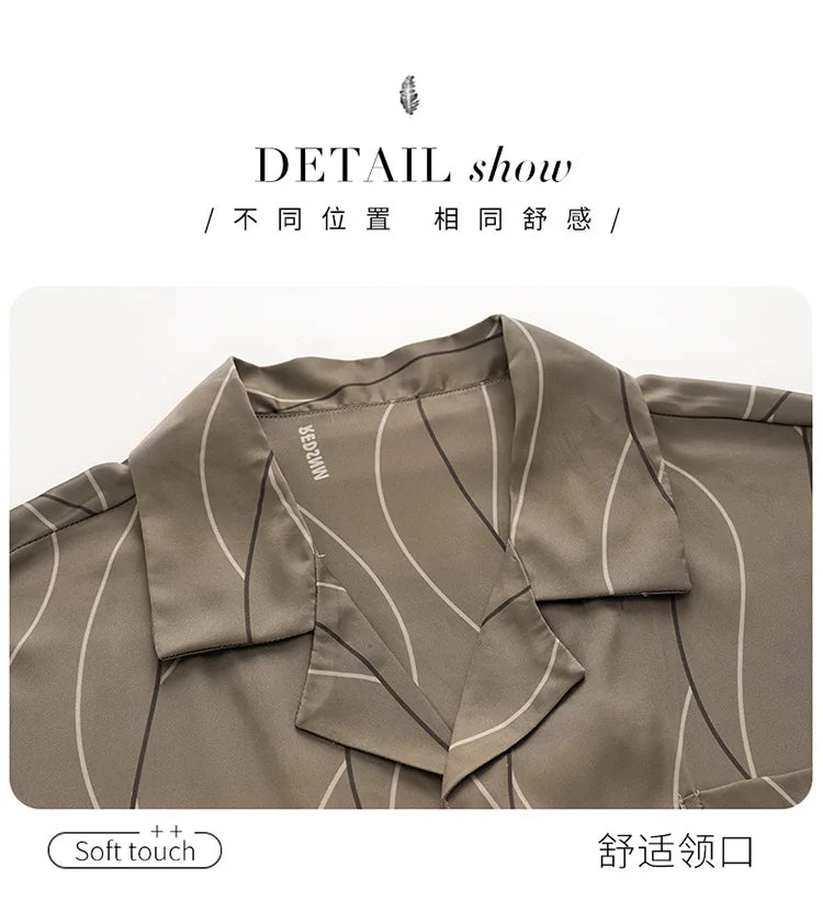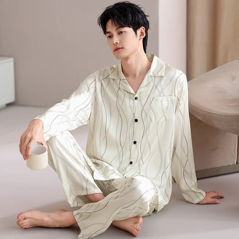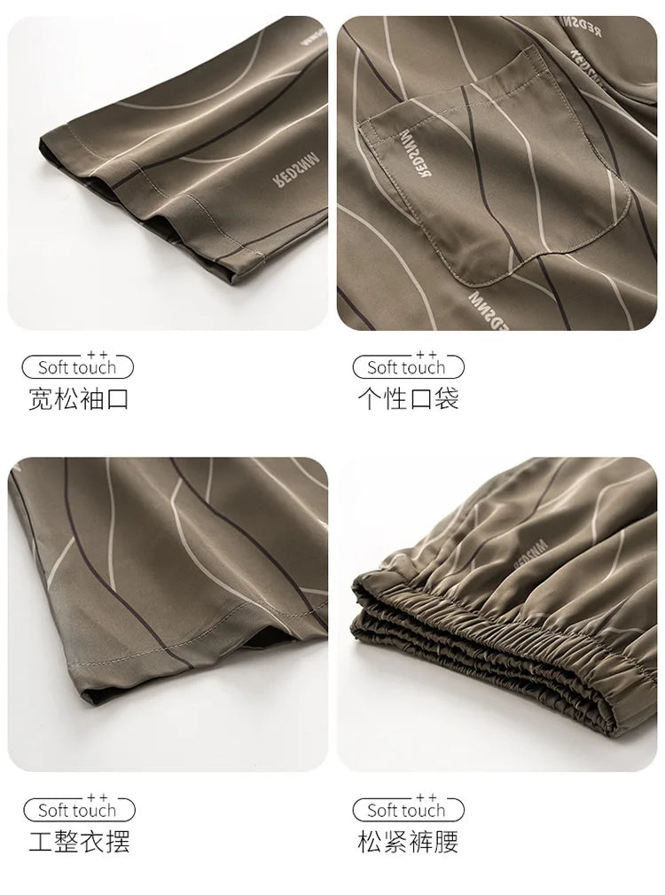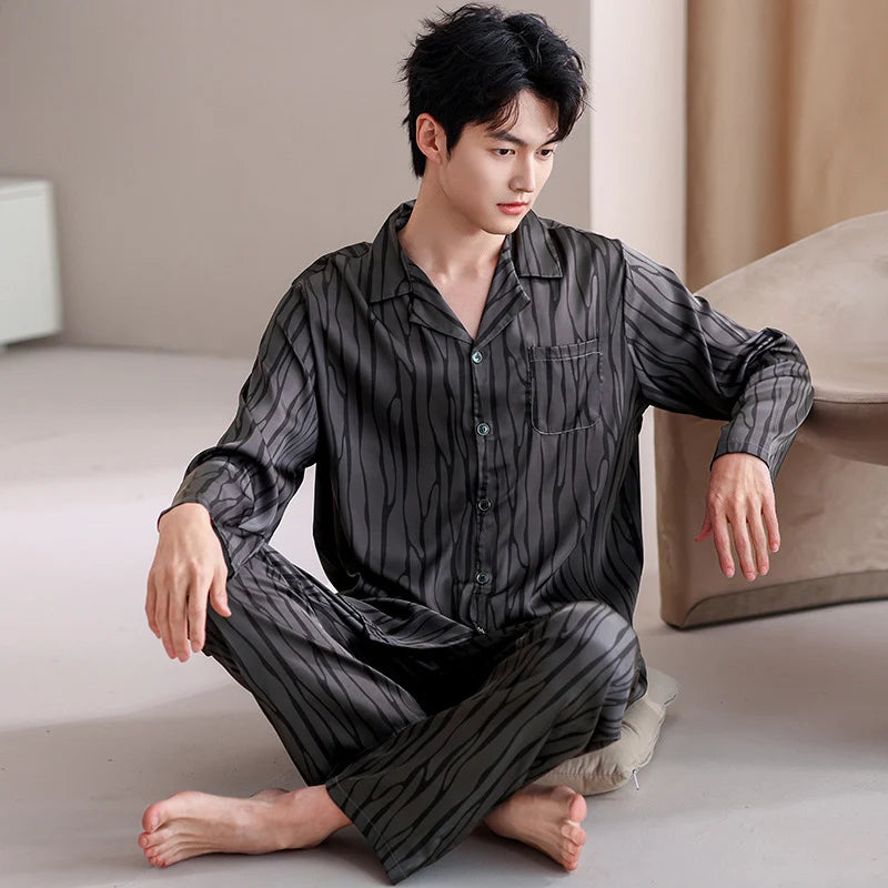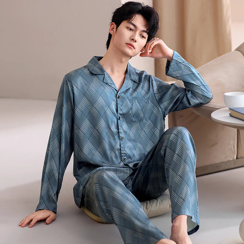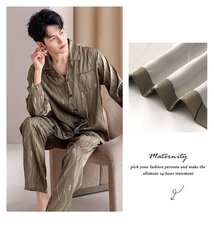 Men's Plus Size Pajamas Set Loungewear Spring Autumn Ice Silk Long Sleeved Trouser Pijama Mujer Male Casu...