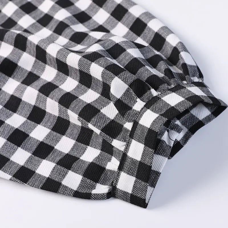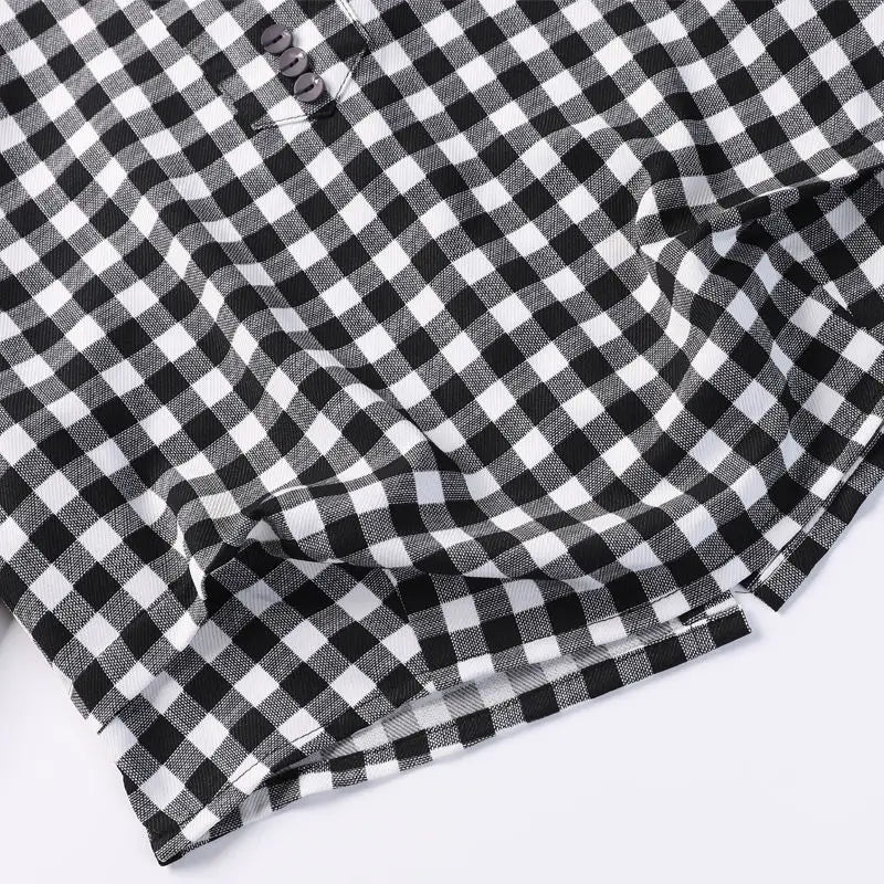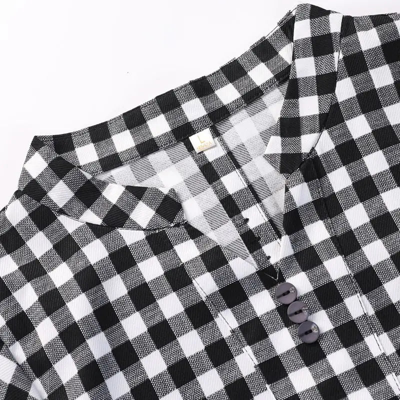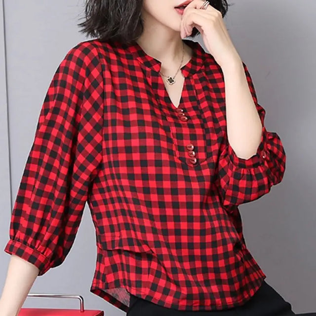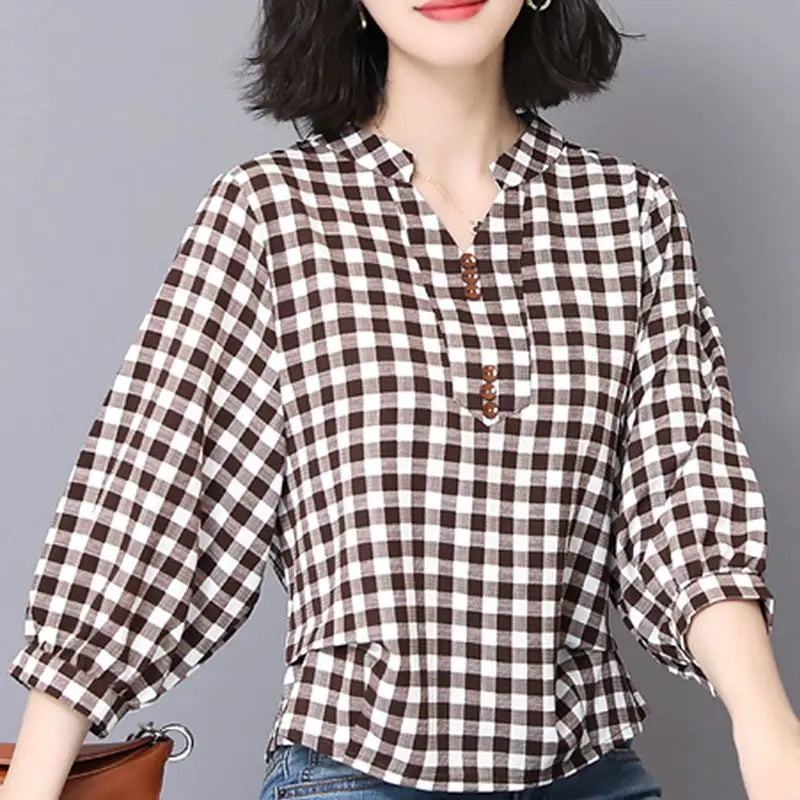 Spring Summer Women's Button V-Neck Plaid Striped Pullover Solid Lantern Three Quarter Shirring T-shirt C...