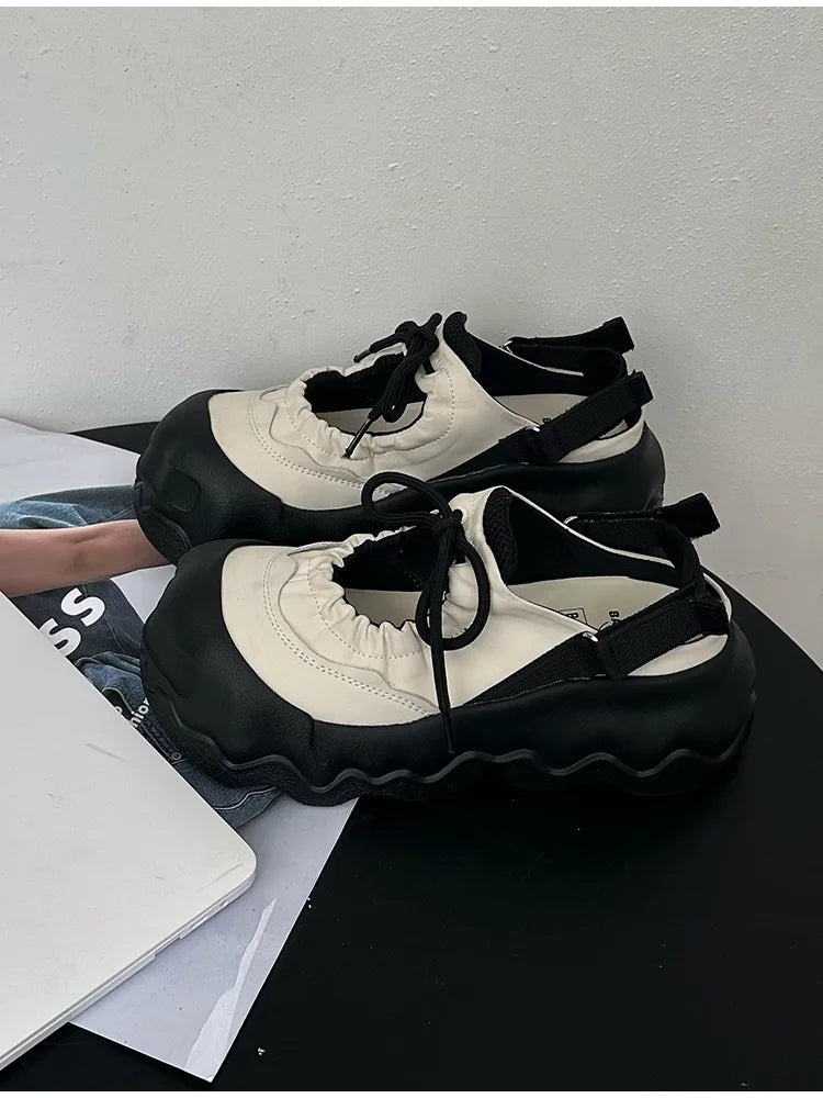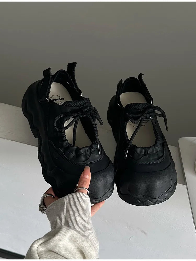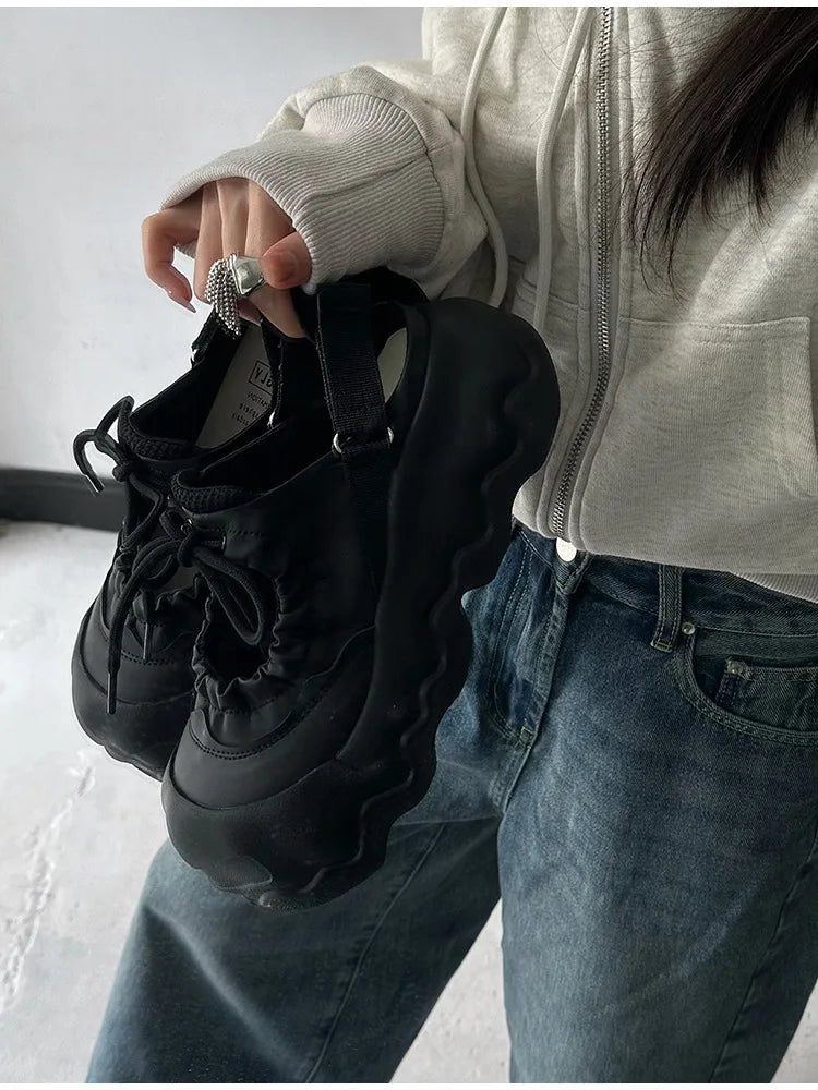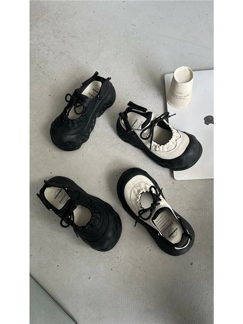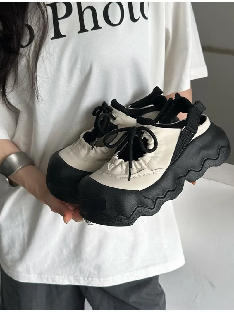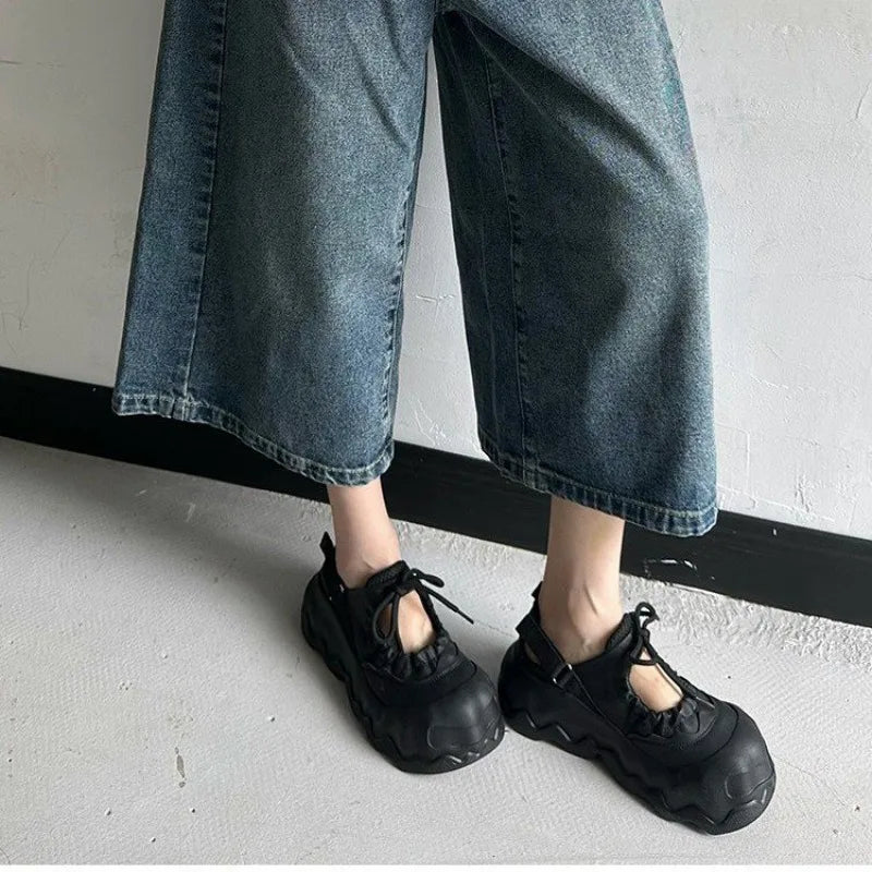 Summer Street Explosion 5CM Mary Jane Sandals Women's Wave Thick Bottom Lace Hollow Big Head Bread Shoes