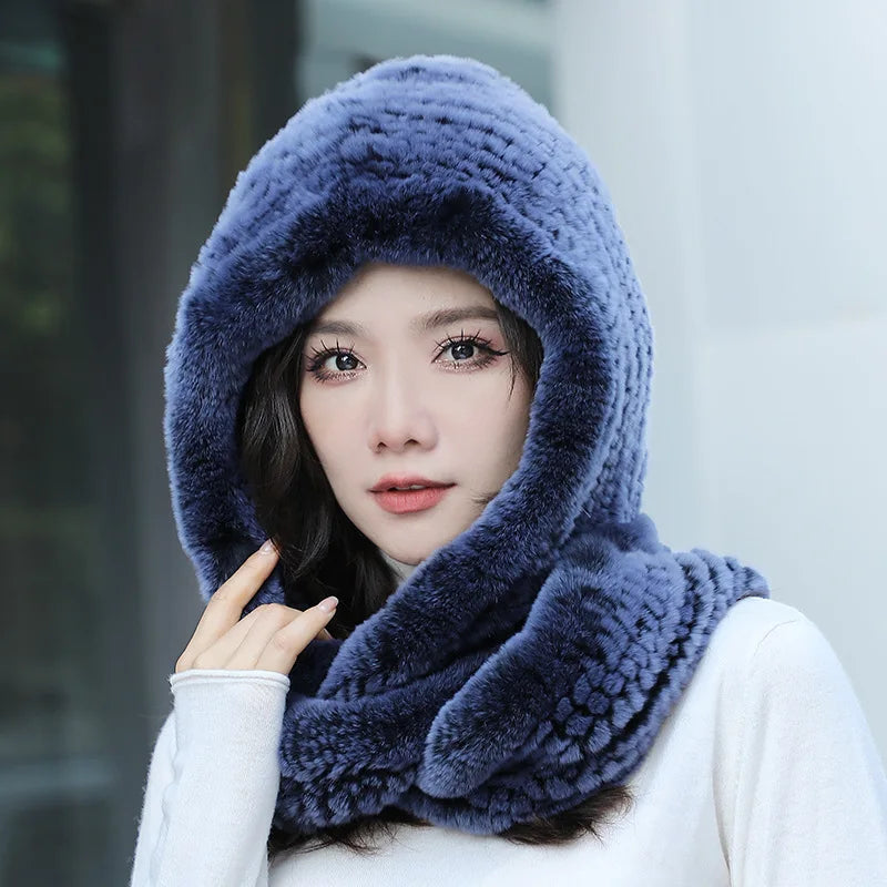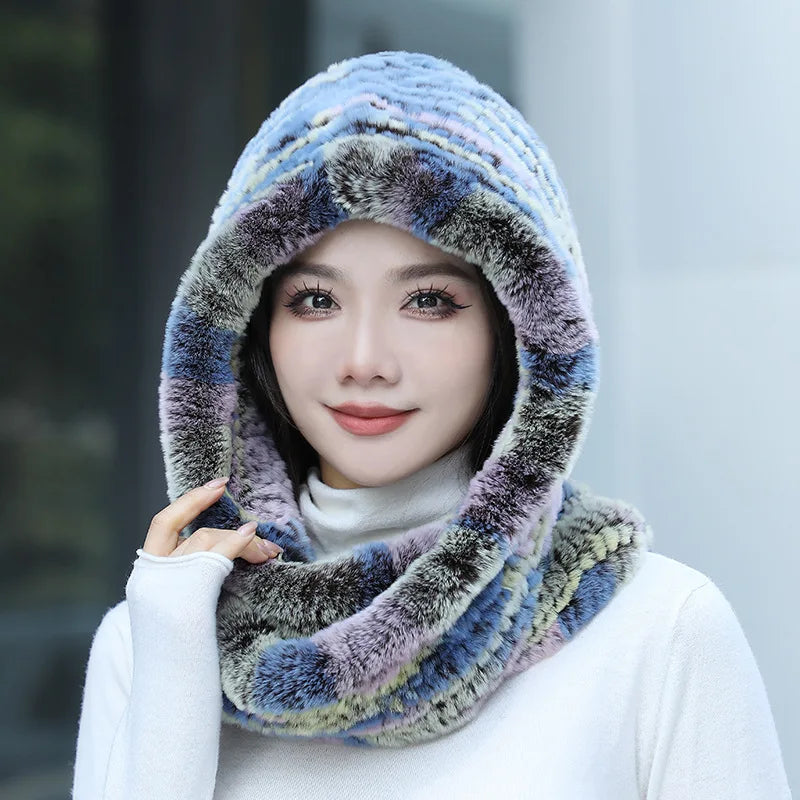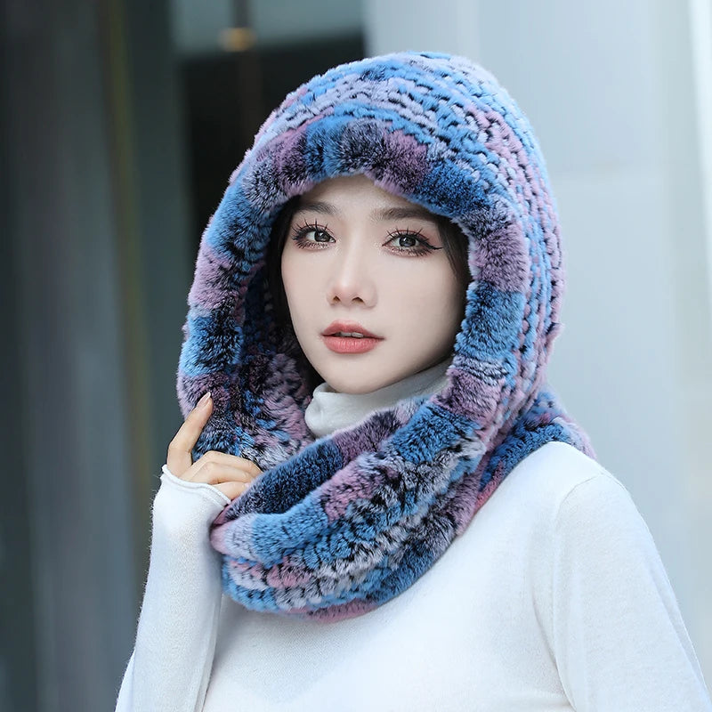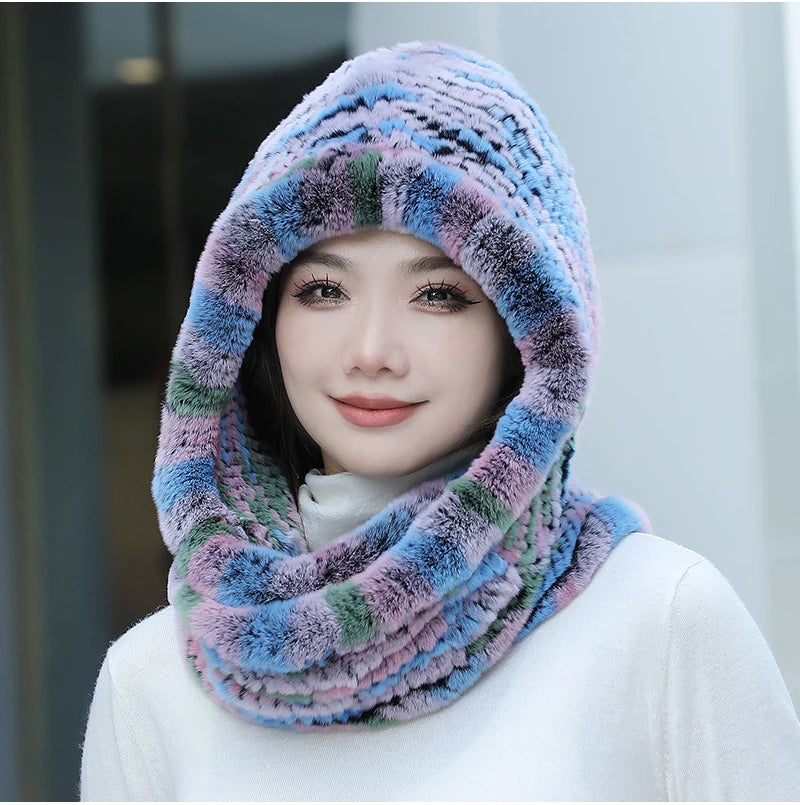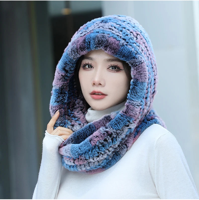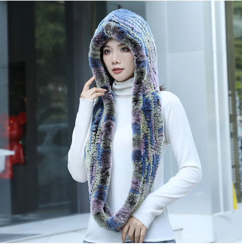 Women Real Knitted Rex Rabbit Fur Hat Hooded Scarf Long Winter Warm Fur Hat W...