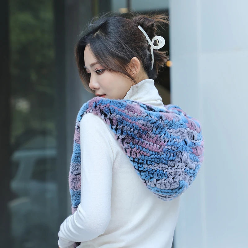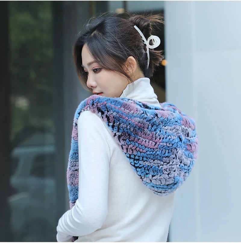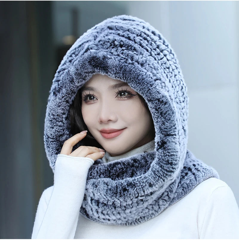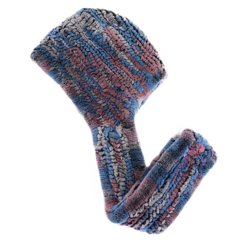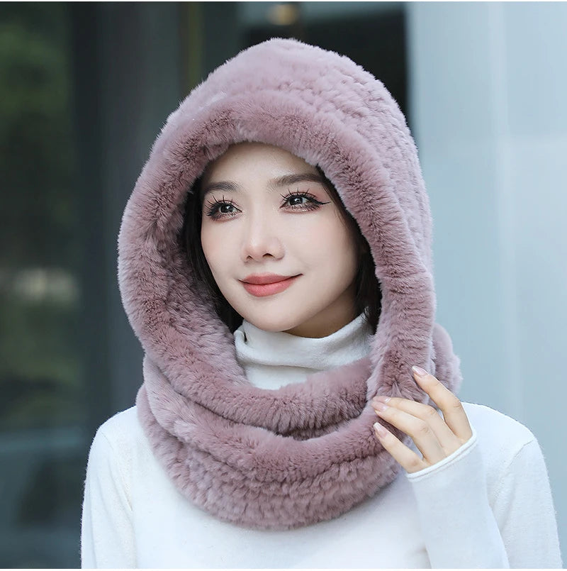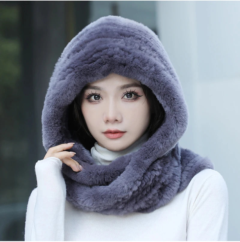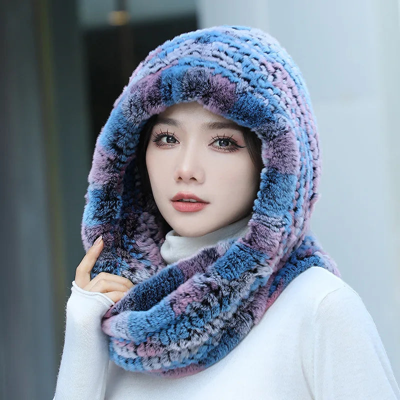 Women Real Knitted Rex Rabbit Fur Hat Hooded Scarf Long Winter Warm Fur Hat W...
