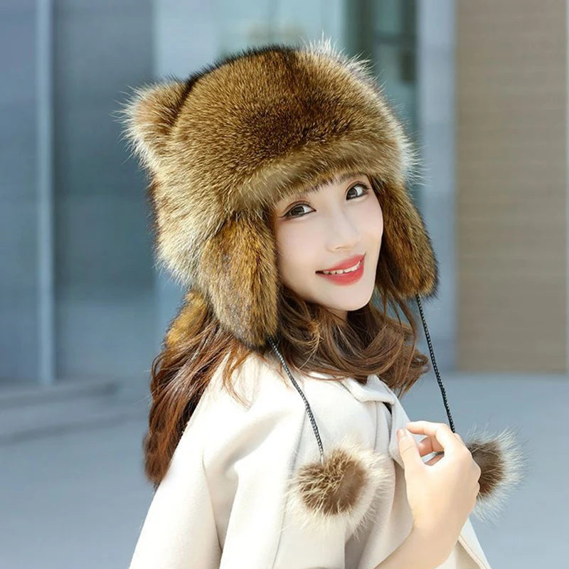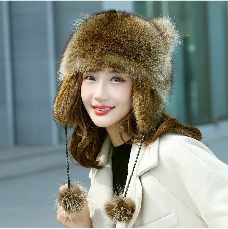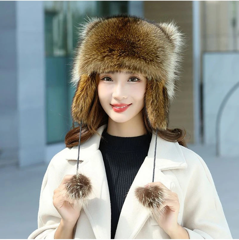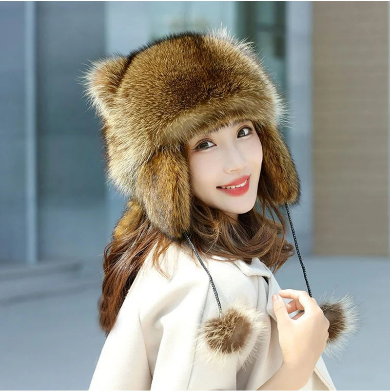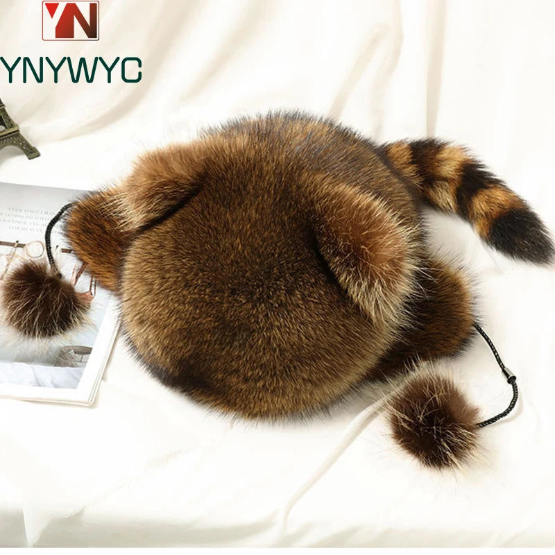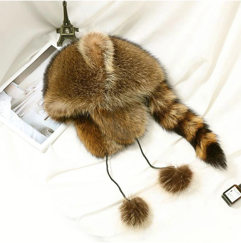 Lady Real Raccoon Fur Cap Tail Women Natural Raccoon Fur Caps Ushanka Hats fo...