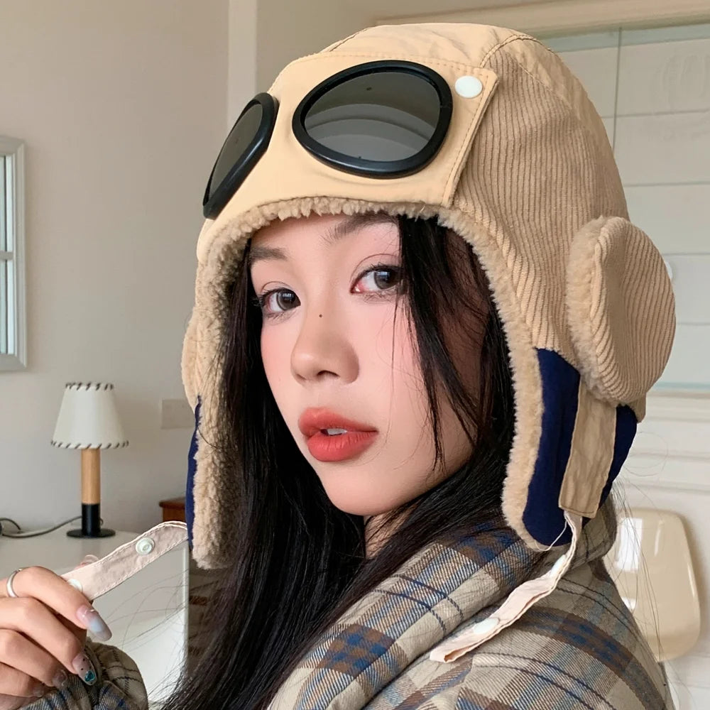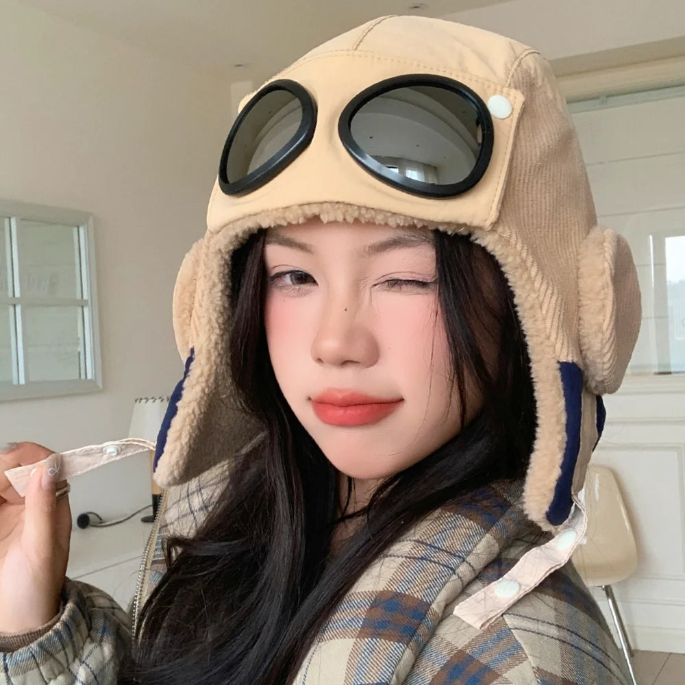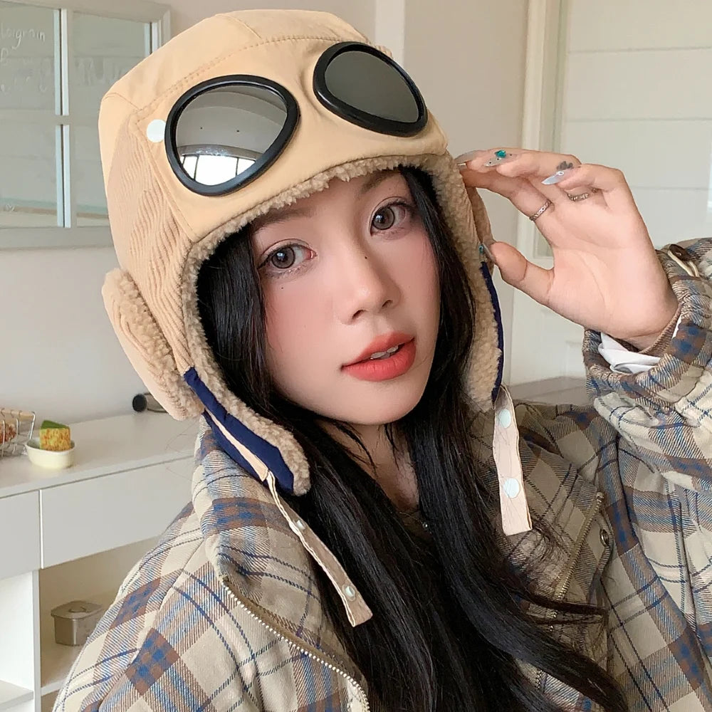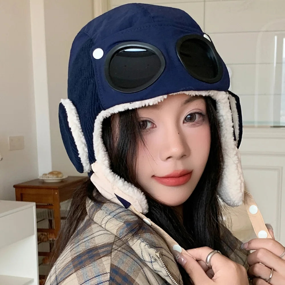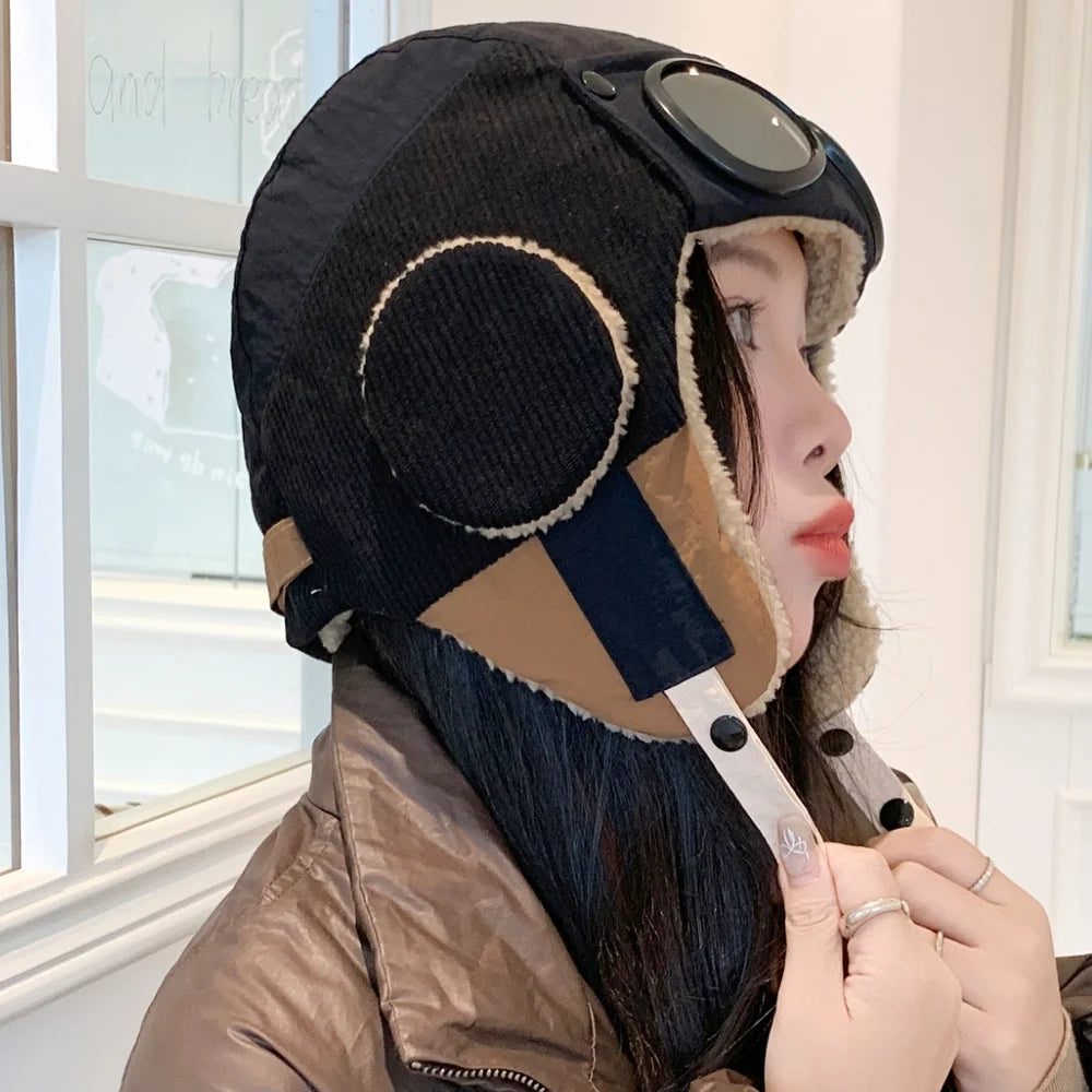Women Warm Bomber Hats With Goggles Plush Fur Winter Hat With Earflap Winter ...